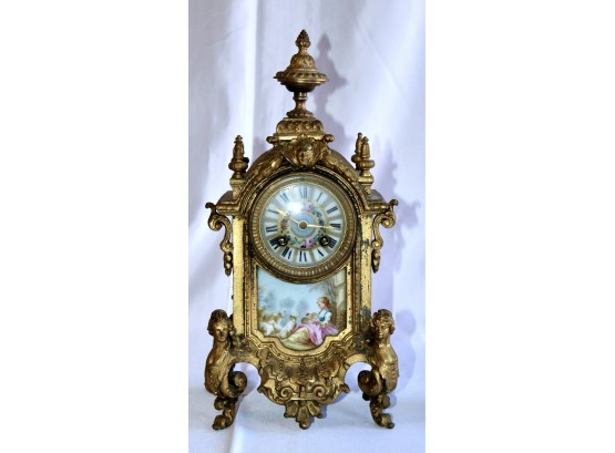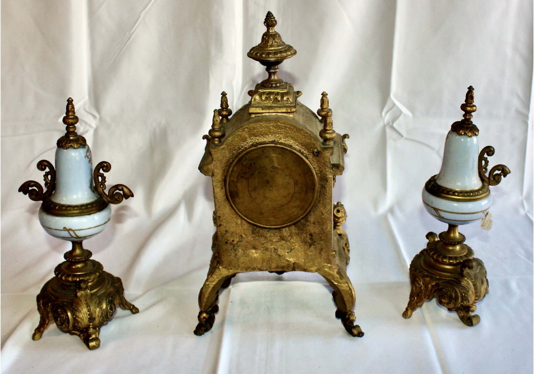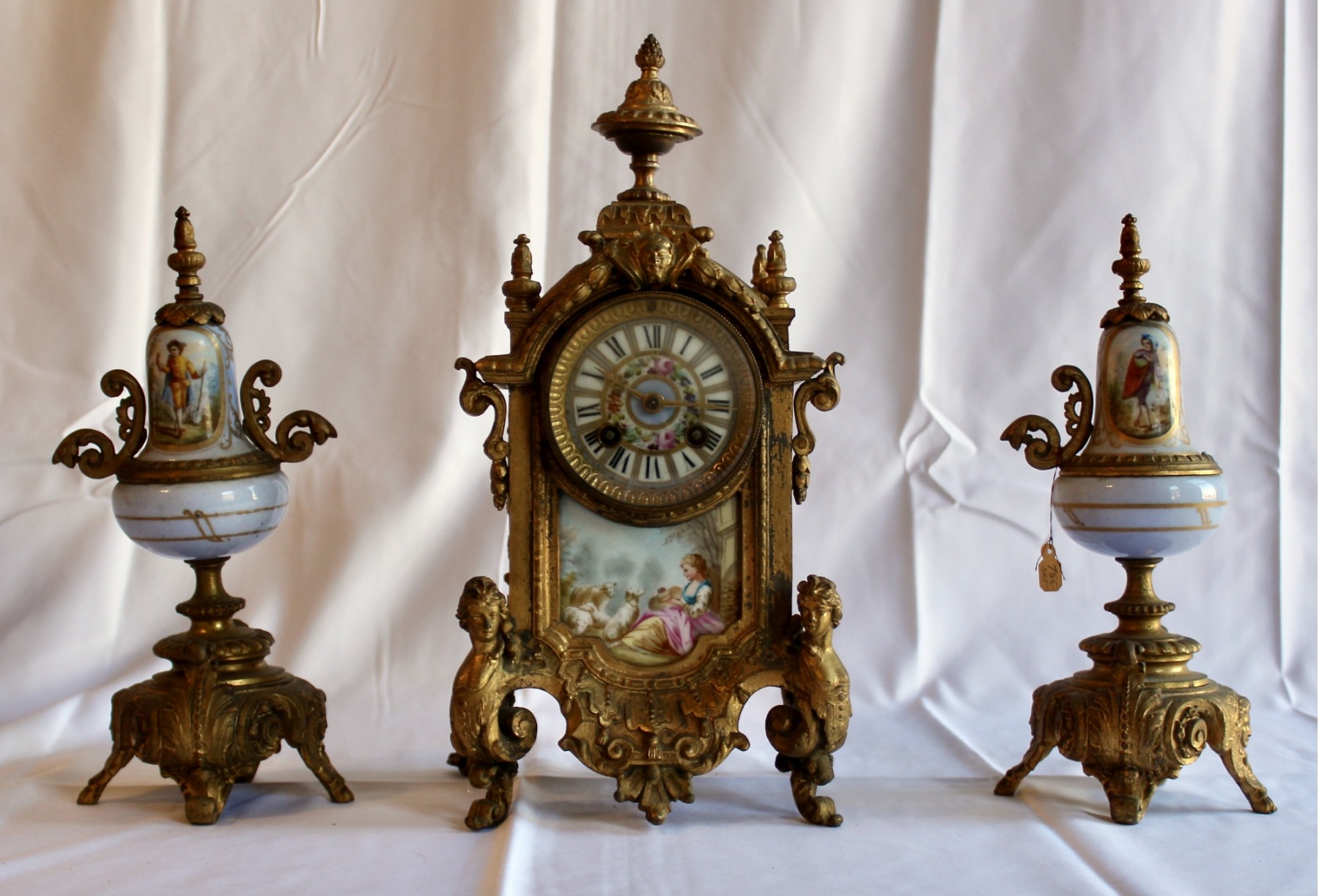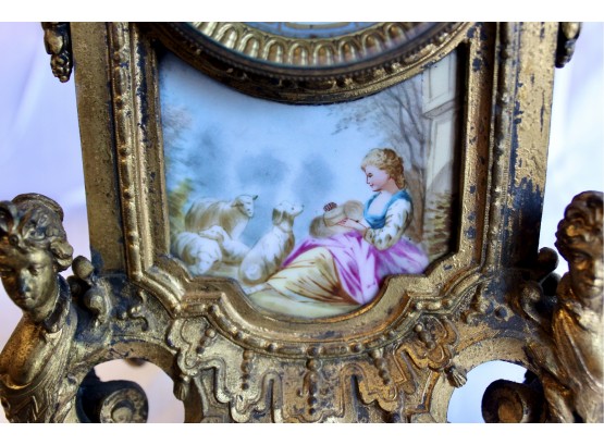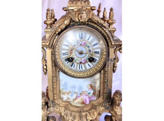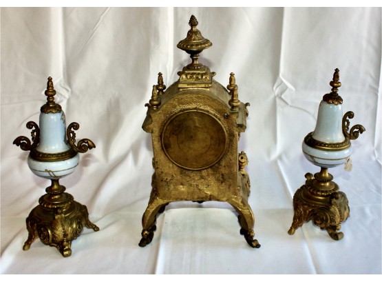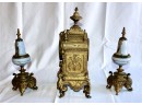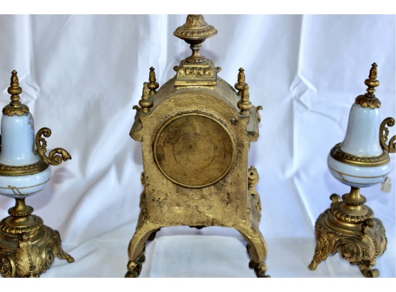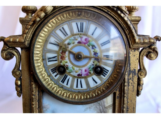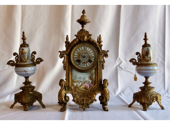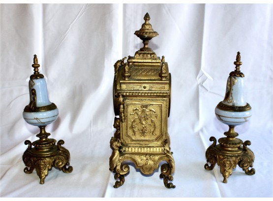 ANTIQUE RIGGS & BROTHERS CLOCK & SEVRES SET - EXQUISITE DESIGN - ORIGINAL KEY INCLUDED! Client paid about $800 for the set and paid over $200 on repairs. These pieces are truly amazing. Please note one of the Sevres is missing a handle on one side. Also, one of the Secres is loose and needs tightning. Please see pictures.