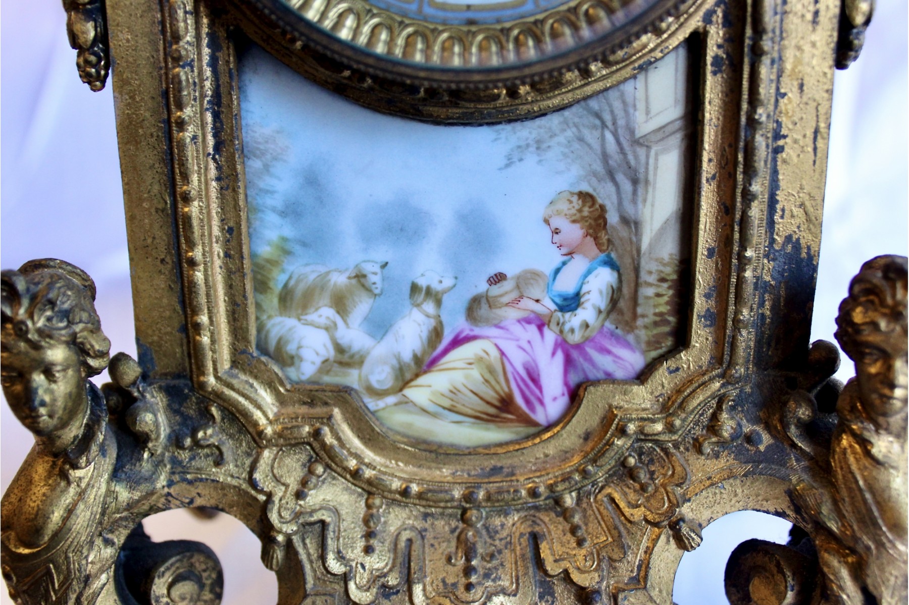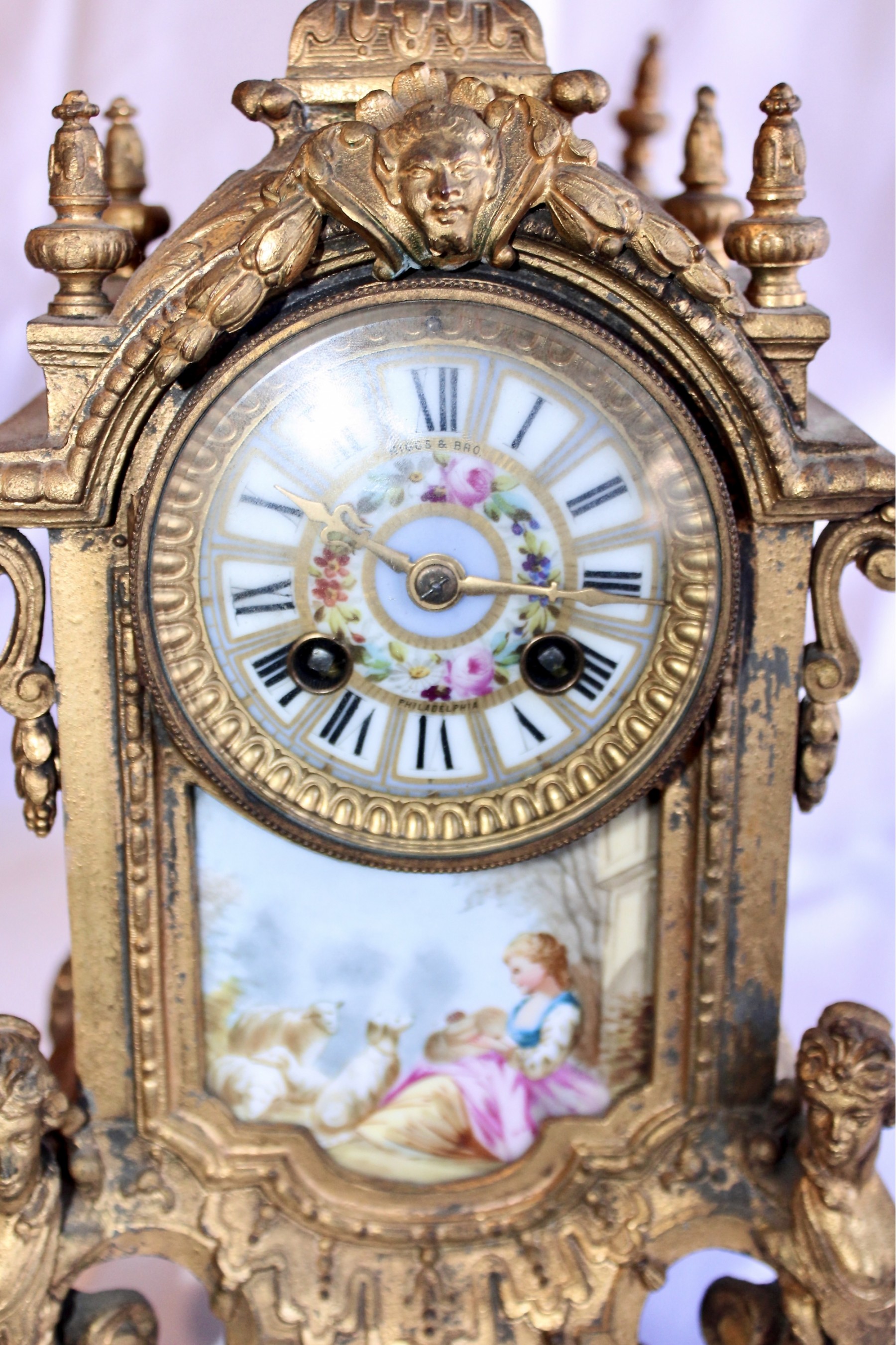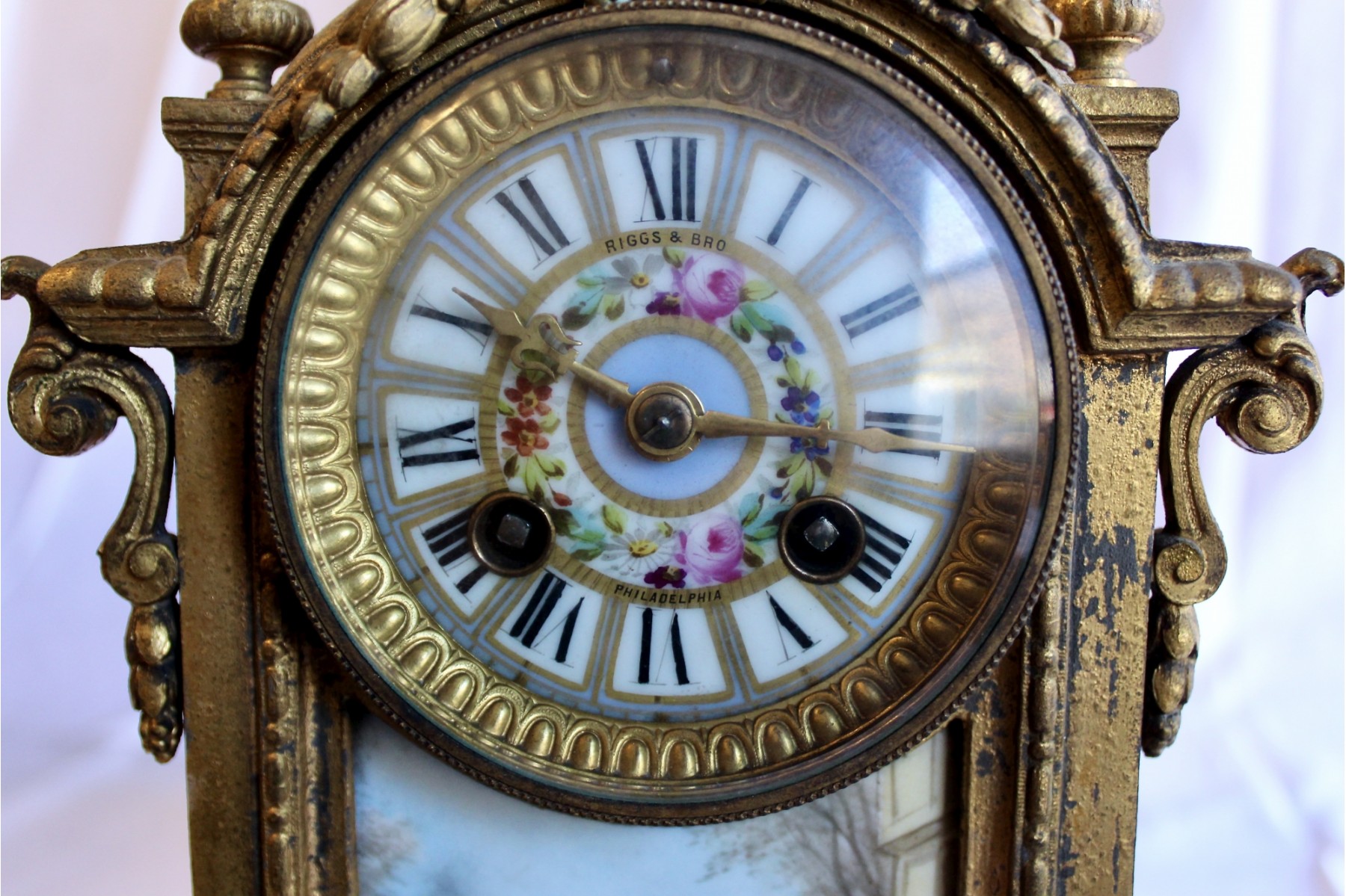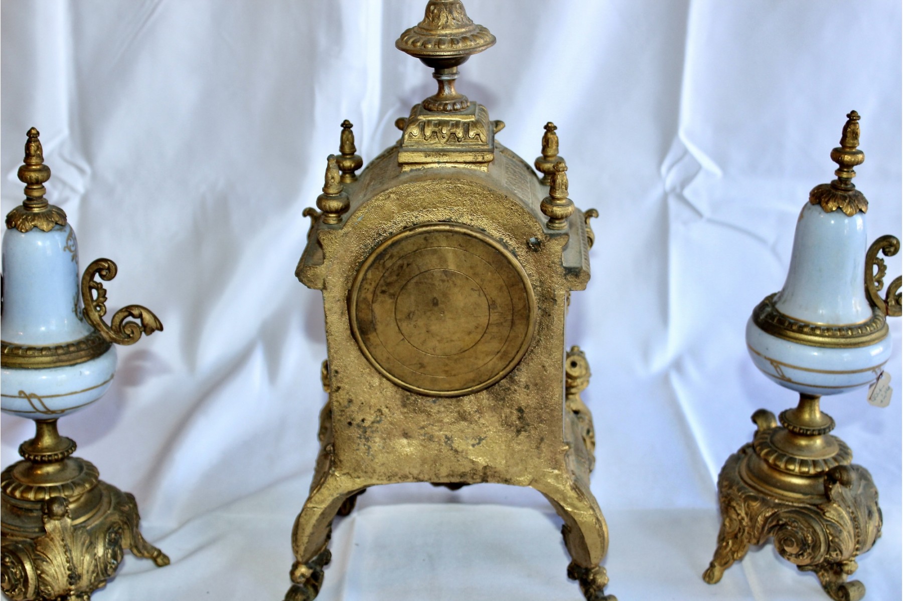ANTIQUE RIGGS & BROTHERS CLOCK & SEVRES SET - EXQUISITE DESIGN - ORIGINAL KEY INCLUDED! Client paid about $800 for the set and paid over $200 on repairs. These pieces are truly amazing. Please note one of the Sevres is missing a handle on one side. Also, one of the Secres is loose and needs tightning. Please see pictures.