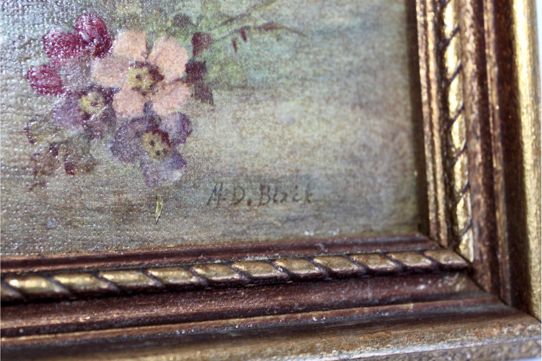 ANTIQUE SIGNED M. D. BLACK FRAMED OIL PAINTING - RARE DETAIL!