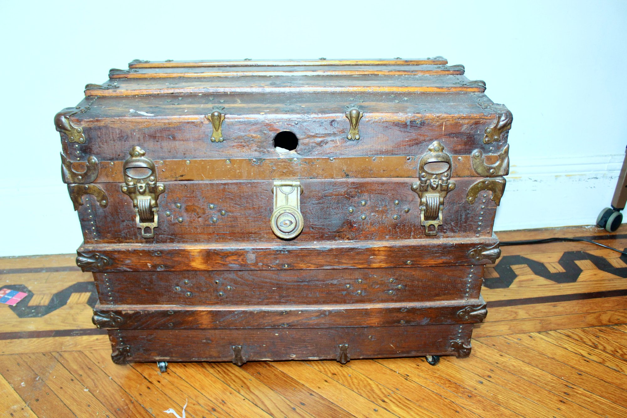 ANTIQUE WOOD CHEST - METAL DETAILS - LEATHER SIDE STRAPS - INSIDE COMPARTMENTS - WHEELS - ITEM#24 RM4