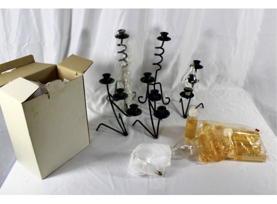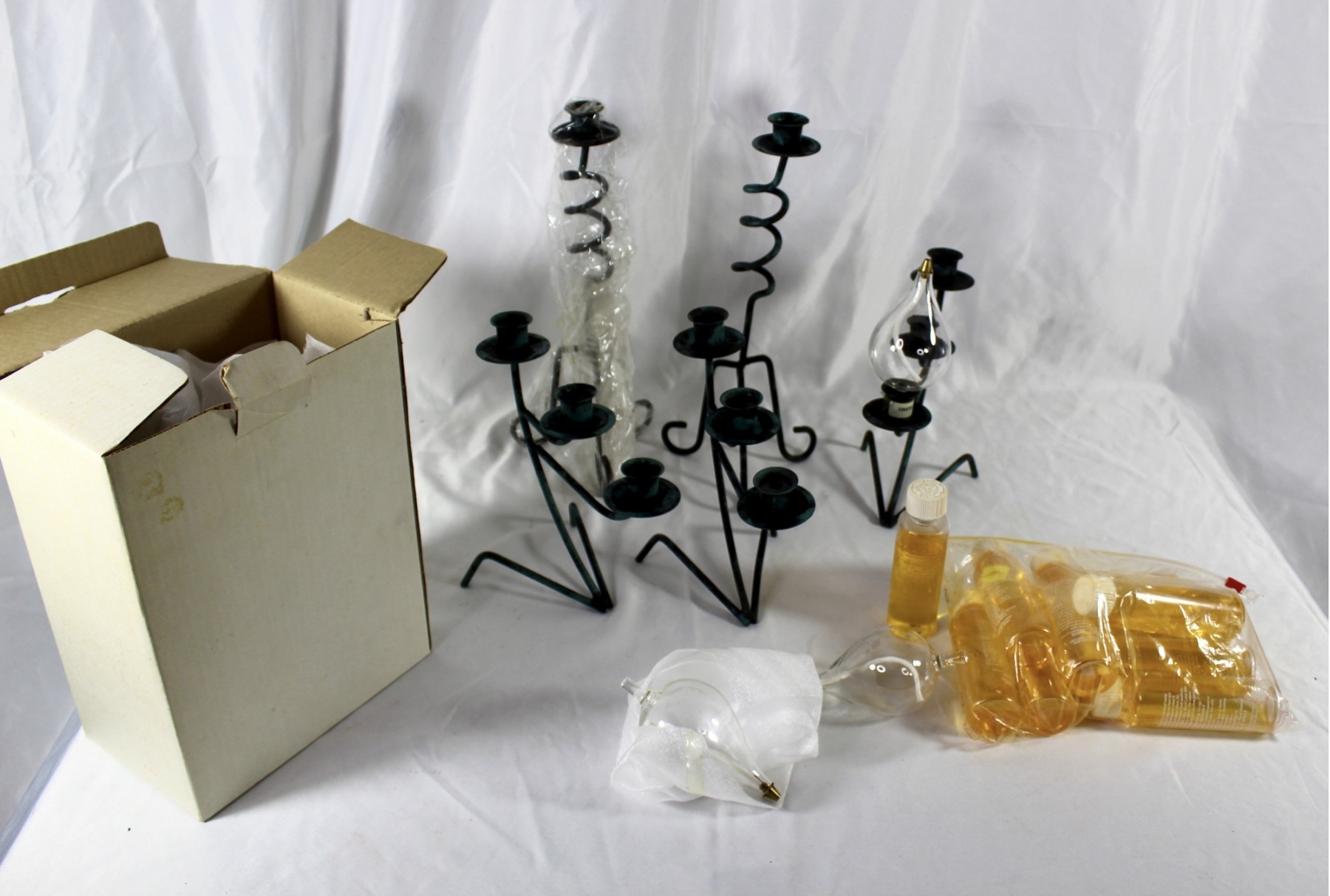 Pretty oil candle lamps with many bottles of oil and unique glass bulbs.