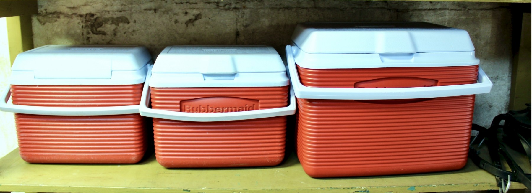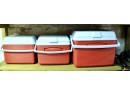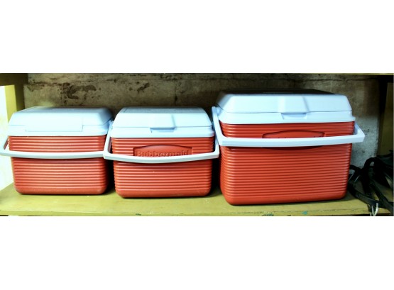 COOLER LOT - 3 Rubbermaid Red Coolers & 1 Giant White Cooler - GREAT FOR TRAVEL!!