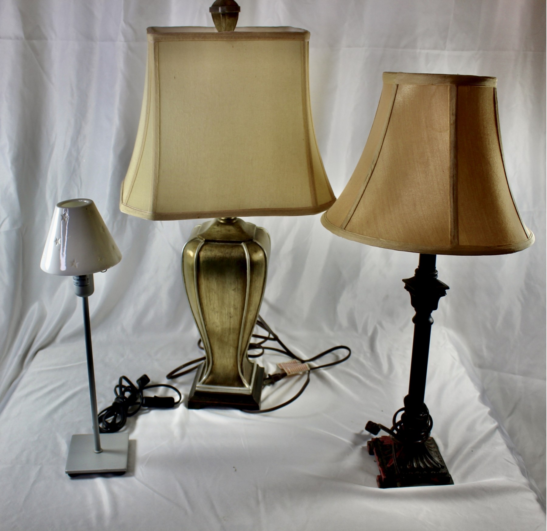 Fabulous mix of table lamps. The gold lamp does not work. The black lamp has paint chipping. the smaller one is Ikea.