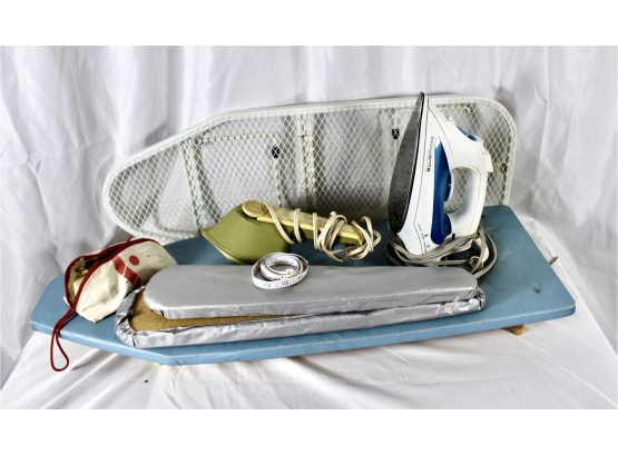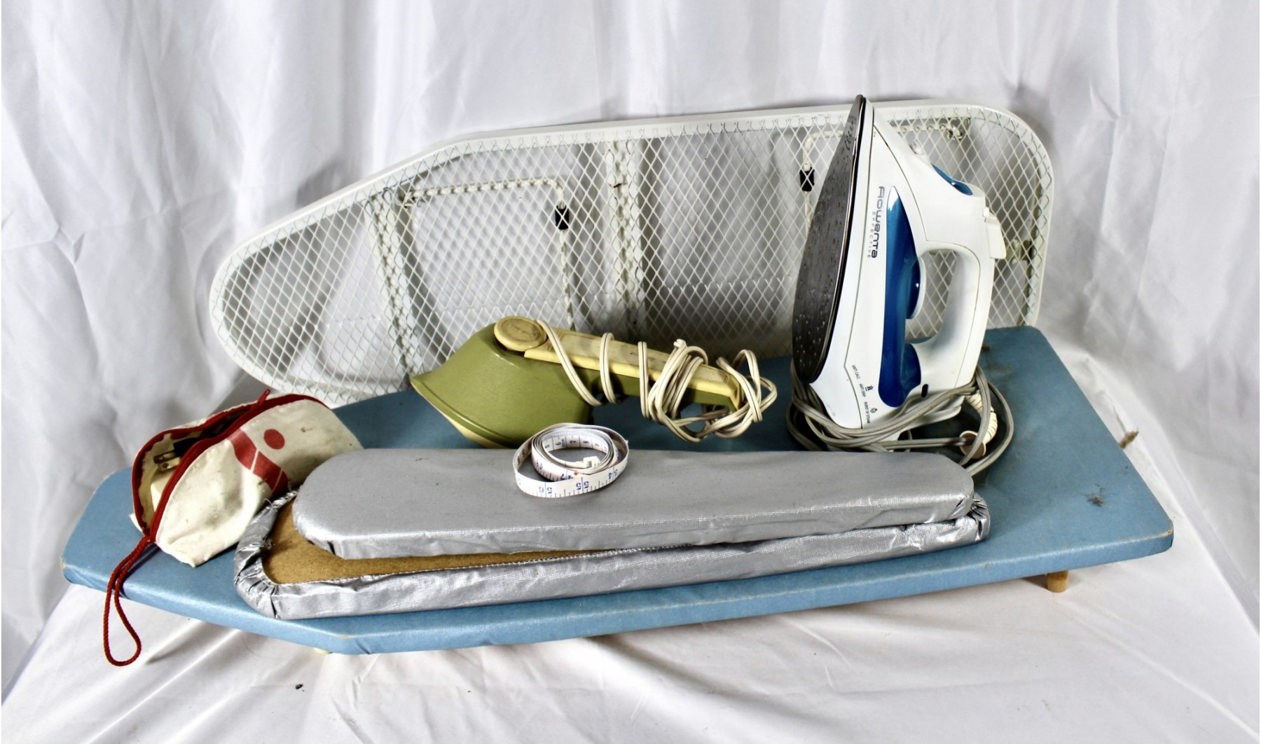 This collection has a Rowenta Iron, a sleeve board, 2 ironing boards, a vintage portable steamer, a vintage steamer and a measuring tape.