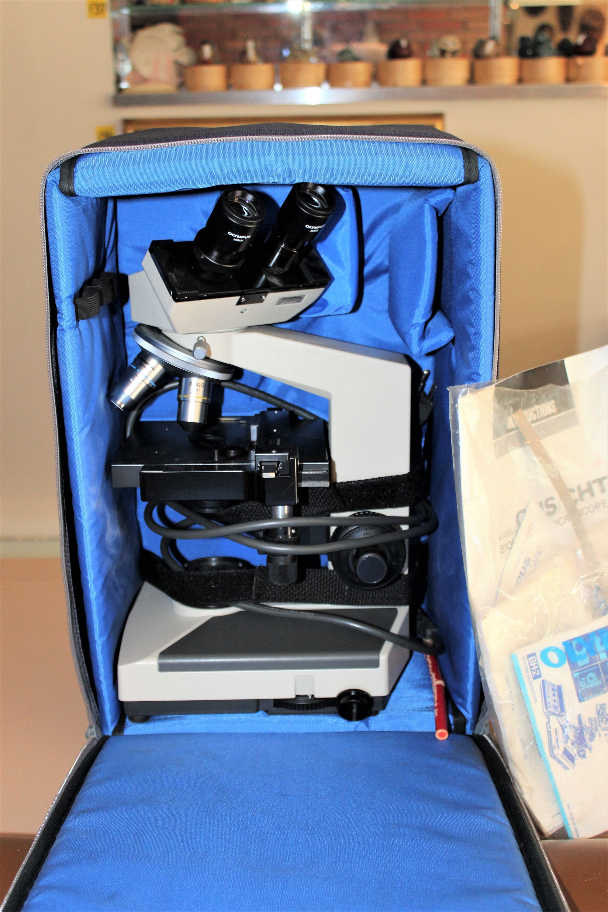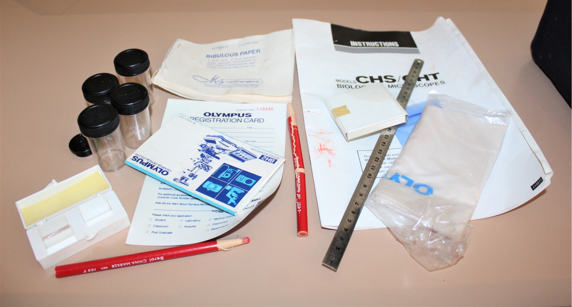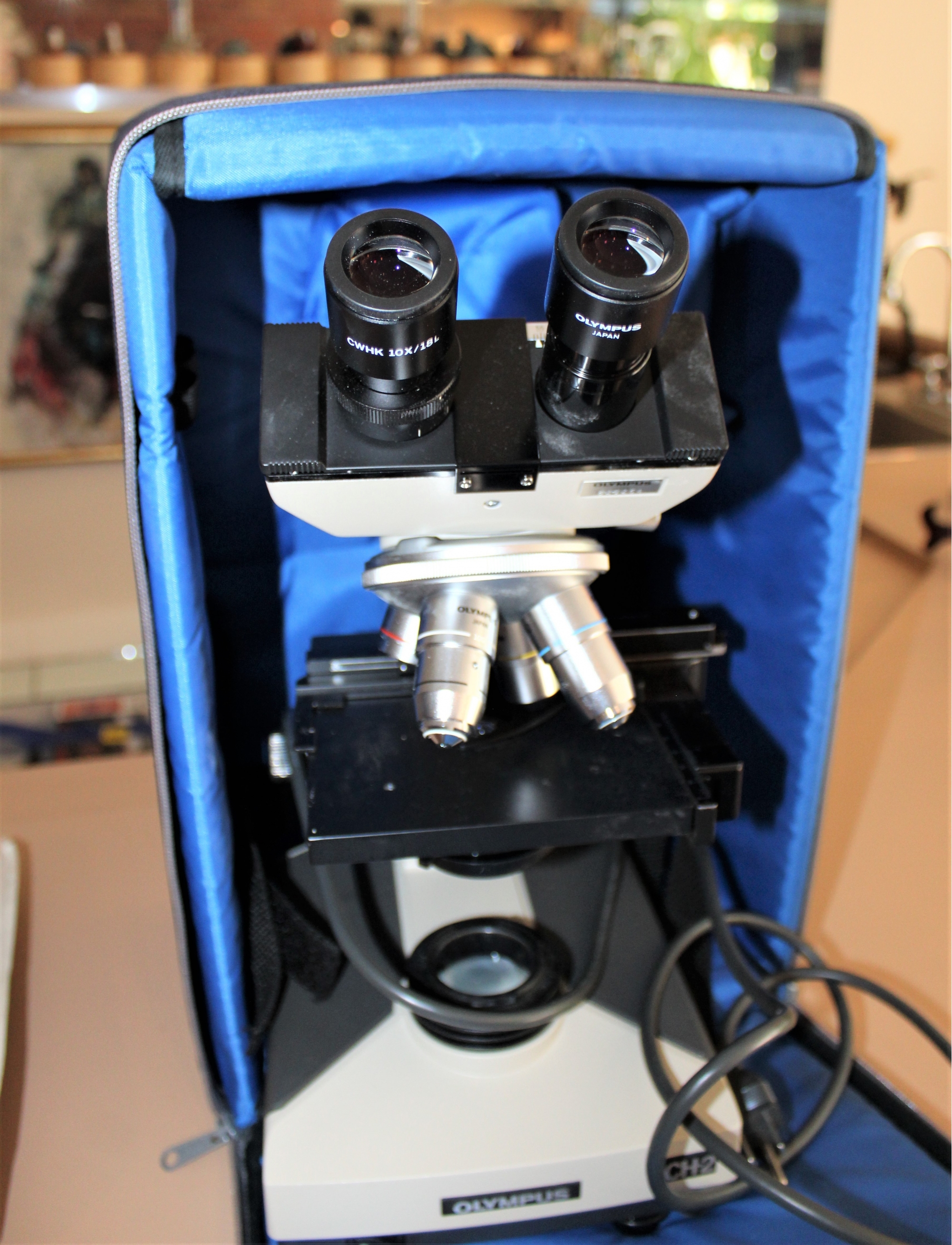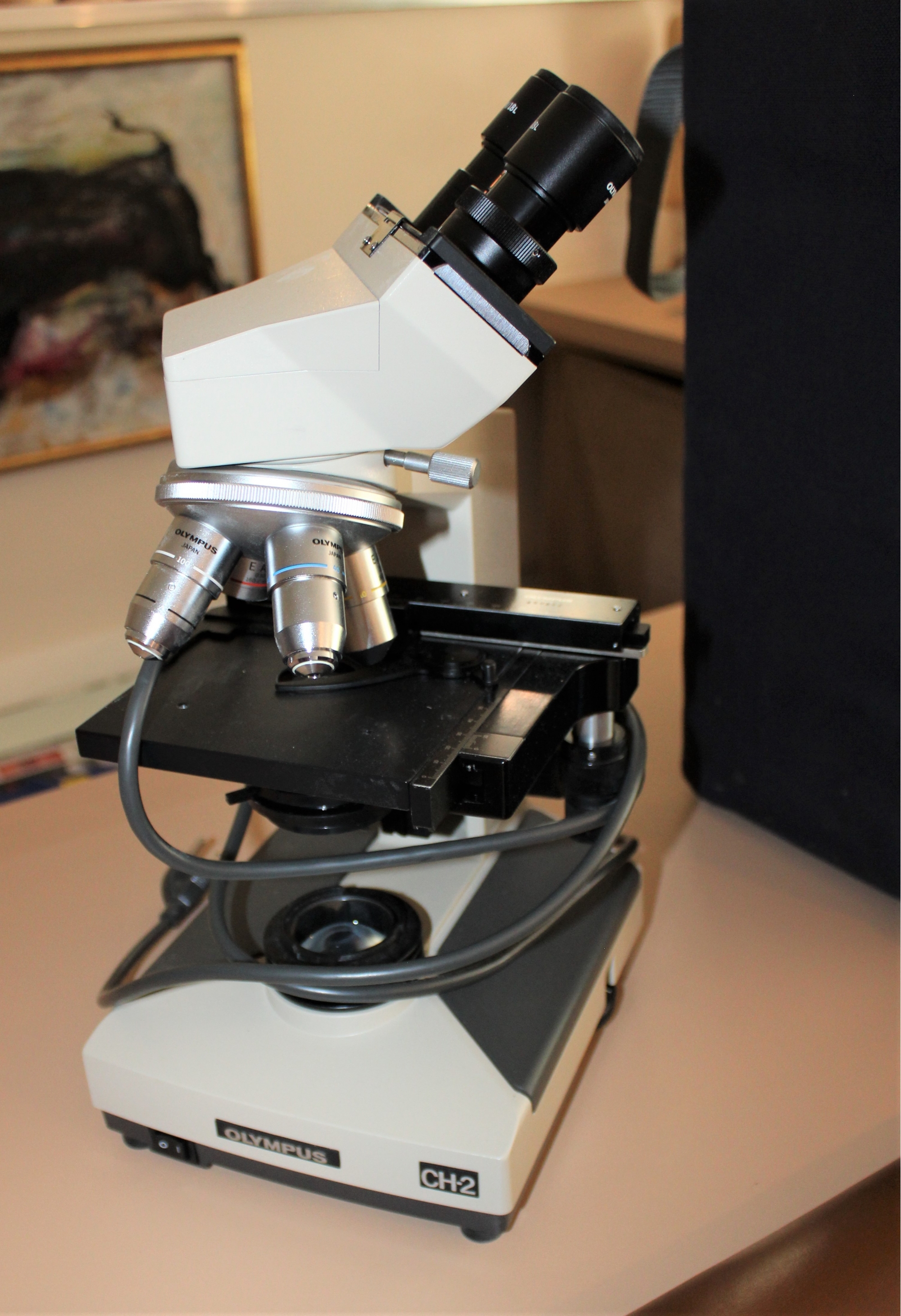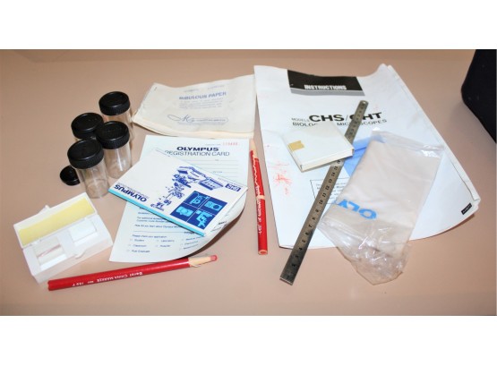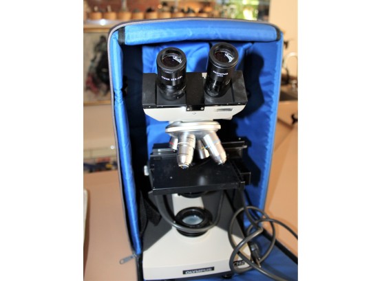 Vintage OLYMPUS CH-2 Binocular Microscope 4x, 10x, 40x, 100x Objectives - BARELY USED!! Microscope turns on when plugged and lamp works; Comes with Original carrying case, manual and extra slides and more! Other than knowing the microscope turns on and lamp works, item is untested but owner informed us her daughter only used it a few times for her medical class.