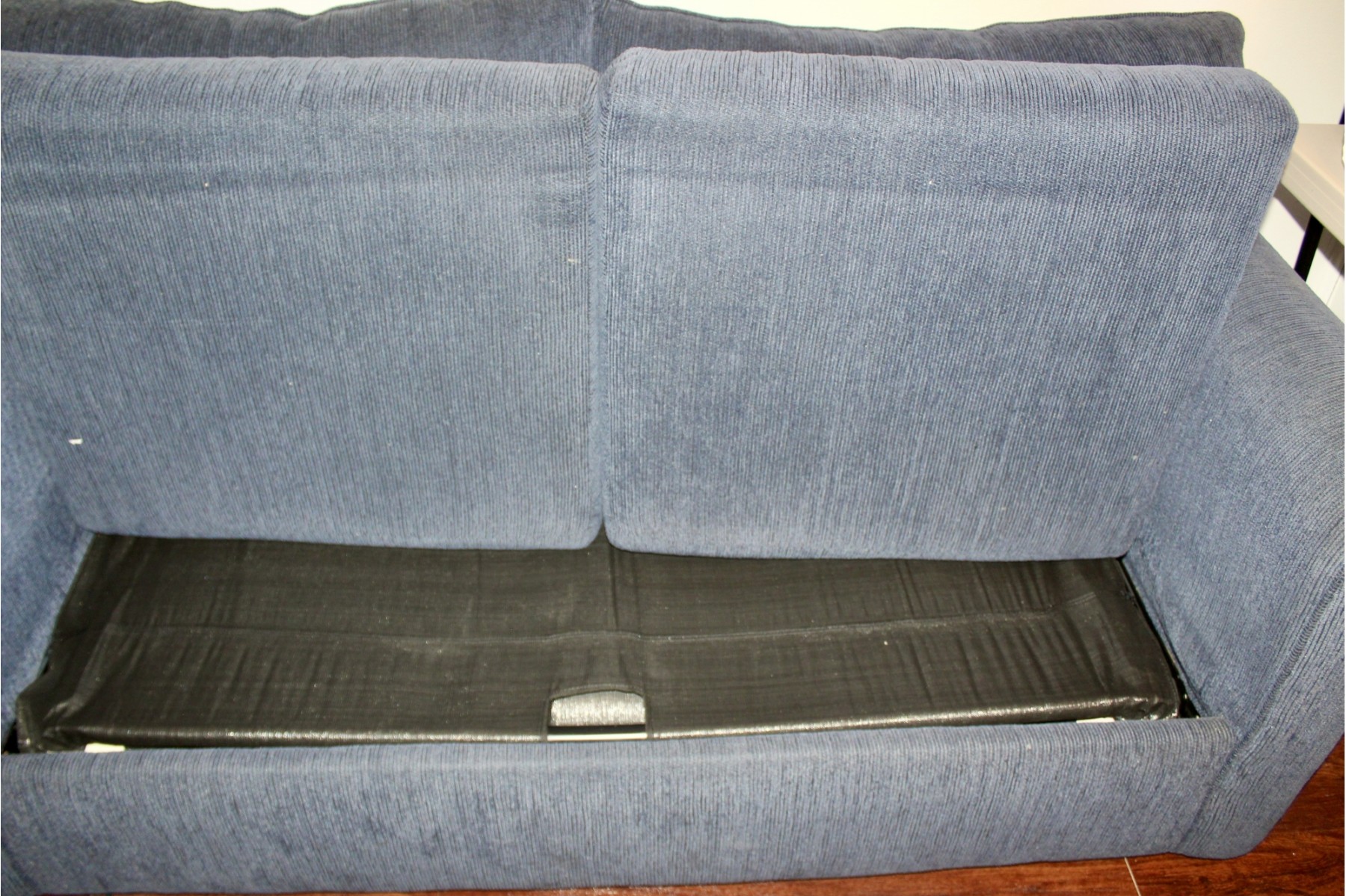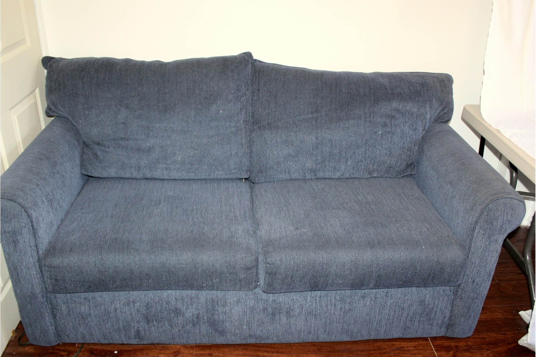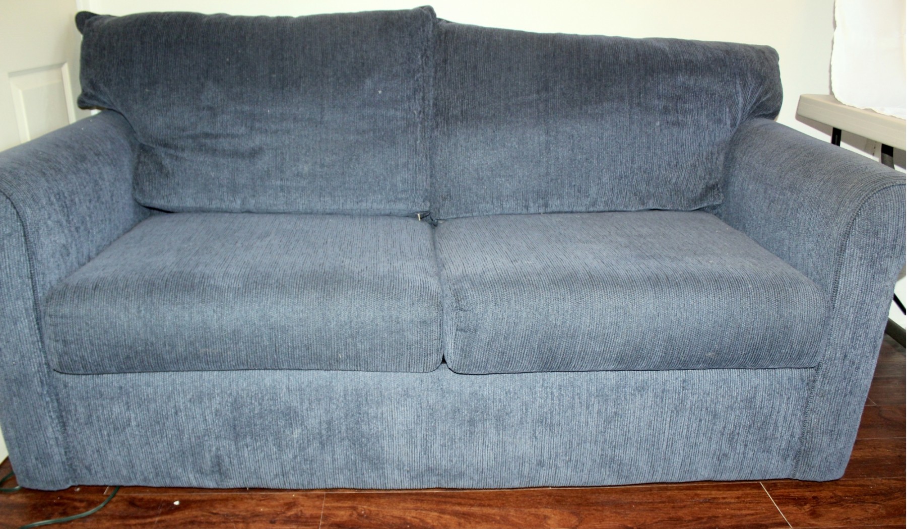 Condition: Good Condition; Couch fabric has some stains, needs cleaning or to be reupholstered.