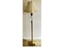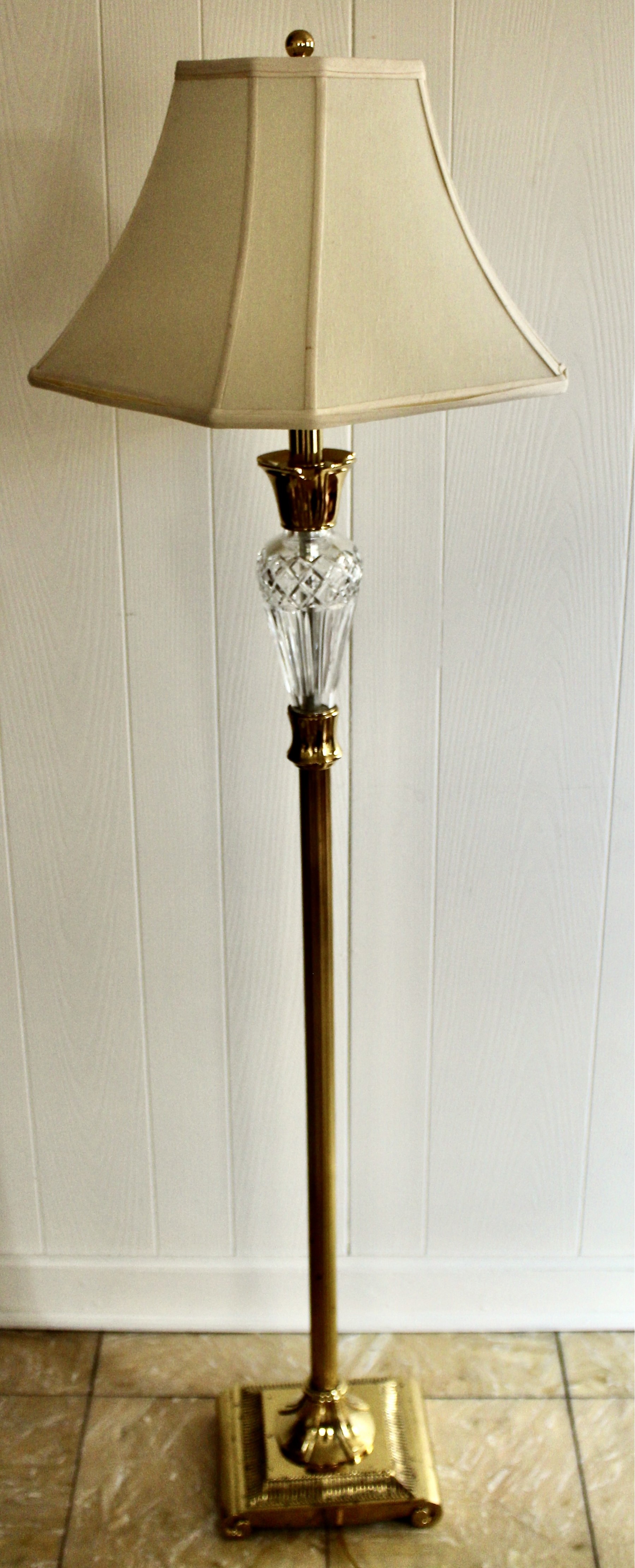 WATERFORD Crystal Brass Pole Floor Lamp W/ Original Lamp Shade - VERY CLASSY & WORKS!! Lamp shade has small damage, shown in pictures. The fabric is lifting a bit on bottom of shade.