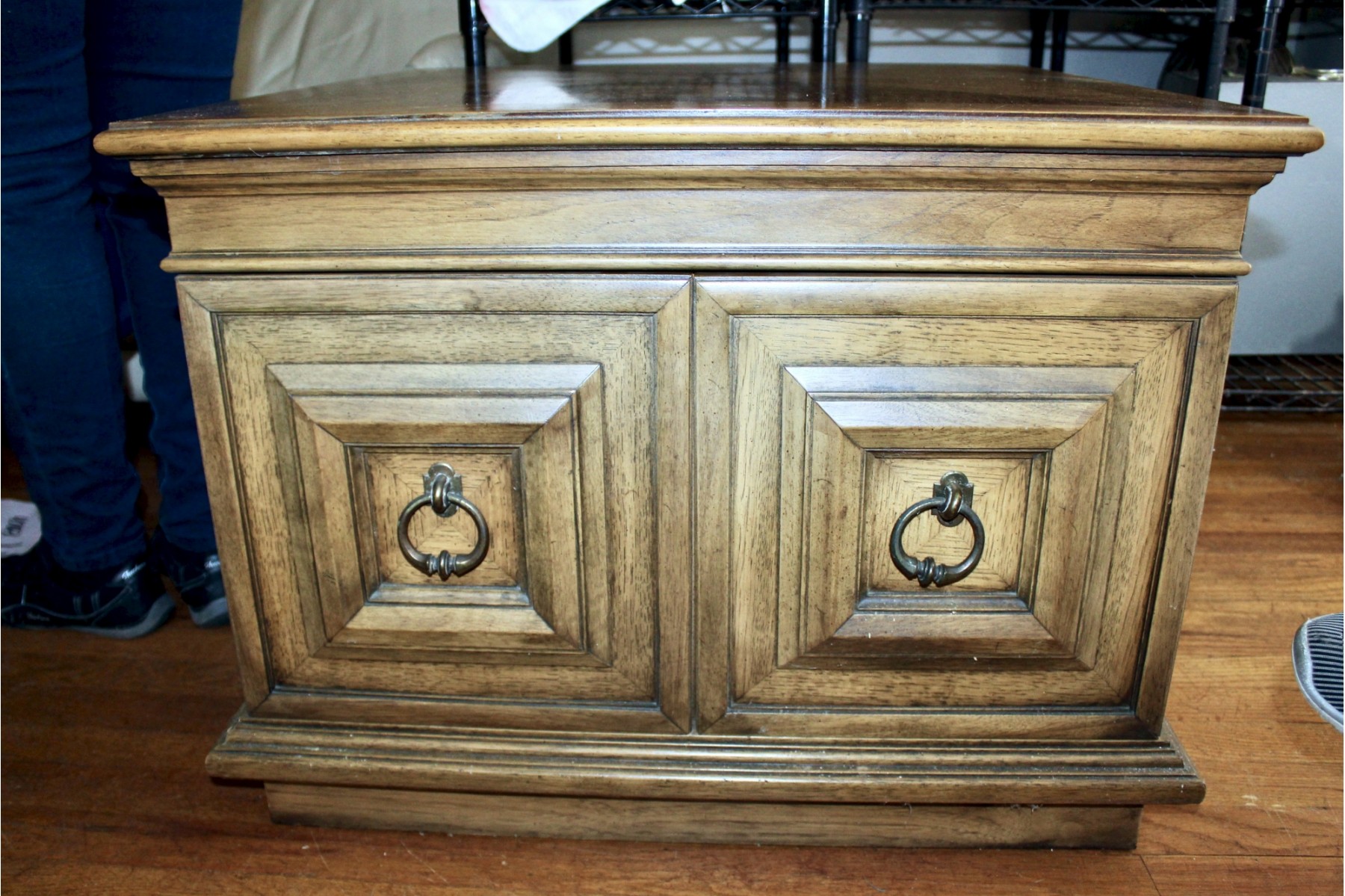 Great end table for any room in your home. Two doors for storage with metal knockers.
