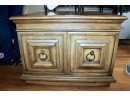 WOOD END TABLE - TWO STORAGE DOORS - BROWN - METAL KNOCKERS ACCENT!!