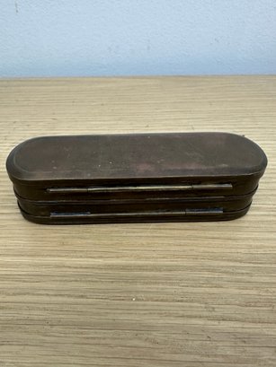 The object in the image is likely an antique brass tobacco or snuff box, possibly from the 18th or 19th century.