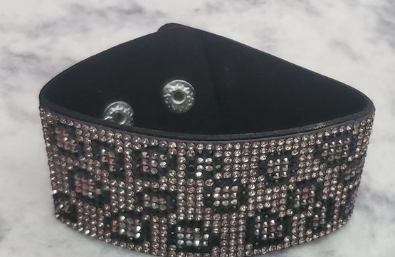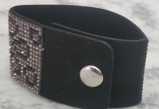 Add instant sparkle and attitude to your outfit with this black suede rhinestone cuff bracelet. The soft, flexible suede band is embellished with hundreds of shimmering silver and gunmetal crystals in a geometric pattern that catches the light from every angle.