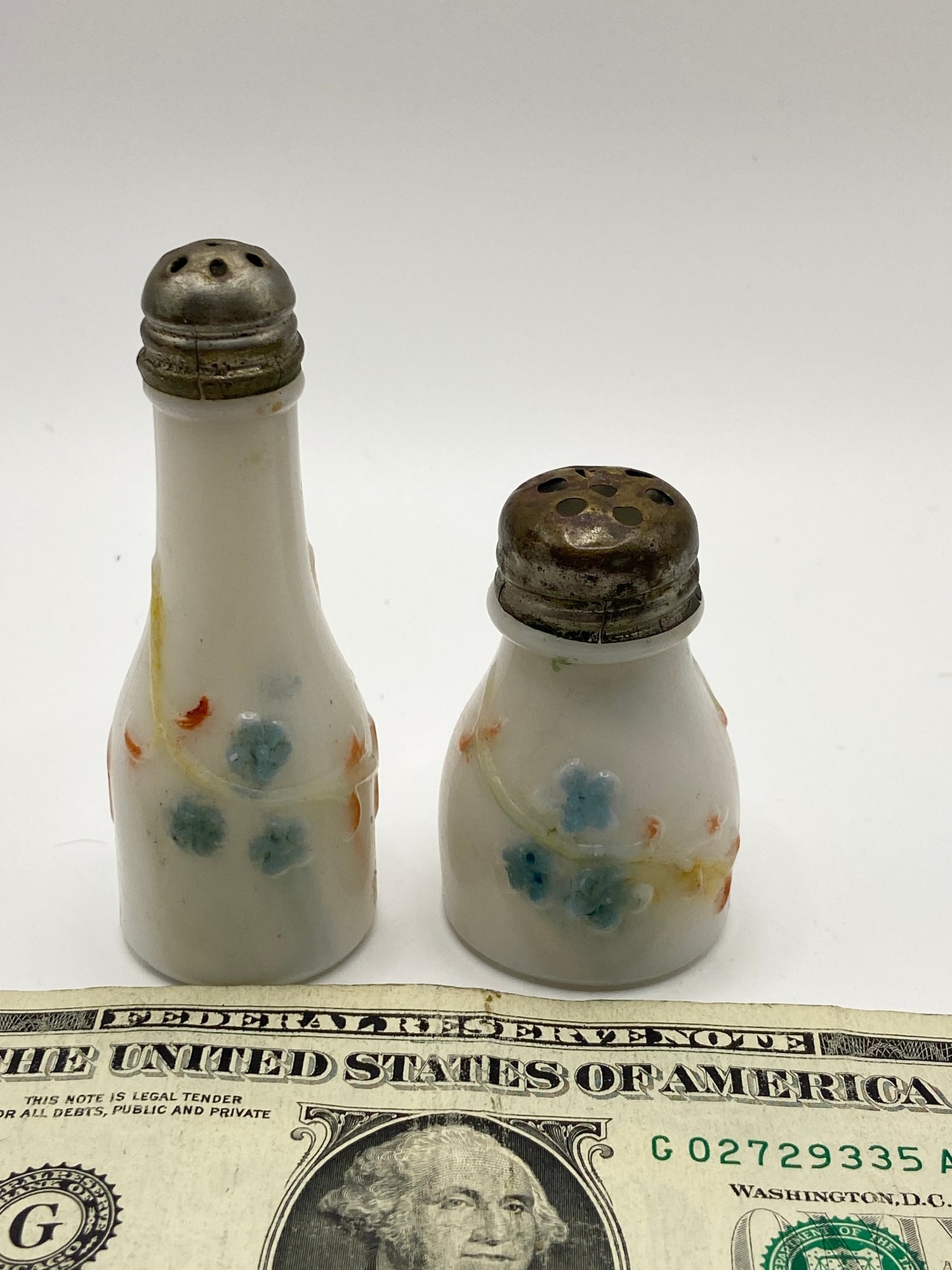 1895? Milk Glass Forget-me-not Salt And Pepper.
