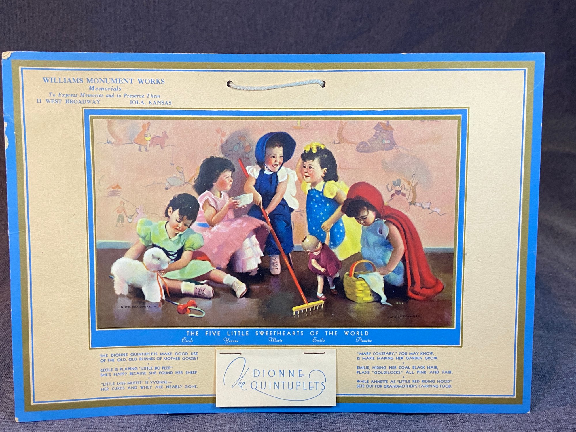 1938 Advertising Calendar With Precious Art! Dionne Quintuplets