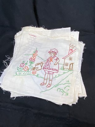 The actual embroidered part is about 8x8" but each has a border so you can quilt them. A mother Goose theme. SO SO SO amazing.