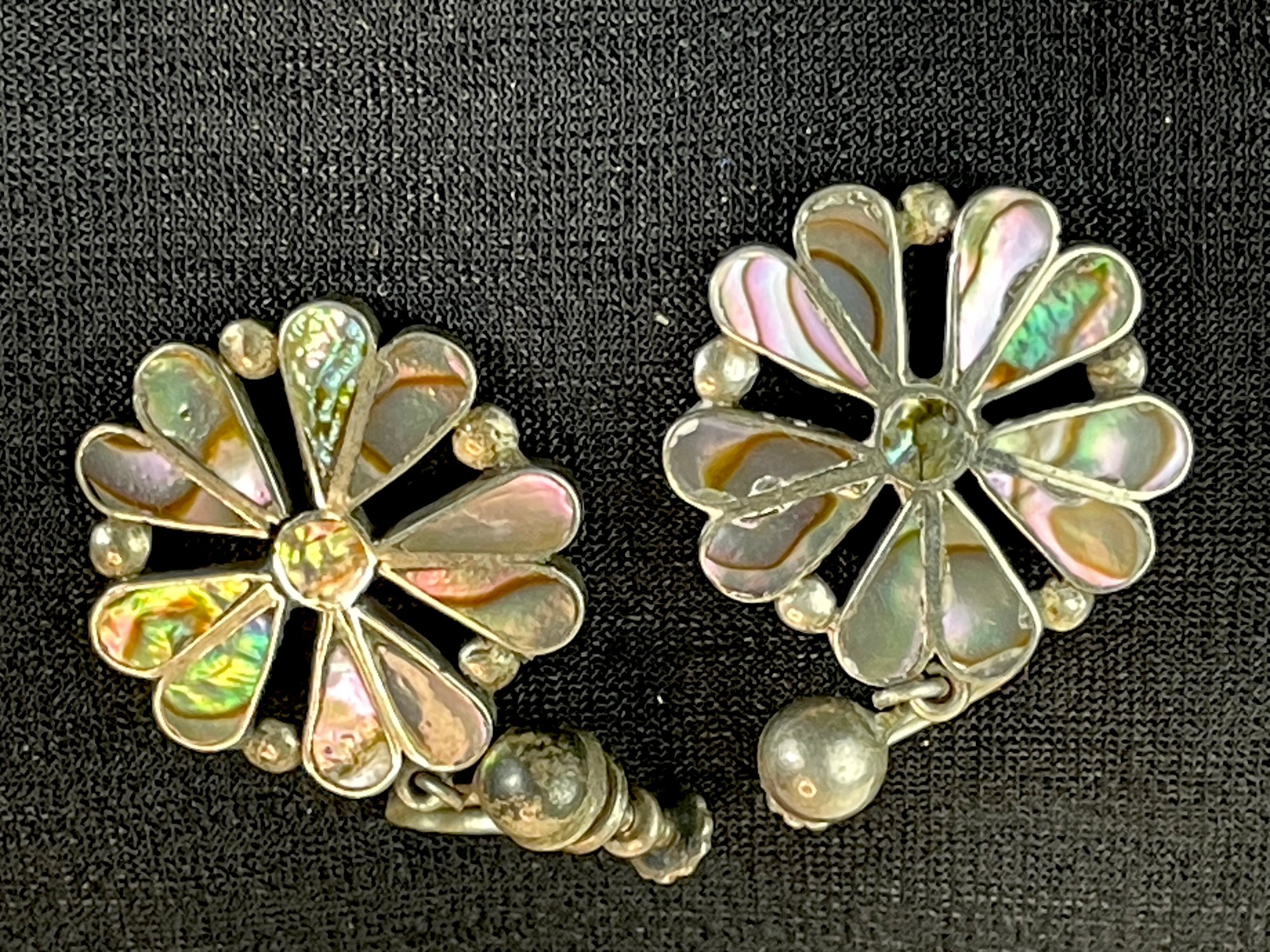 .Pair Of Screw Back Sterling Silver ABALONE Inlay Dangle Earrings