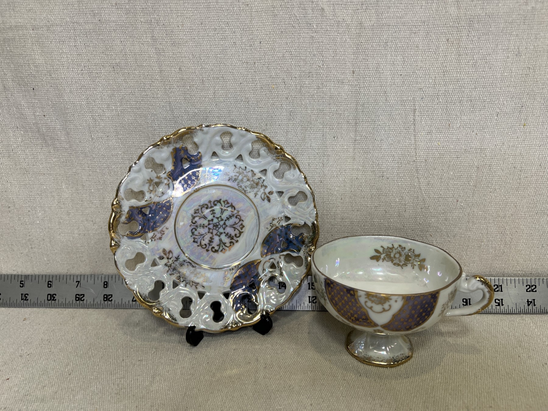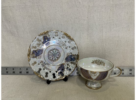 Blue, Gold, & White Unmarked Teacup & Saucer