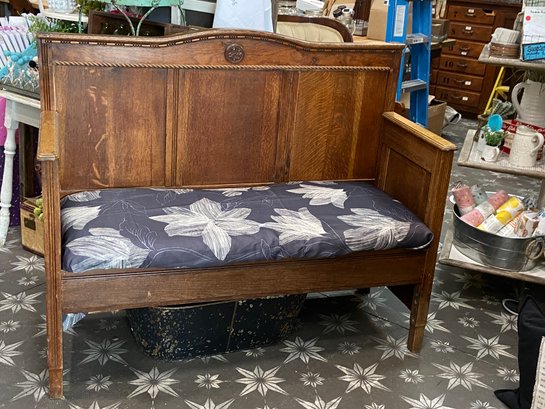 The fabric on the cushion is just covering the red one that is currently on it. you can have the fabric and cover it yourself with a staple gun or keep the red. This is gorgeous wood and quite a little showpiece. On Display at Magpies if you wanna take a look. 52" wide , 20" deep, 18" seat to floor without cushion, 42" back to floor
