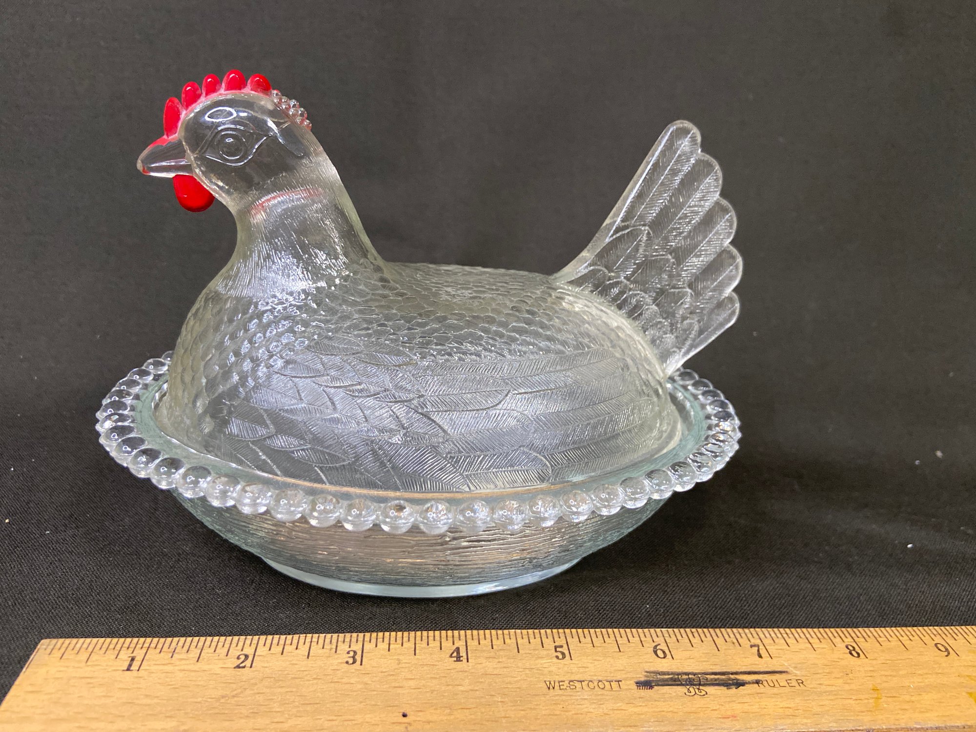 Indiana Glass Clear Hen With Red Comb And Waddle. Covered Dish