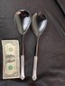 Pair of vintage salad serving spoons with sterling silver handles by Oneida in the Damask Rose pattern. Black melamine serving spoons with sterling silver handles. Each is marked "Sterling Handle". Weight 4 oz for pair
