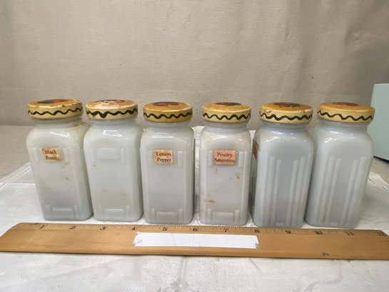 All are screw on lids. The labels are all just glued on paper. I'd give them a good wash and take off the old tags. Six Milk Glass Vintage Spice Jars With Handpainted Lids