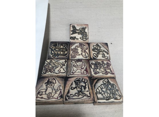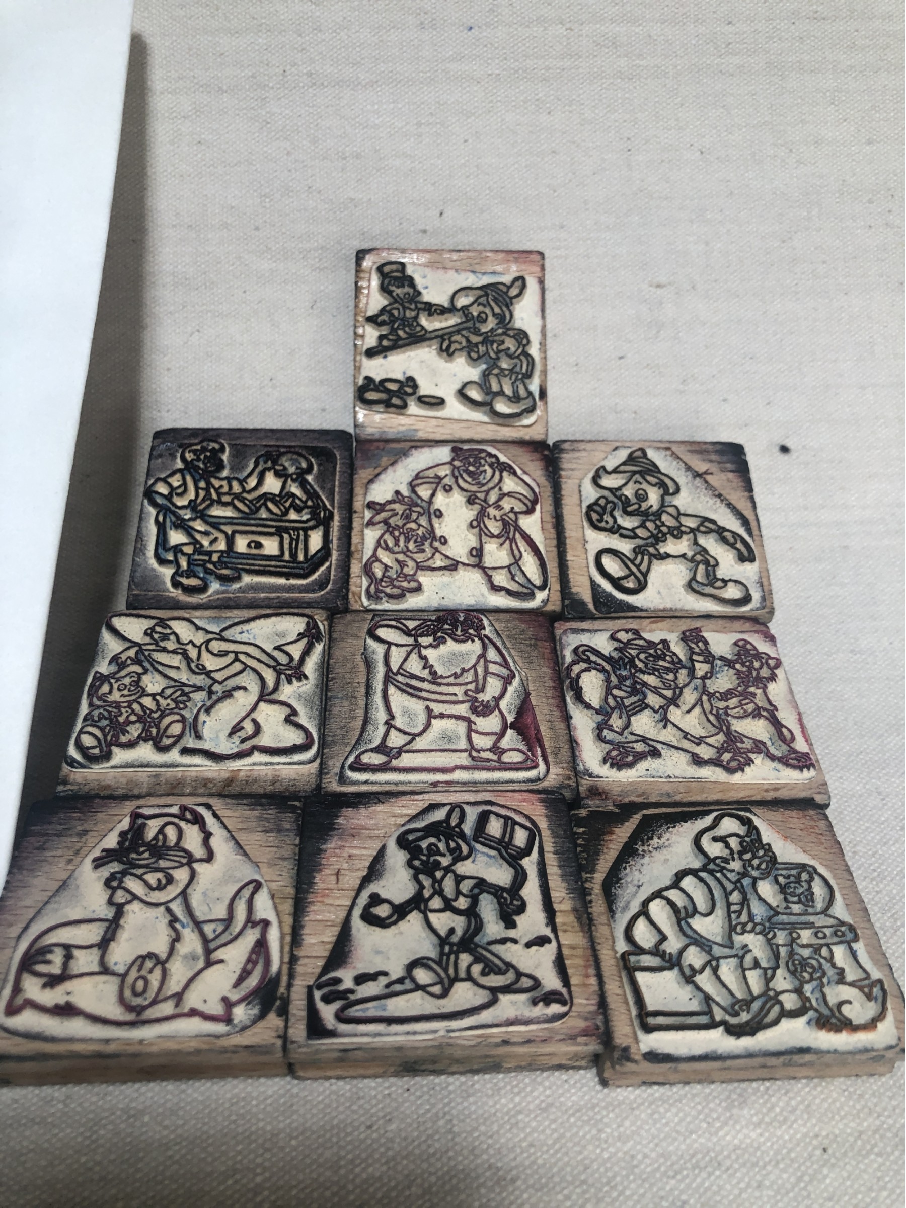 These are fun! Incredible authentic Disney wooden stamp set of characters/scenes from the Disney Pinocchio movie! Our stamp pads were kind of dry, but the stamps work very well! Used but in great condition and believed to be the complete set, which is difficult to find. Please see photos.