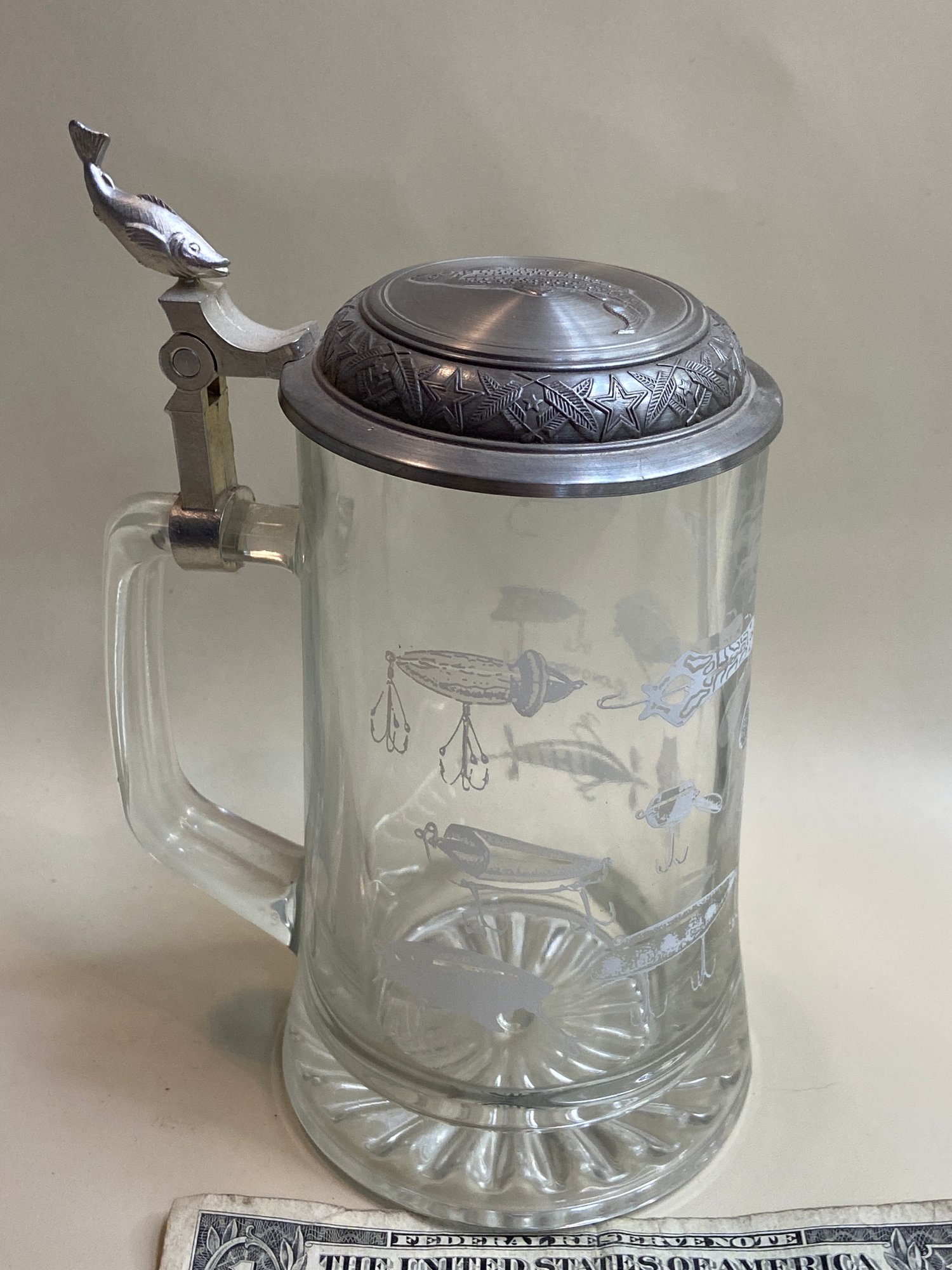 Vintage Glass Stein With Fishing Lures Etched On Outside
