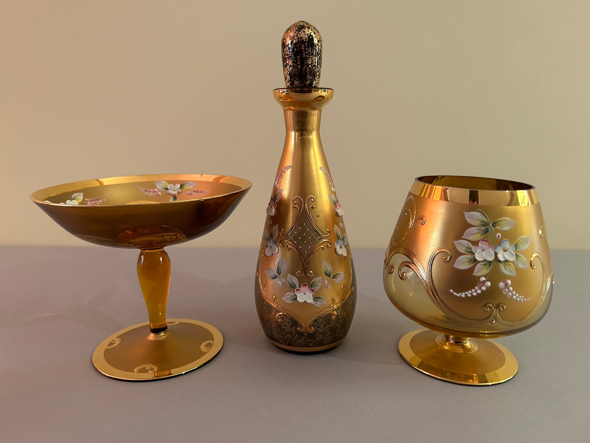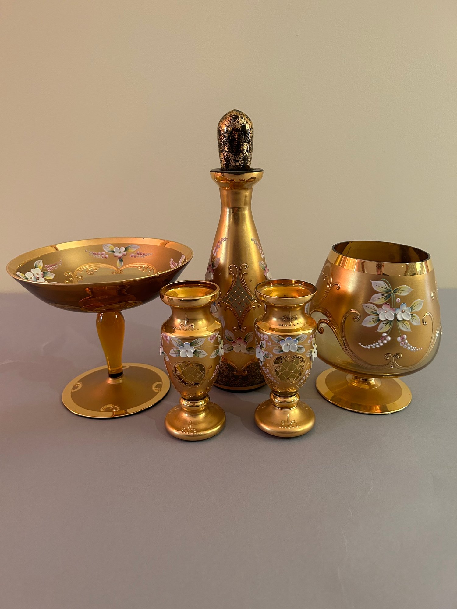 11 hand painted glass gold with floral decorations. Decanter with six matching shot glasses, footed, vase, two urns and brandy snifter. Excellent condition largest height 10 inches