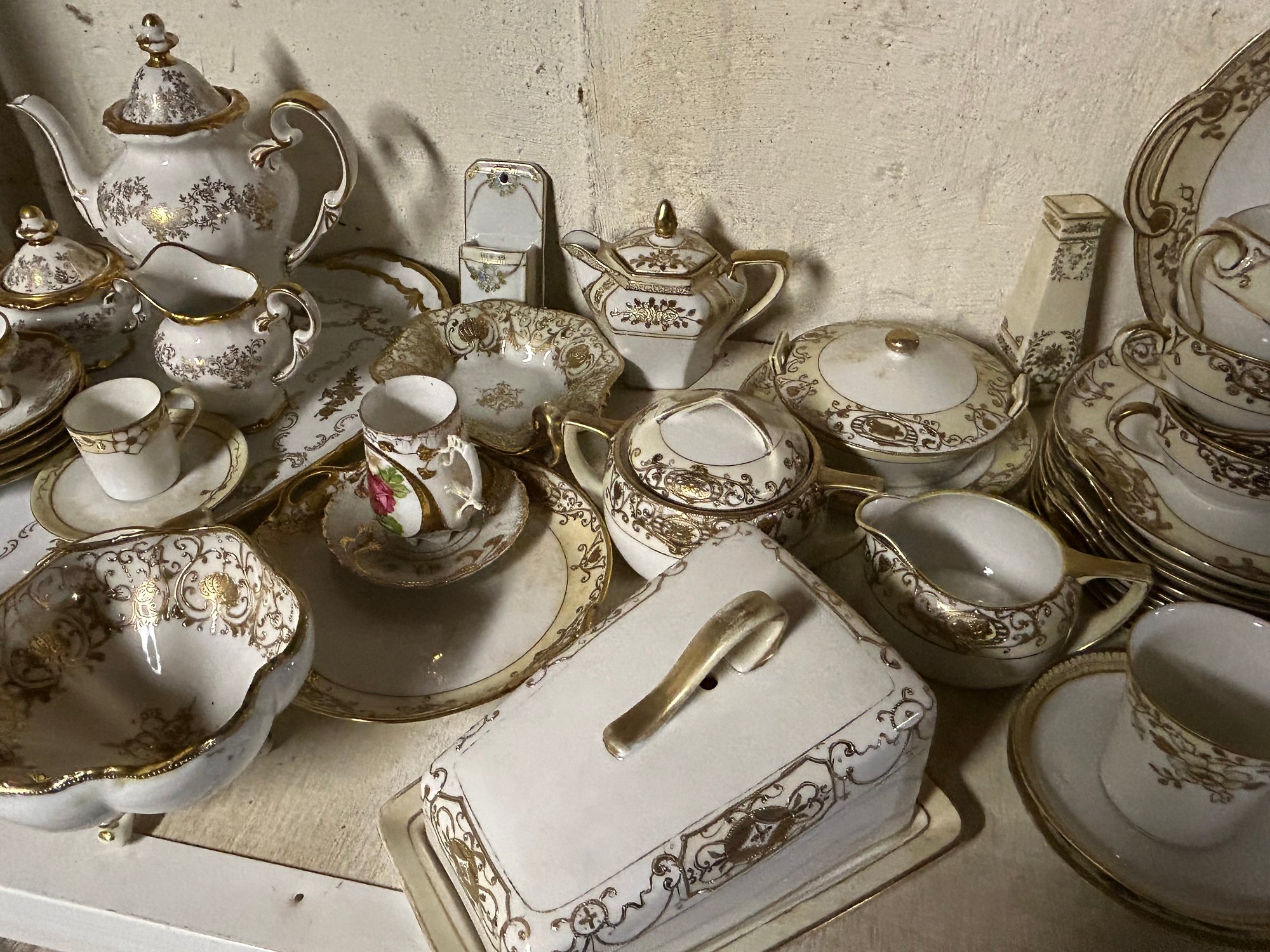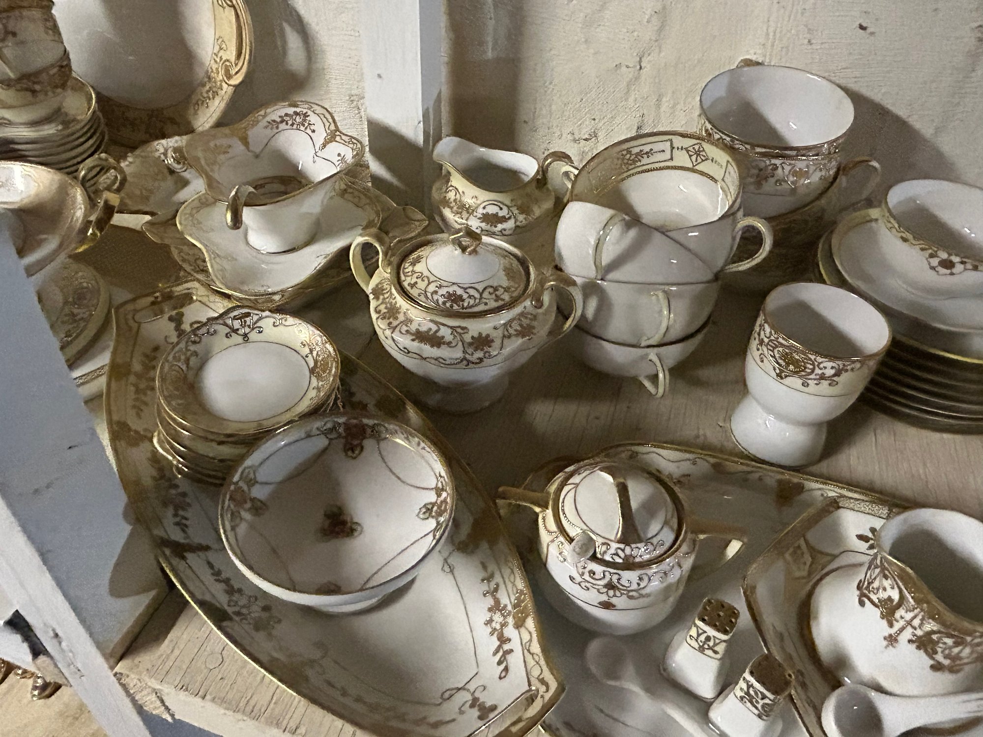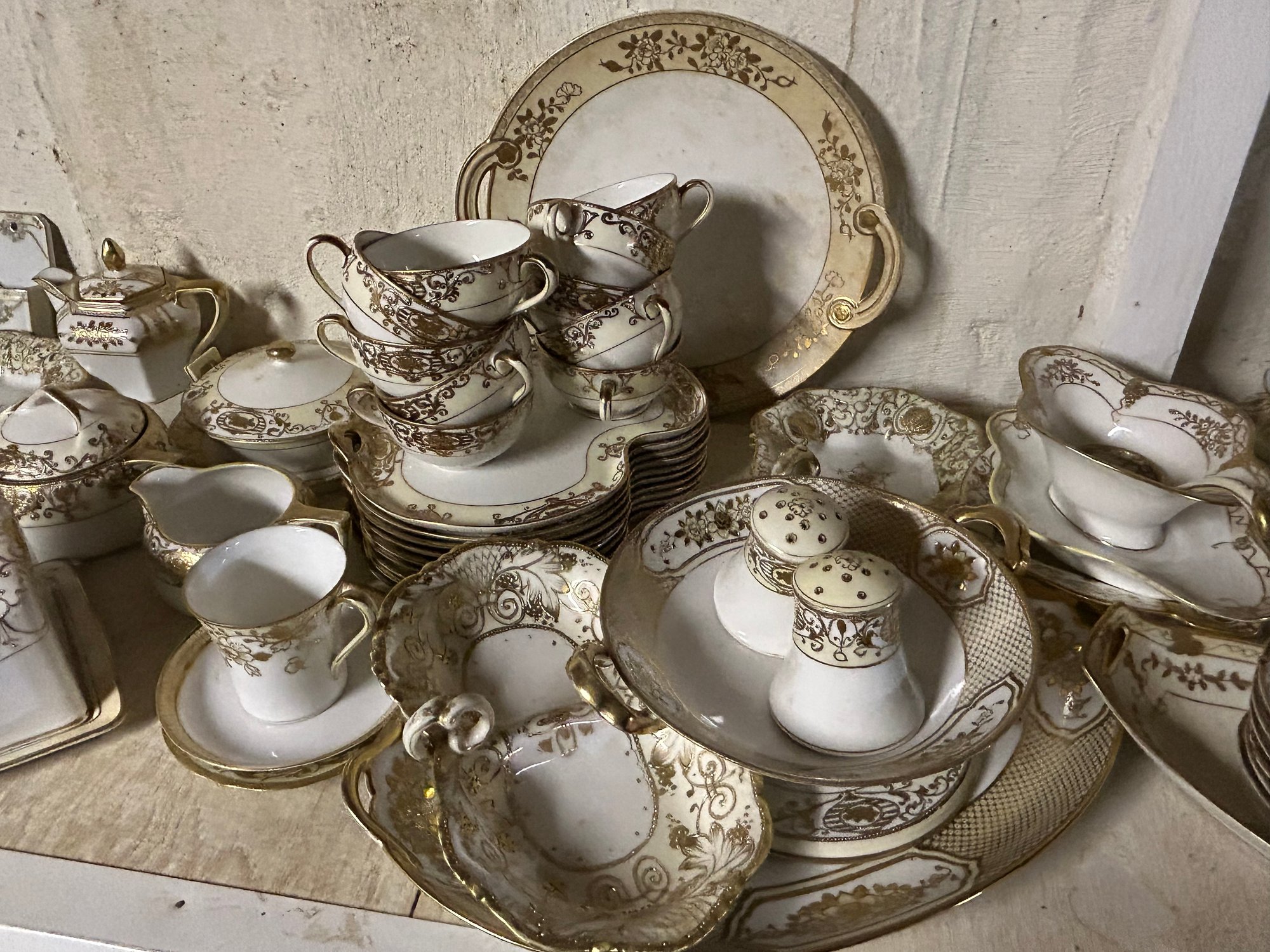 110+ pieces of Nippon Noritake and other China. White background, gold decoration. Includes cups, saucers, teapot, sugars, creamers, multiple serving pieces, luncheon set etc.