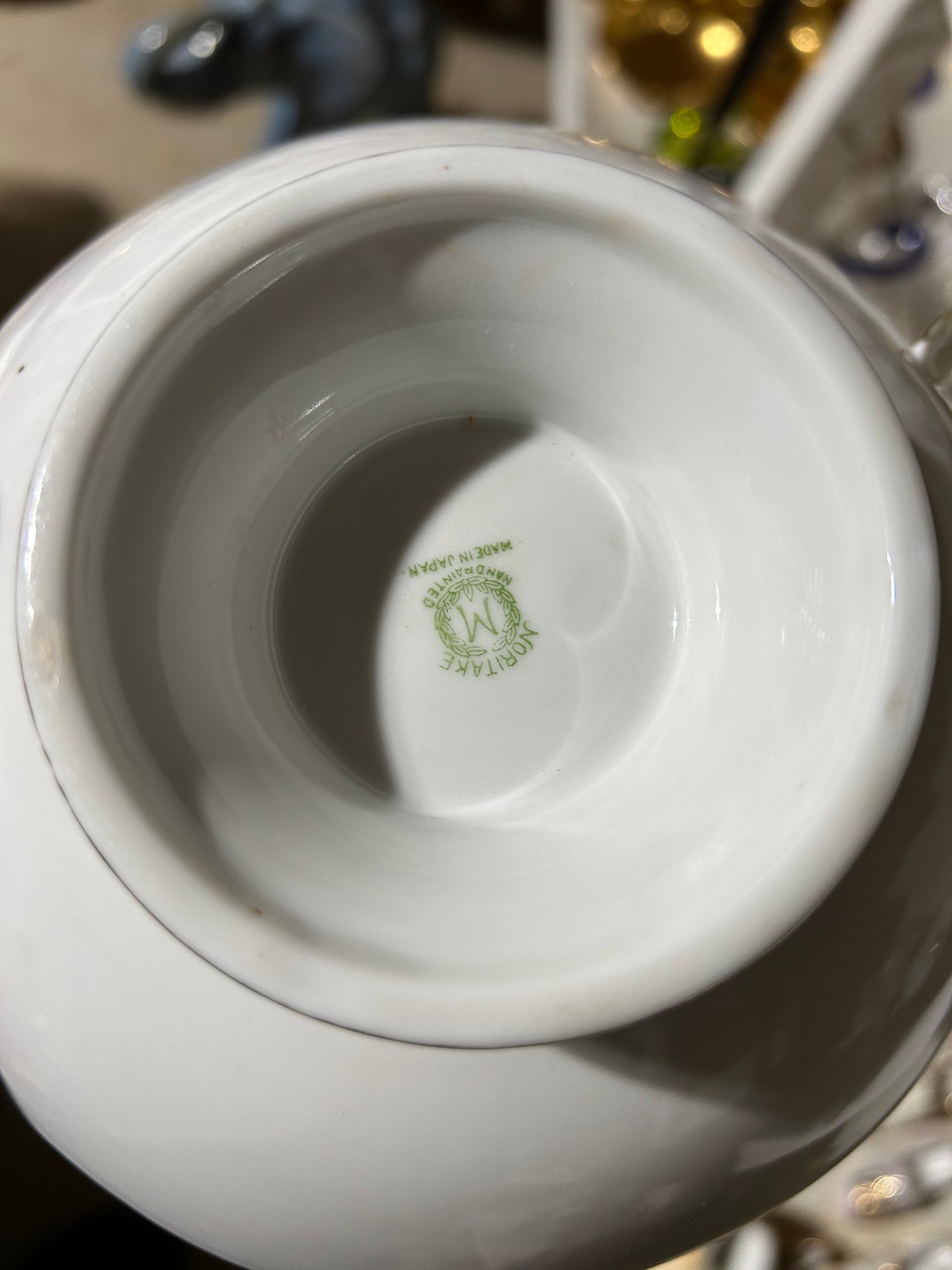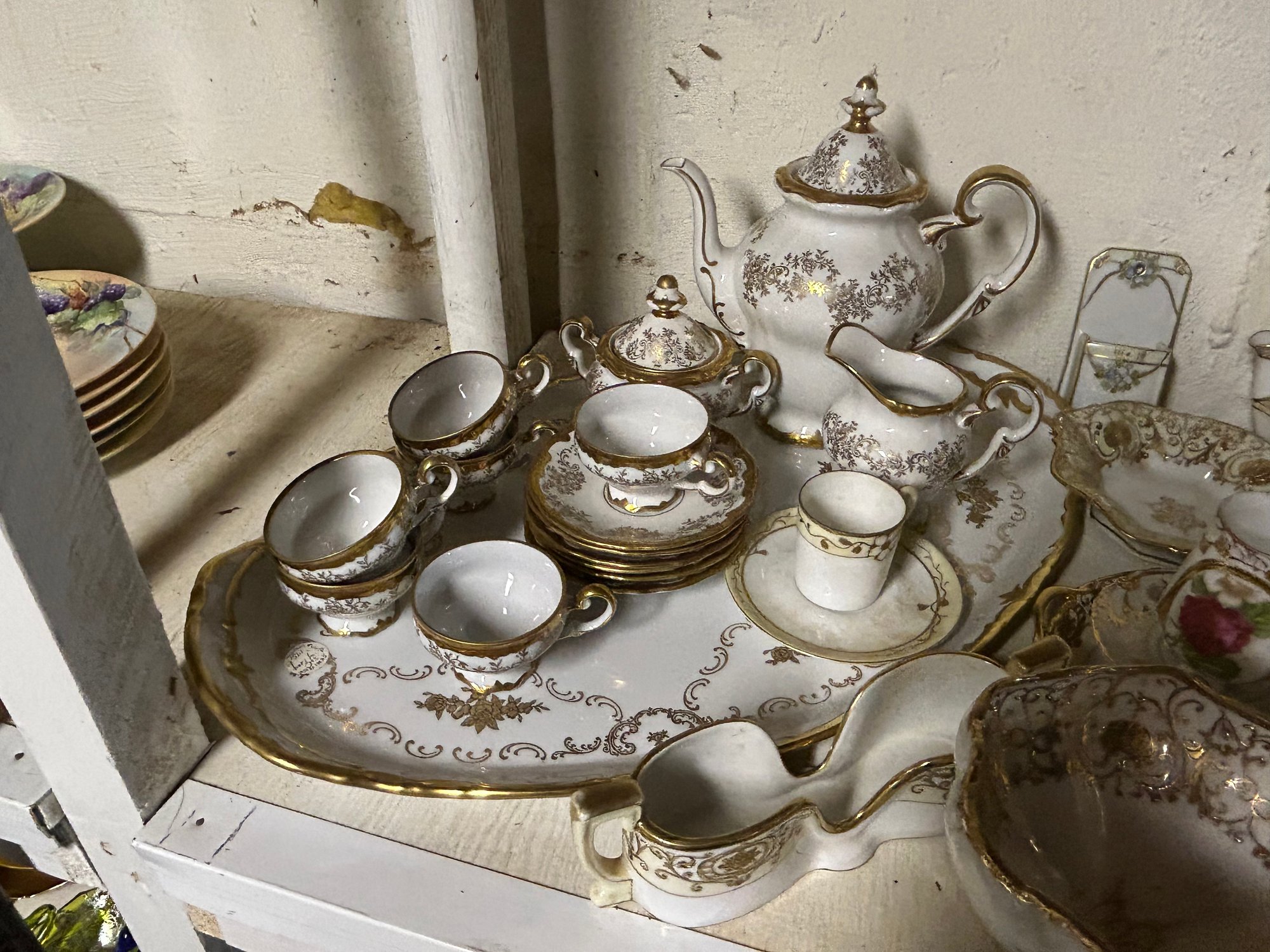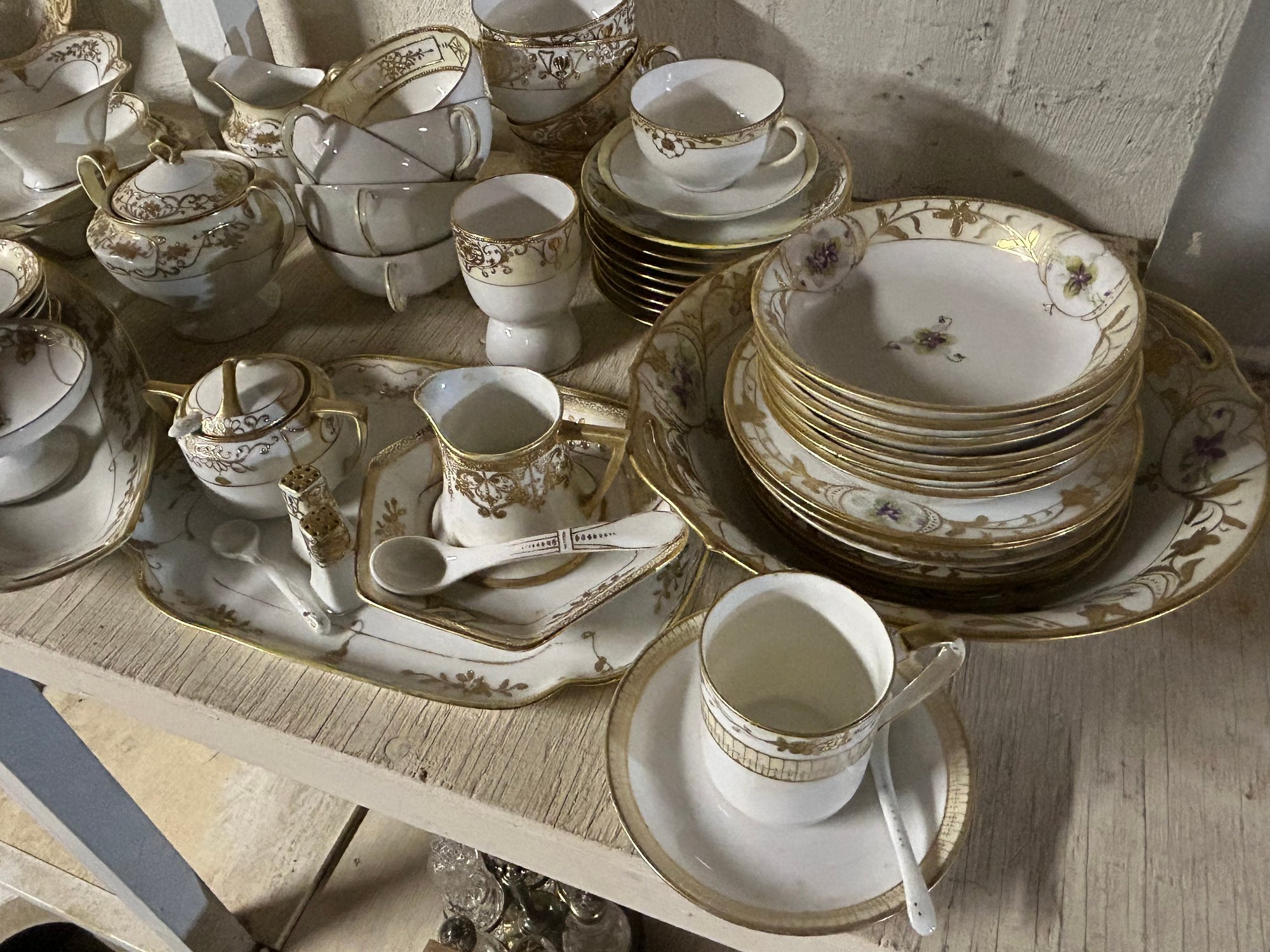 110+ pieces of Nippon Noritake and other China. White background, gold decoration. Includes cups, saucers, teapot, sugars, creamers, multiple serving pieces, luncheon set etc.