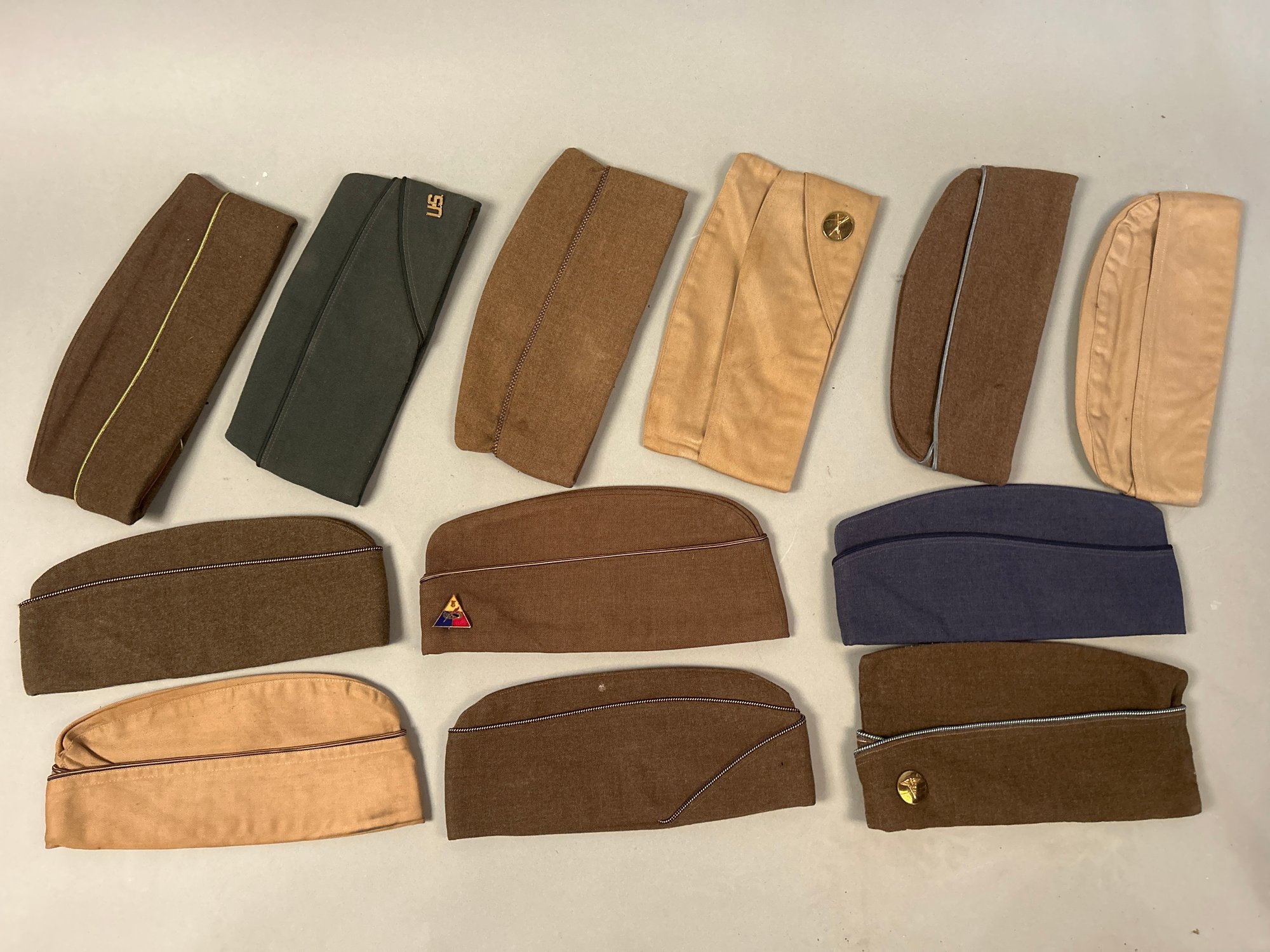 12 Vintage Soldiers Caps WW2, Vietnam?, Korea? Some with buttons