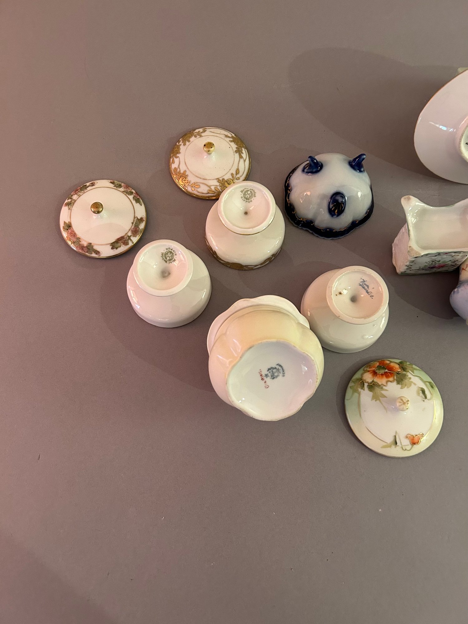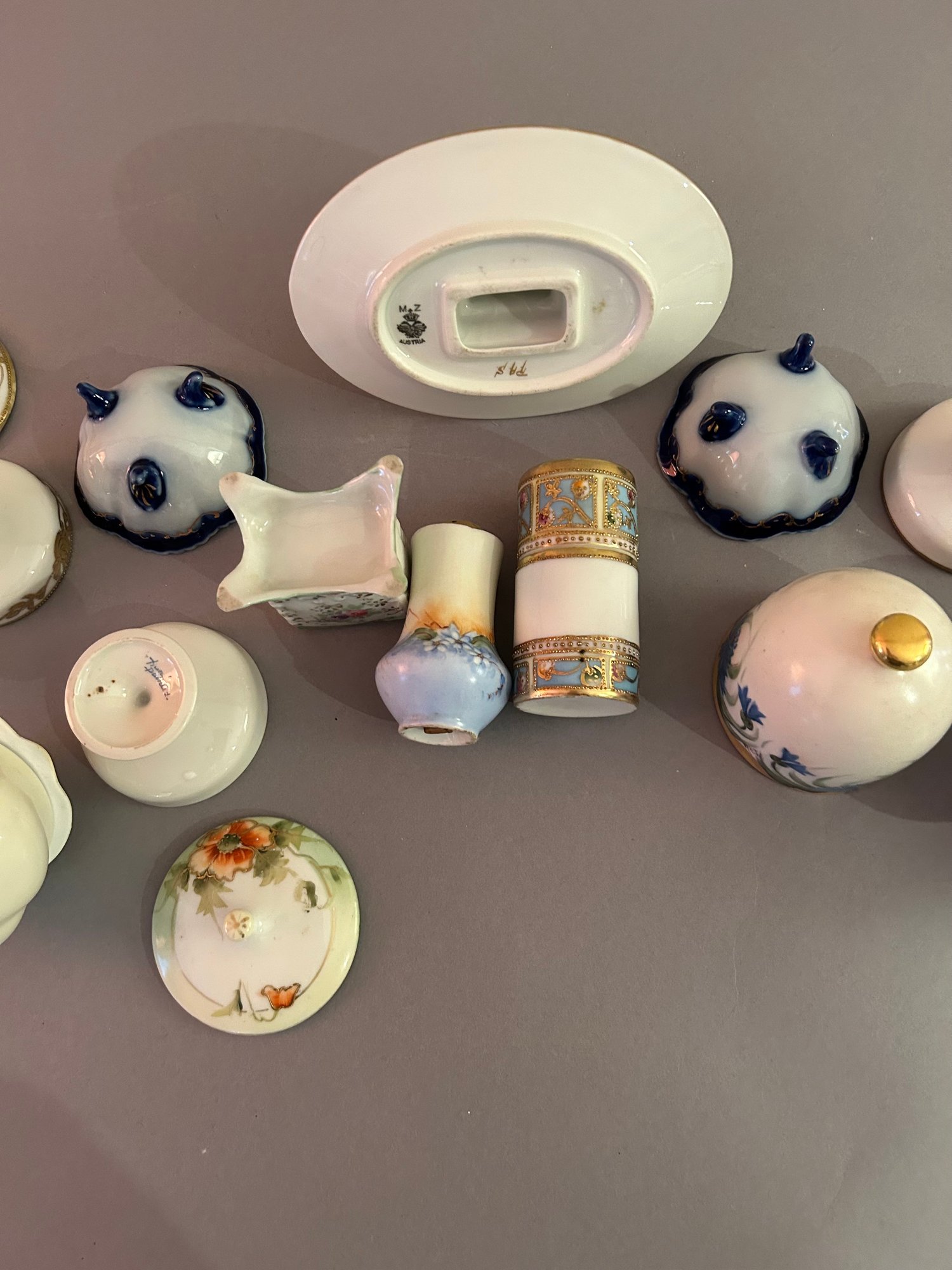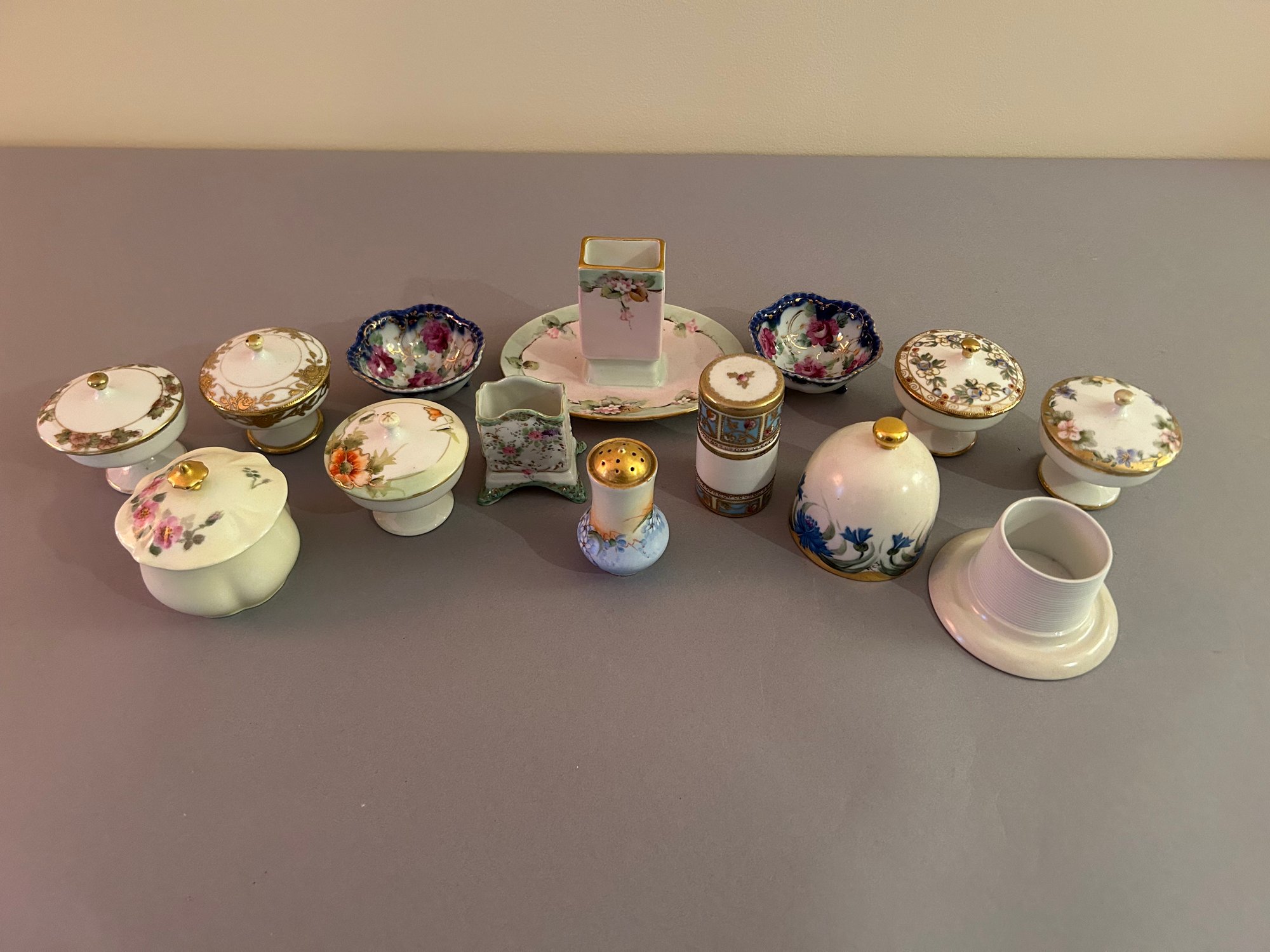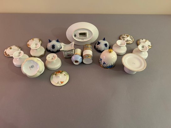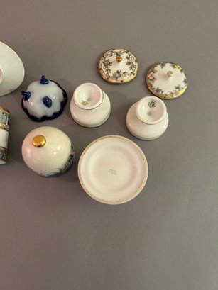 14 small pieces of porcelain including covered dishes and match holders. Tallest 4 inches