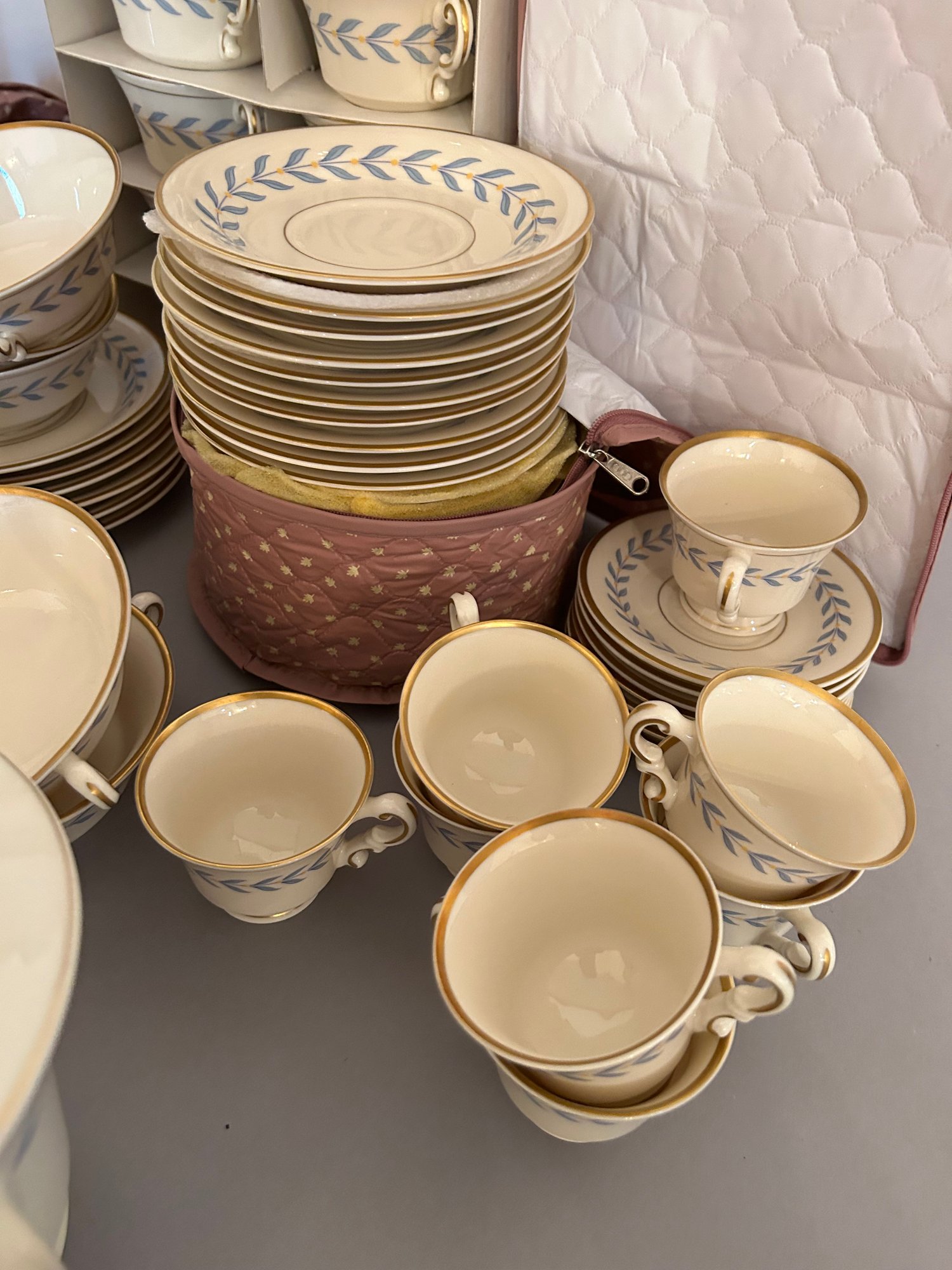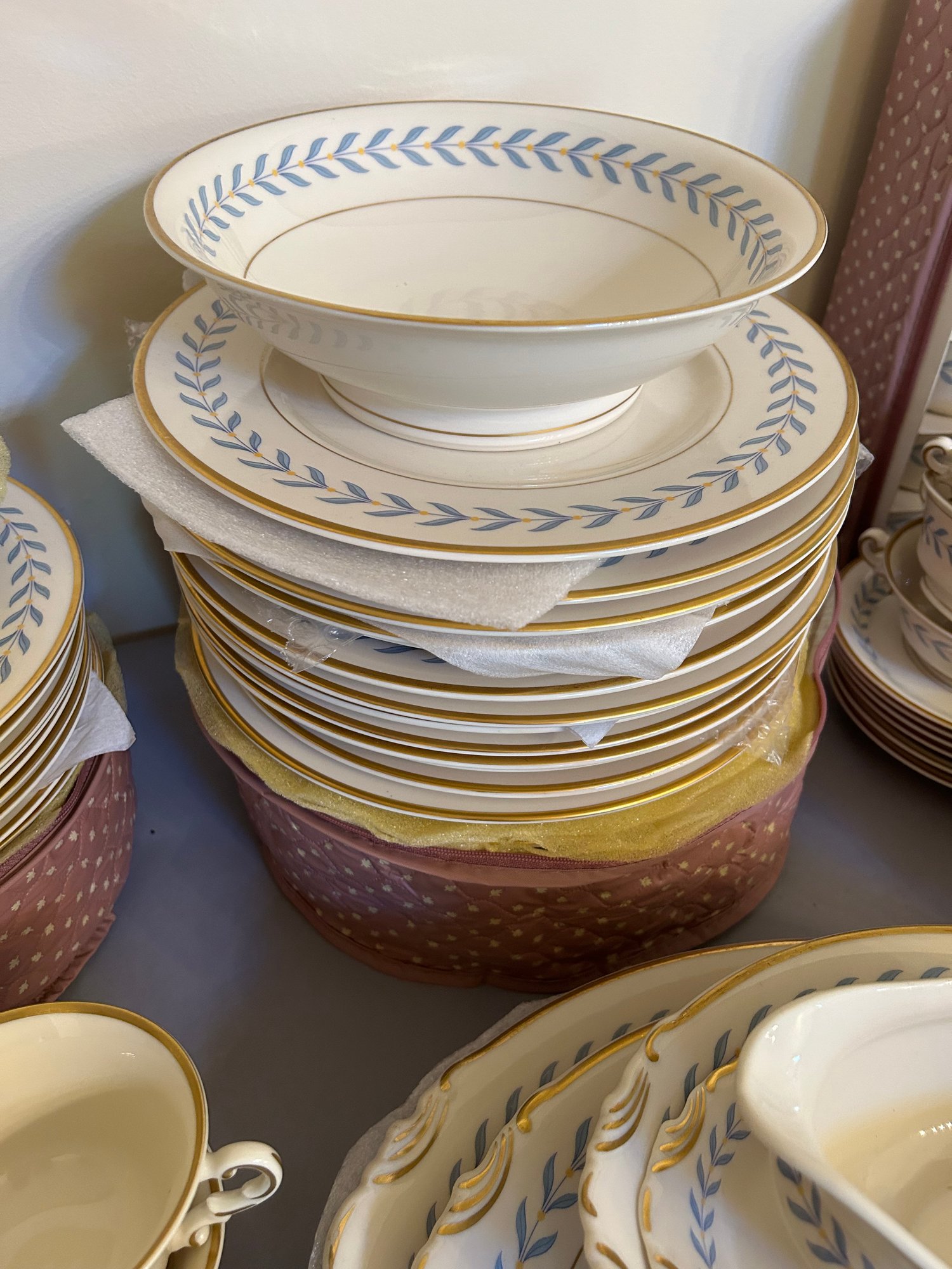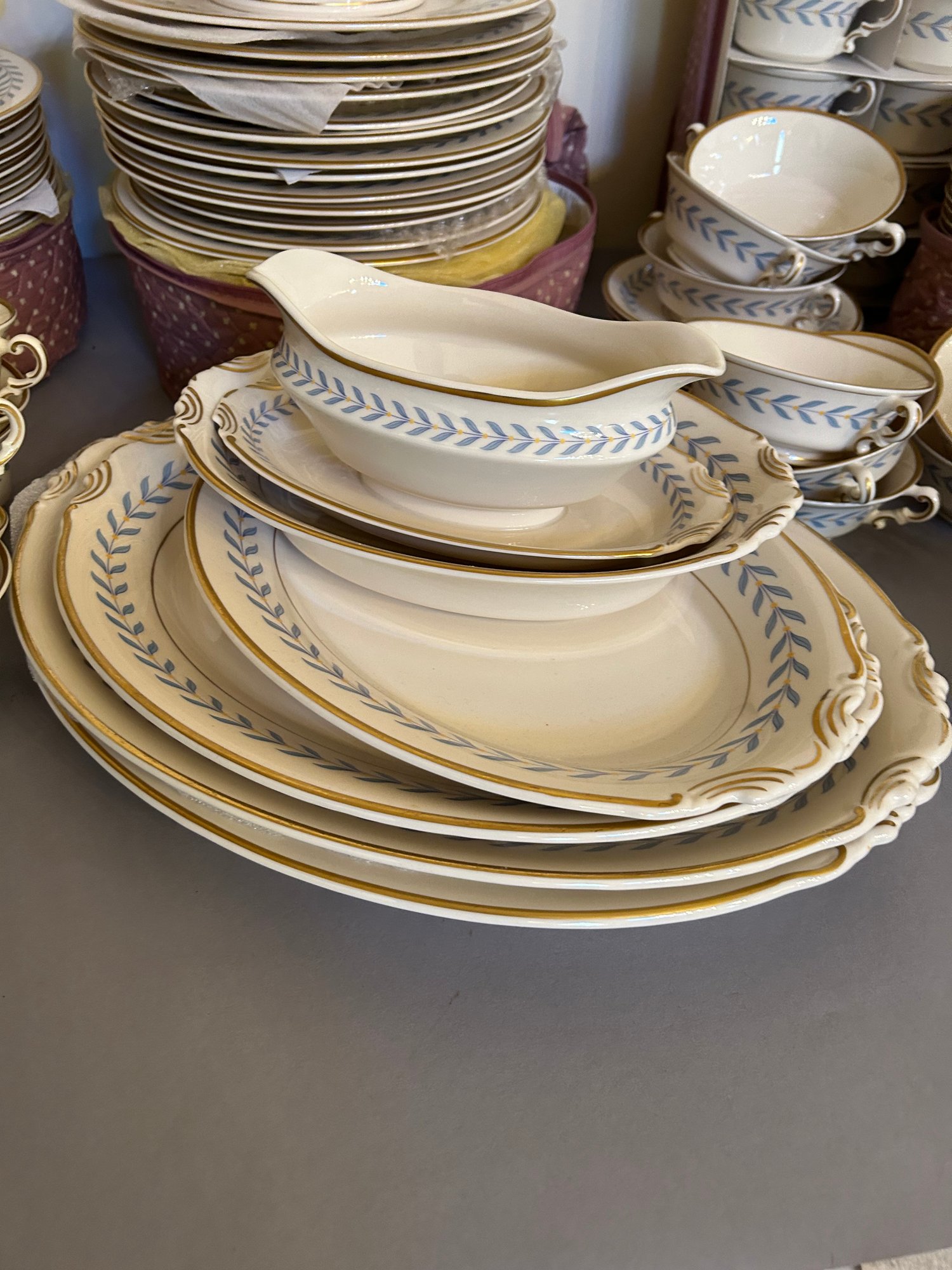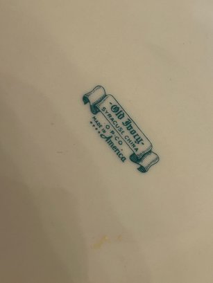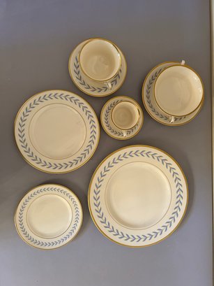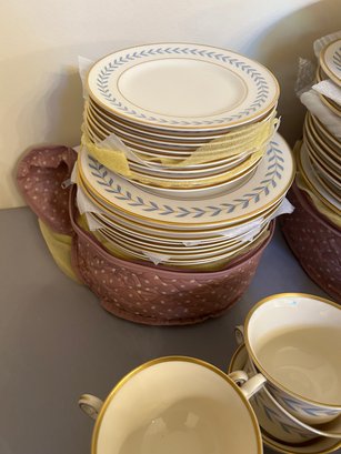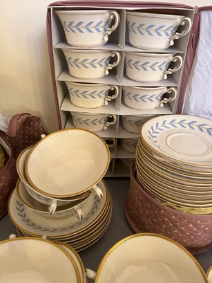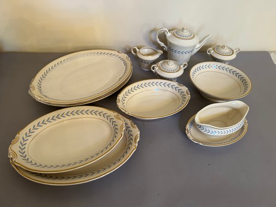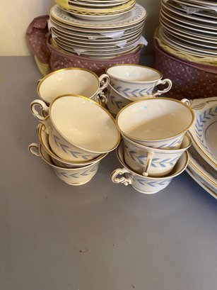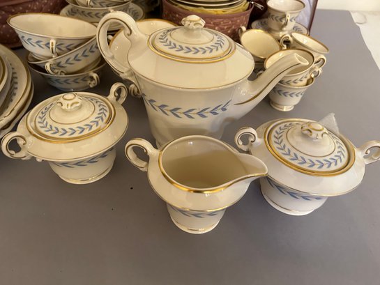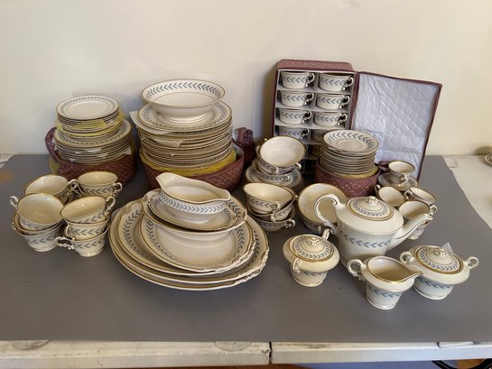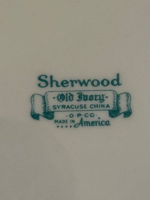 142 pieces Syracuse Old Ivory china in the pattern Sherwood. Ivory background with blue, yellow and gold decoration. Includes serving pieces, dinner plates, luncheon plates, bread plates, demitasse cups and saucers, tea cups and saucers, tea pot, sugar, creamer, gravy boat, platters, etc...