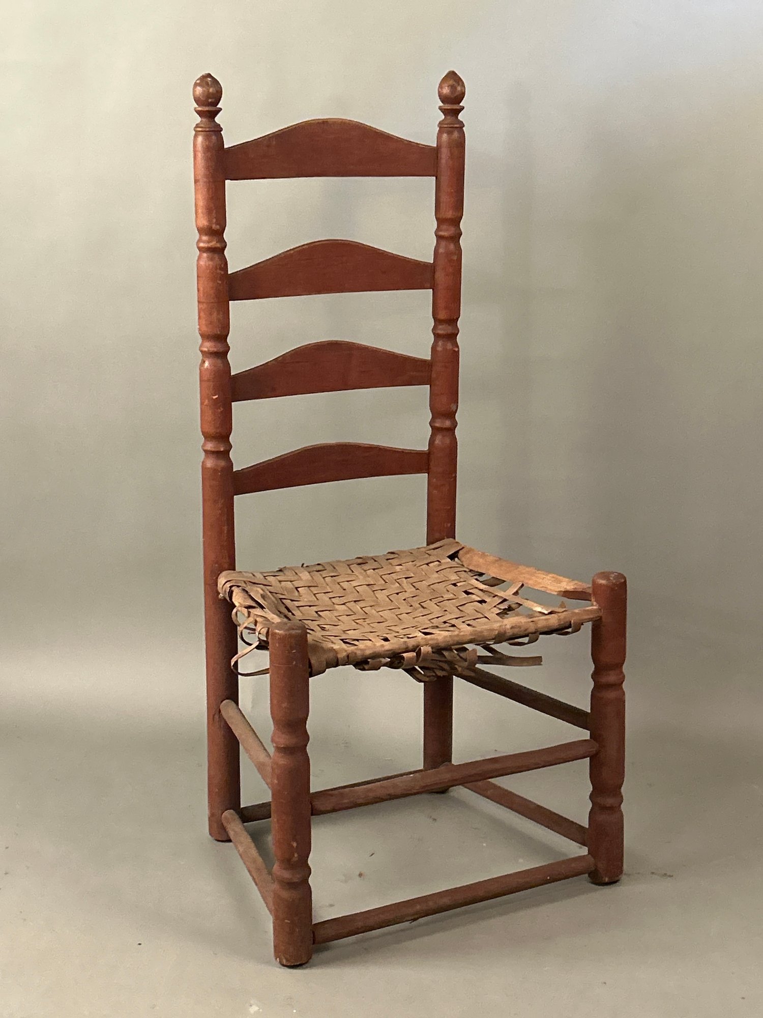 18th Century Ladder Back Side Chair Original red painted surface, sausage turnings, remnants of original seat. 19” x 14 1/2” x 39” tall seat height 15 inches.