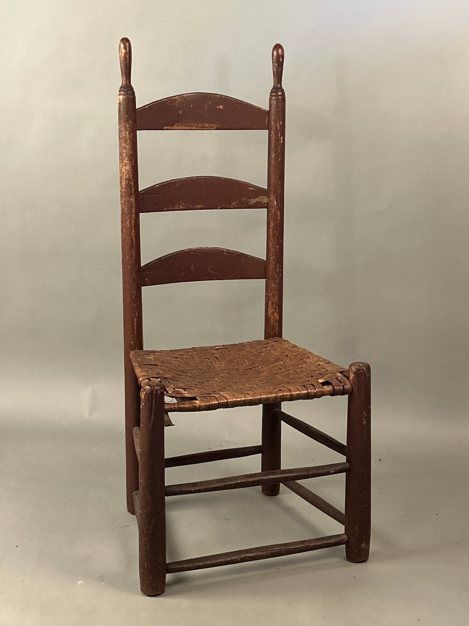 18 th Century Ladder Back Side Chair, Original Red painted surface. Nicely, turned finials, original splint seat. 19“ x 15“ x 40 1/2“ seat height 15 inches.