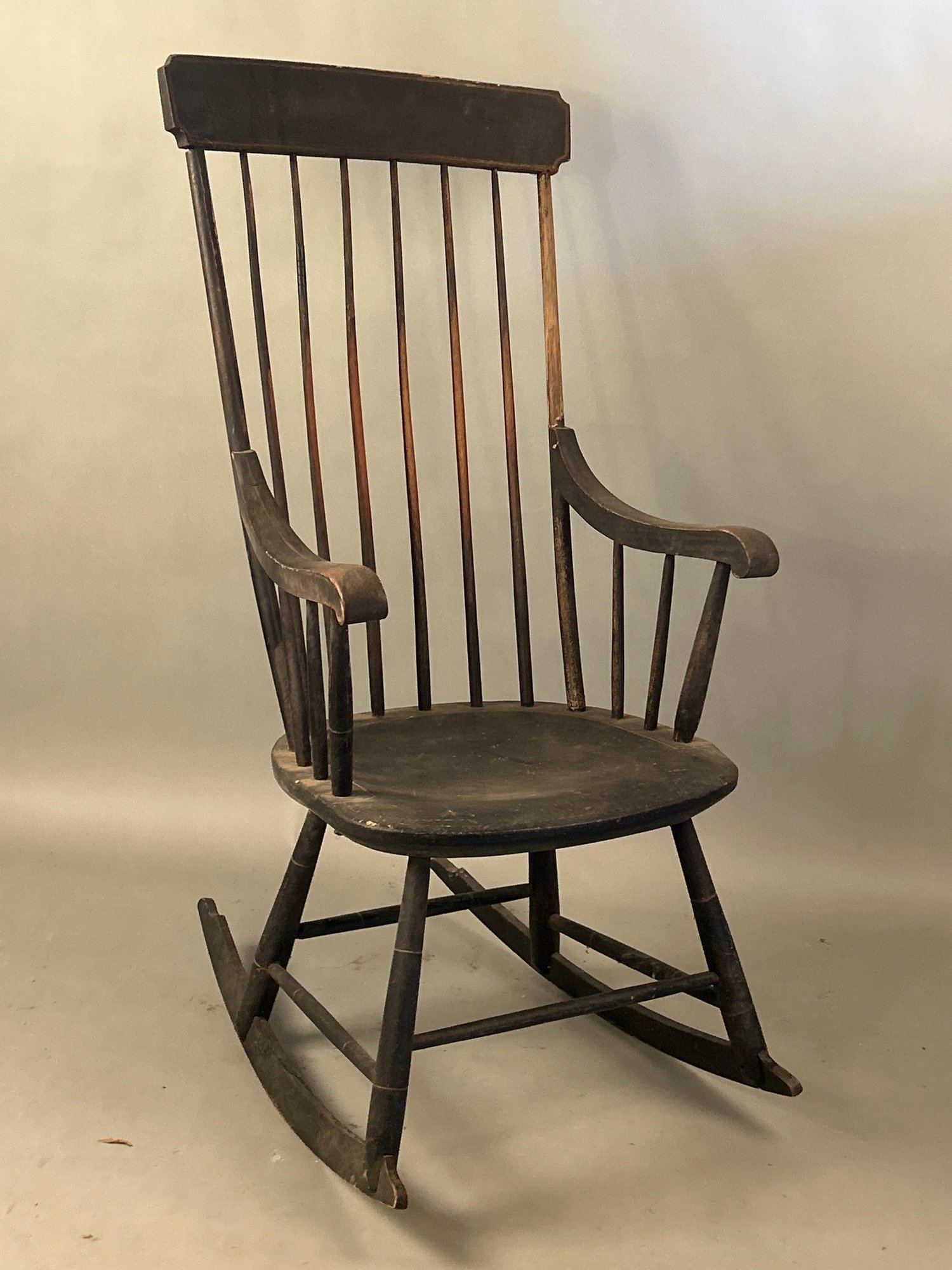 19 Century Windsor Rocking Chair Old, possibly original black painted surface. Single board carved seat bamboo turned legs 21 1/2 wide by 19 x 45 1/2 tall.