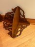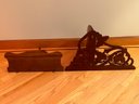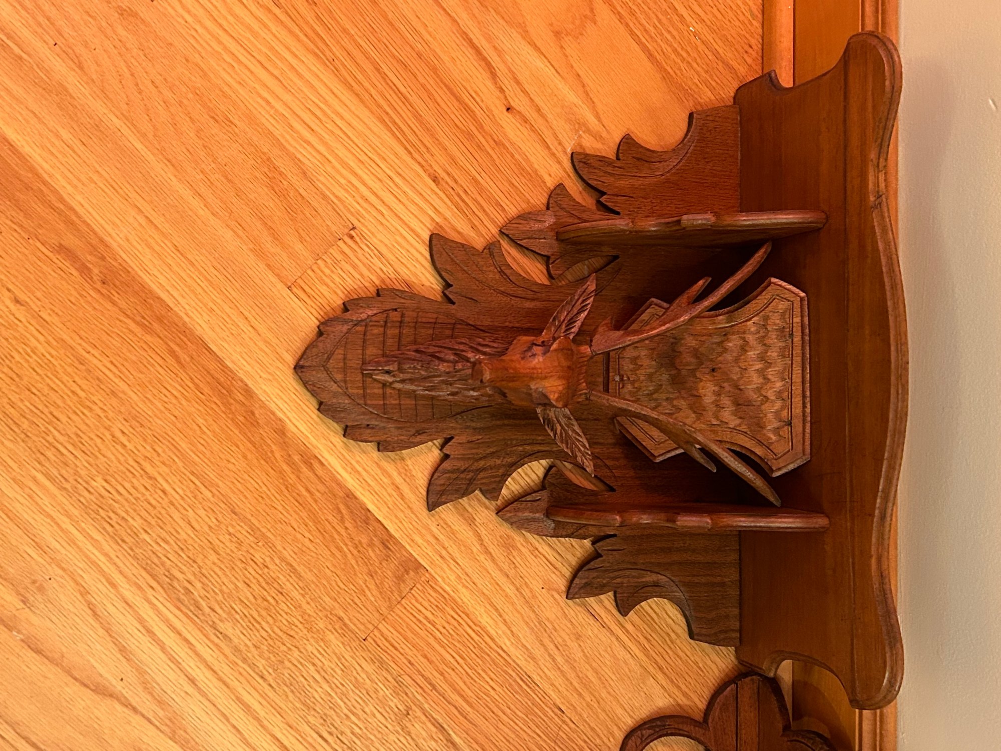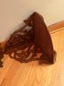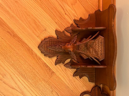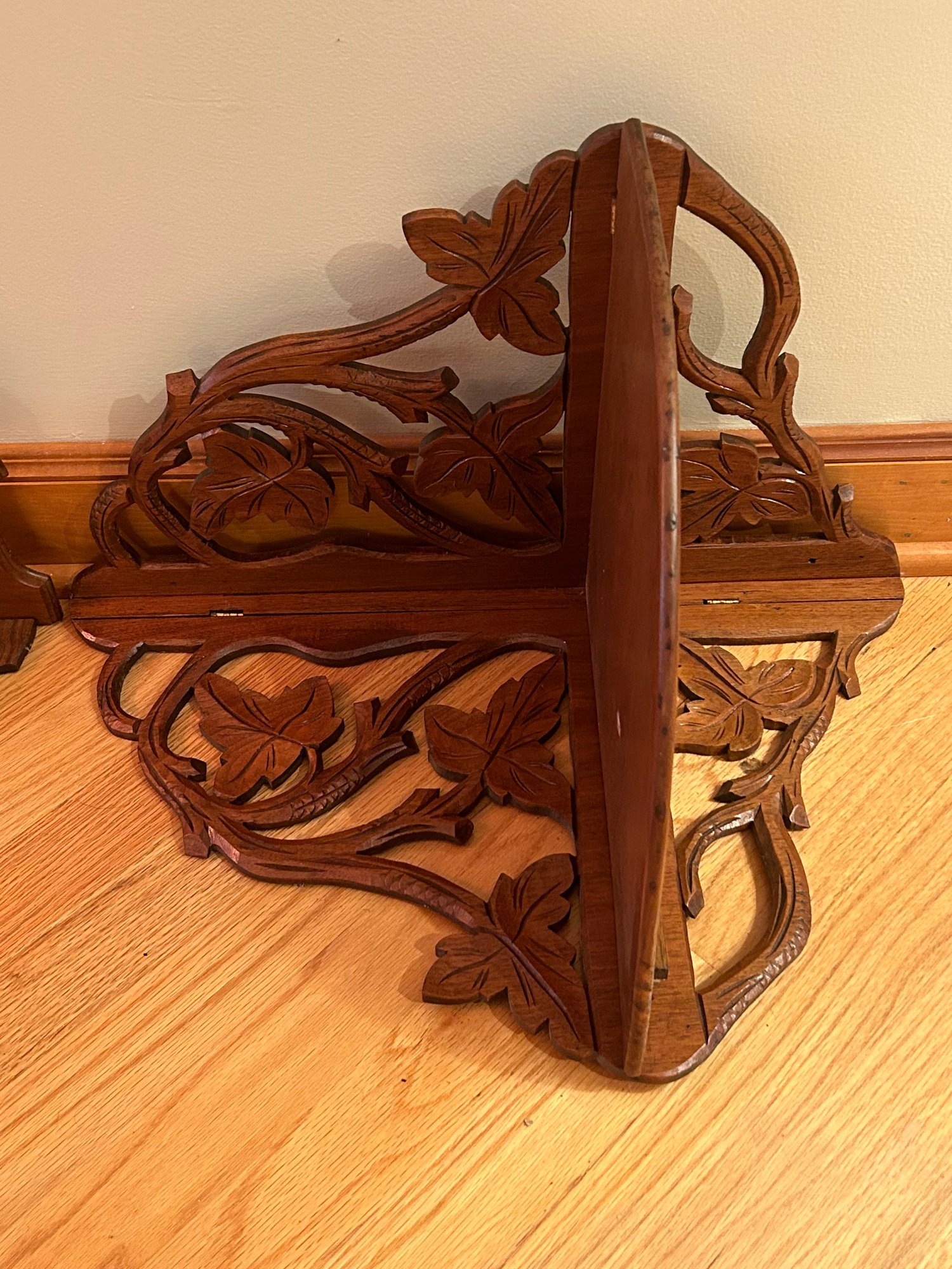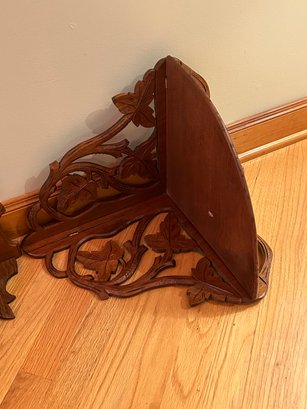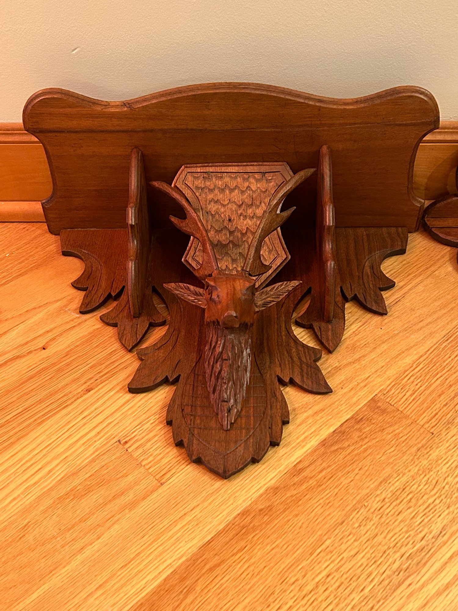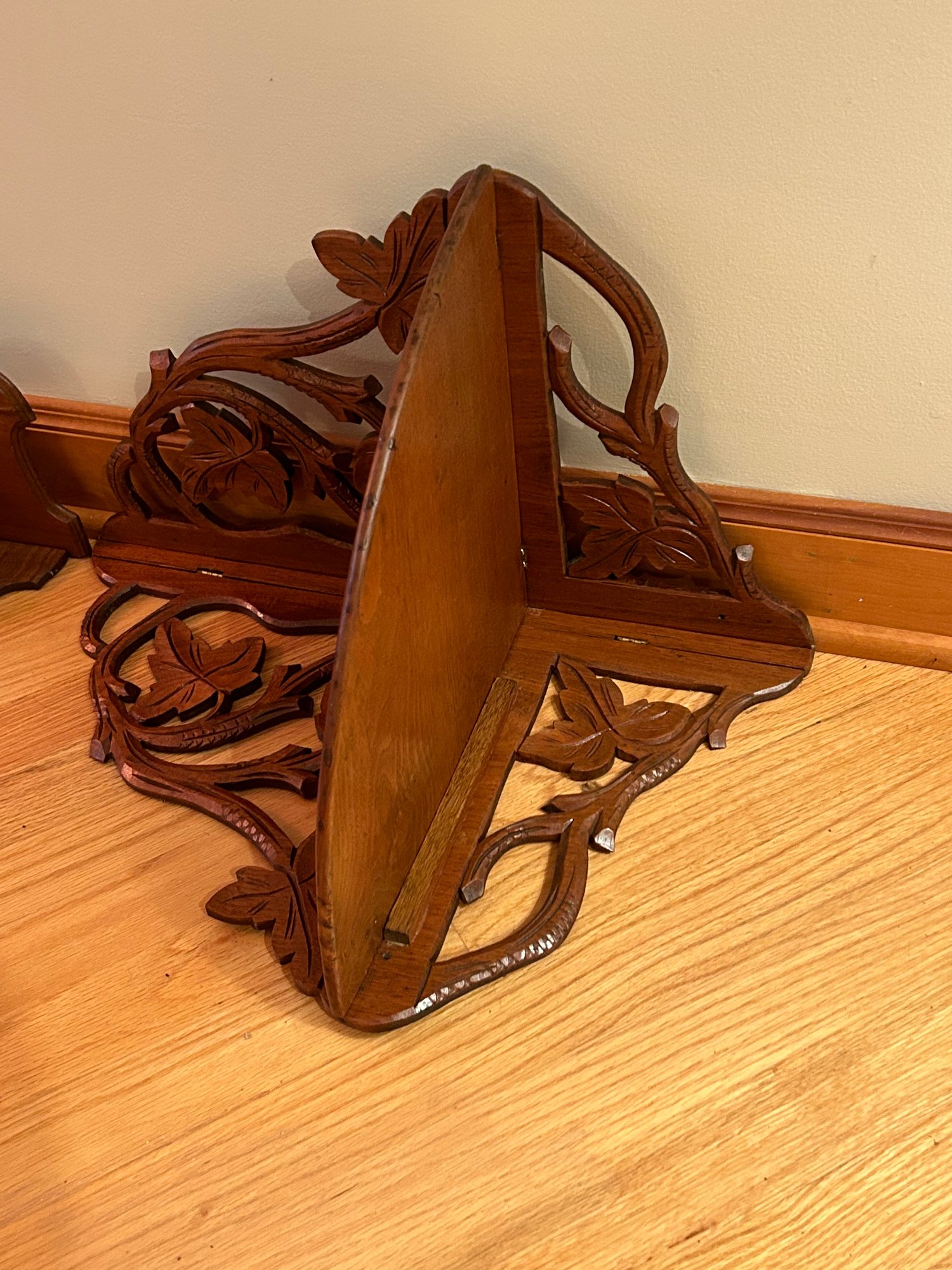 2 carved shelves. Including one with deer with antlers, the second a folding shelf with leaf decoration. Both walnut. 20x12x12 inches