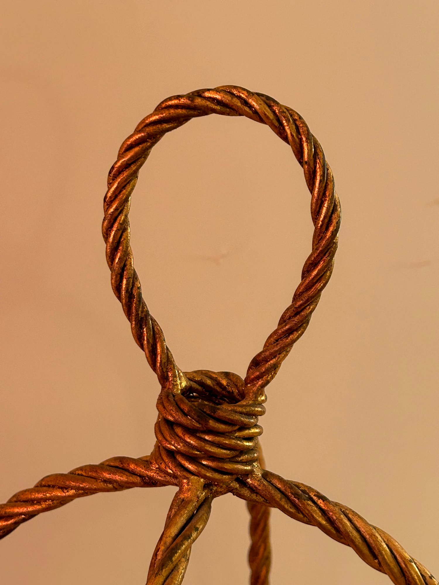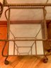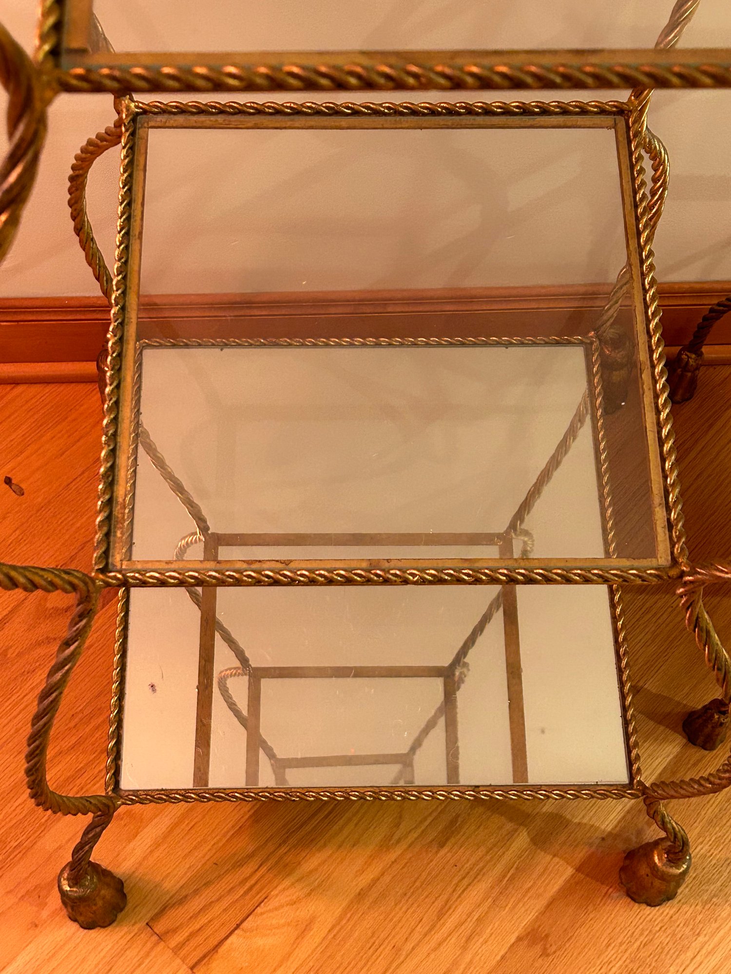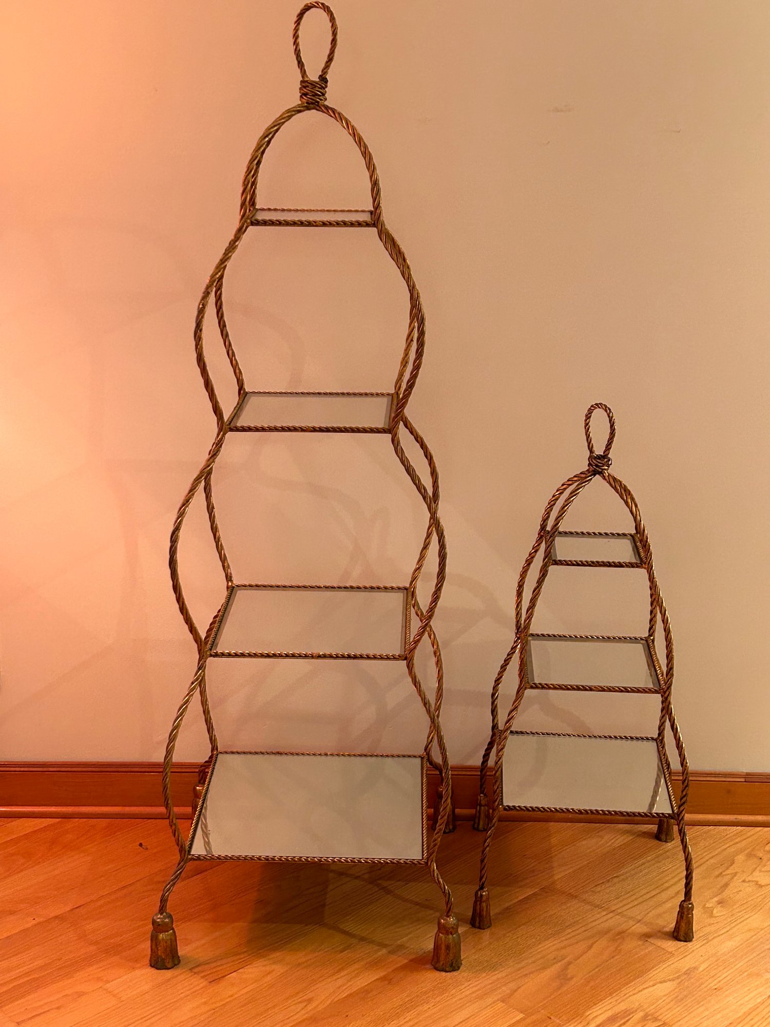 2 Decorative display shelves, rope turned iron with iron tassel feet. Made to look like gold roping. Glass shelves, mirrored bottoms.