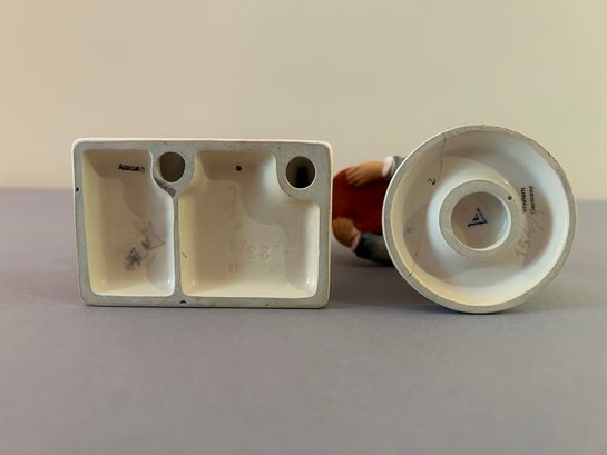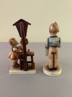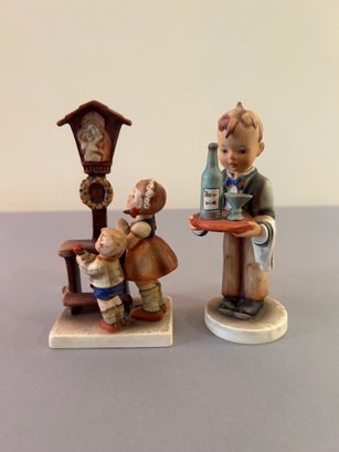 2 Hummel figurines including girl and boy looking at madonna and child and bartender holding tray with wine, tallest 7 inches
