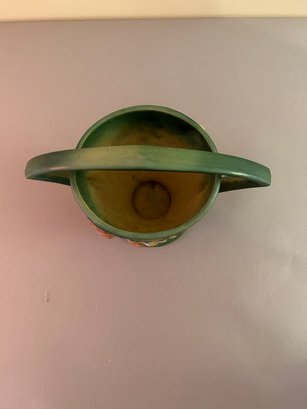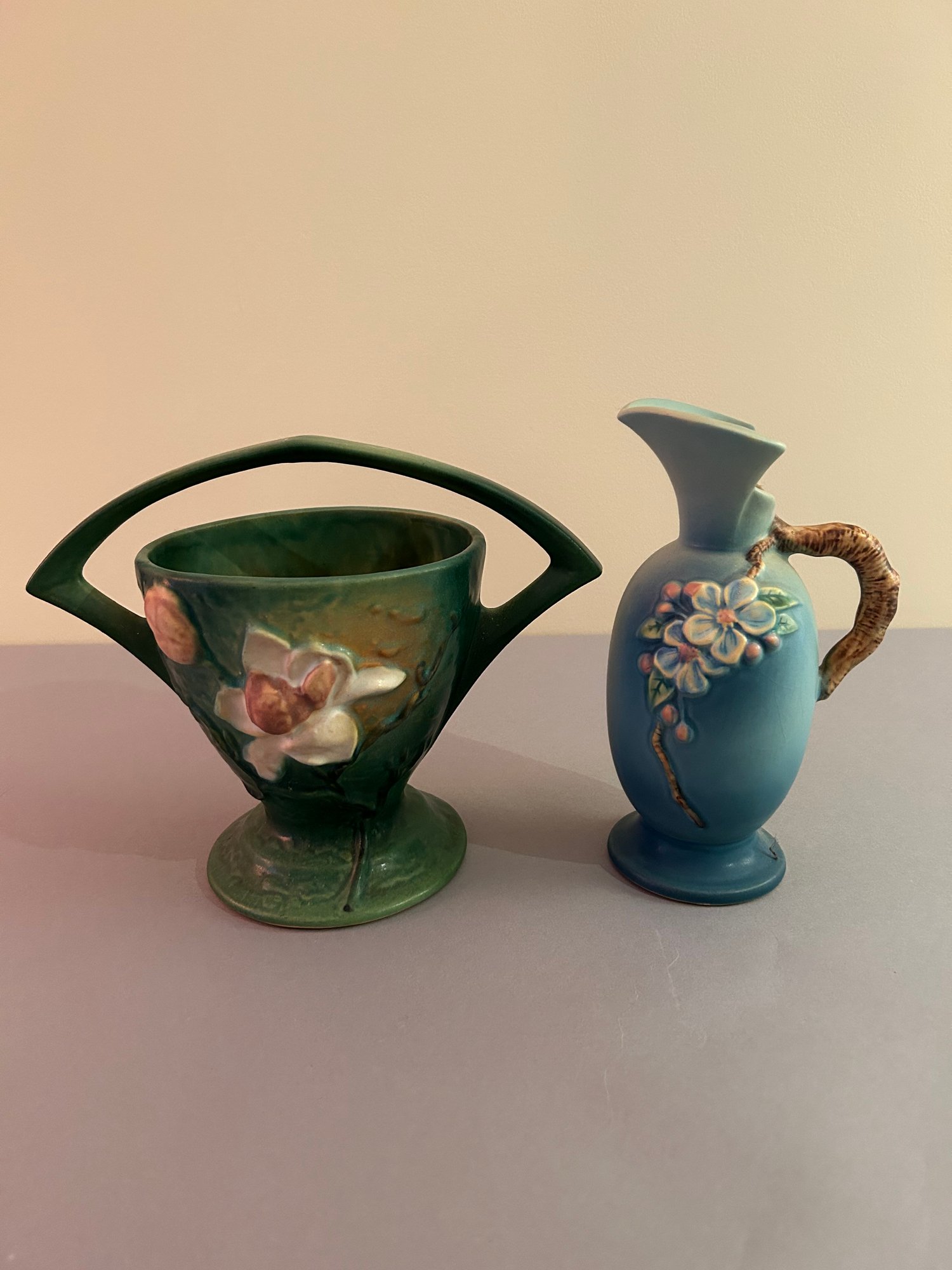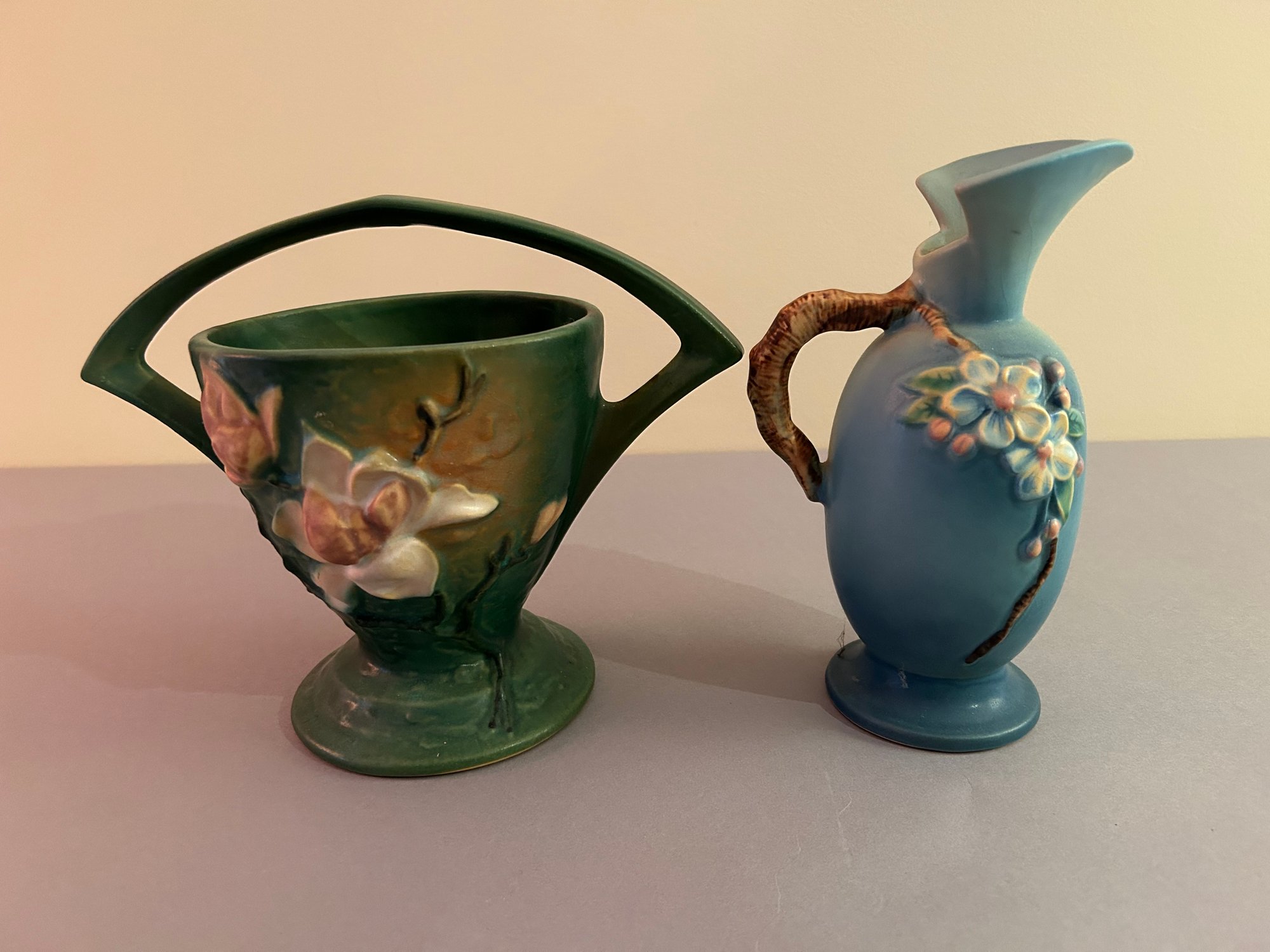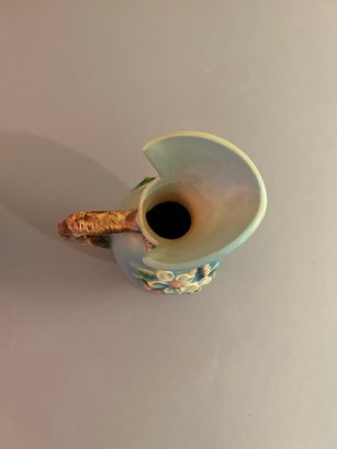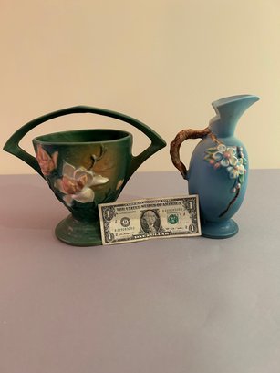 2 pieces Roseville including basket with handle and ewer with handle. Both with floral decoration, both signed on the bottom Roseville tallest 8.5 inches