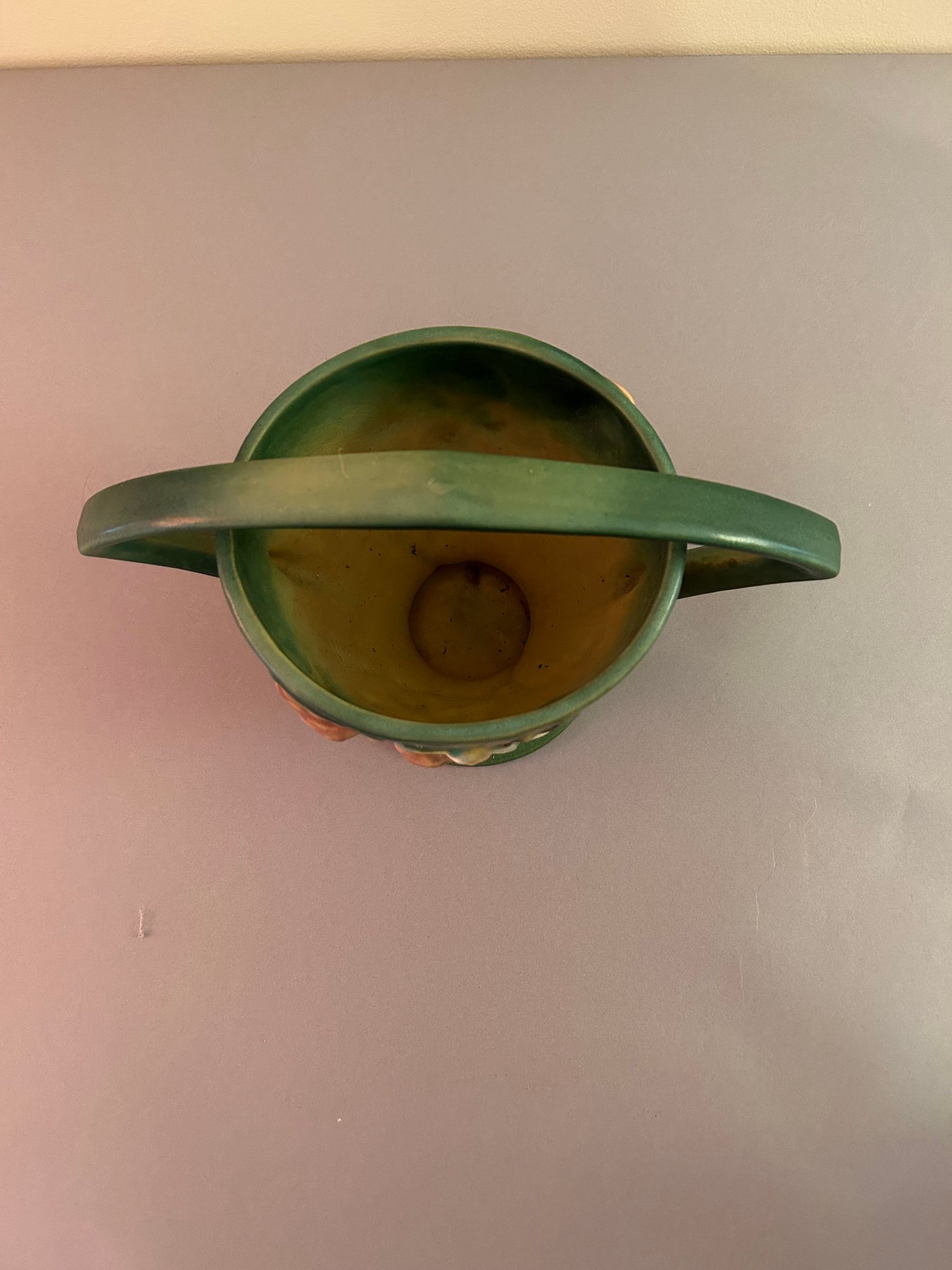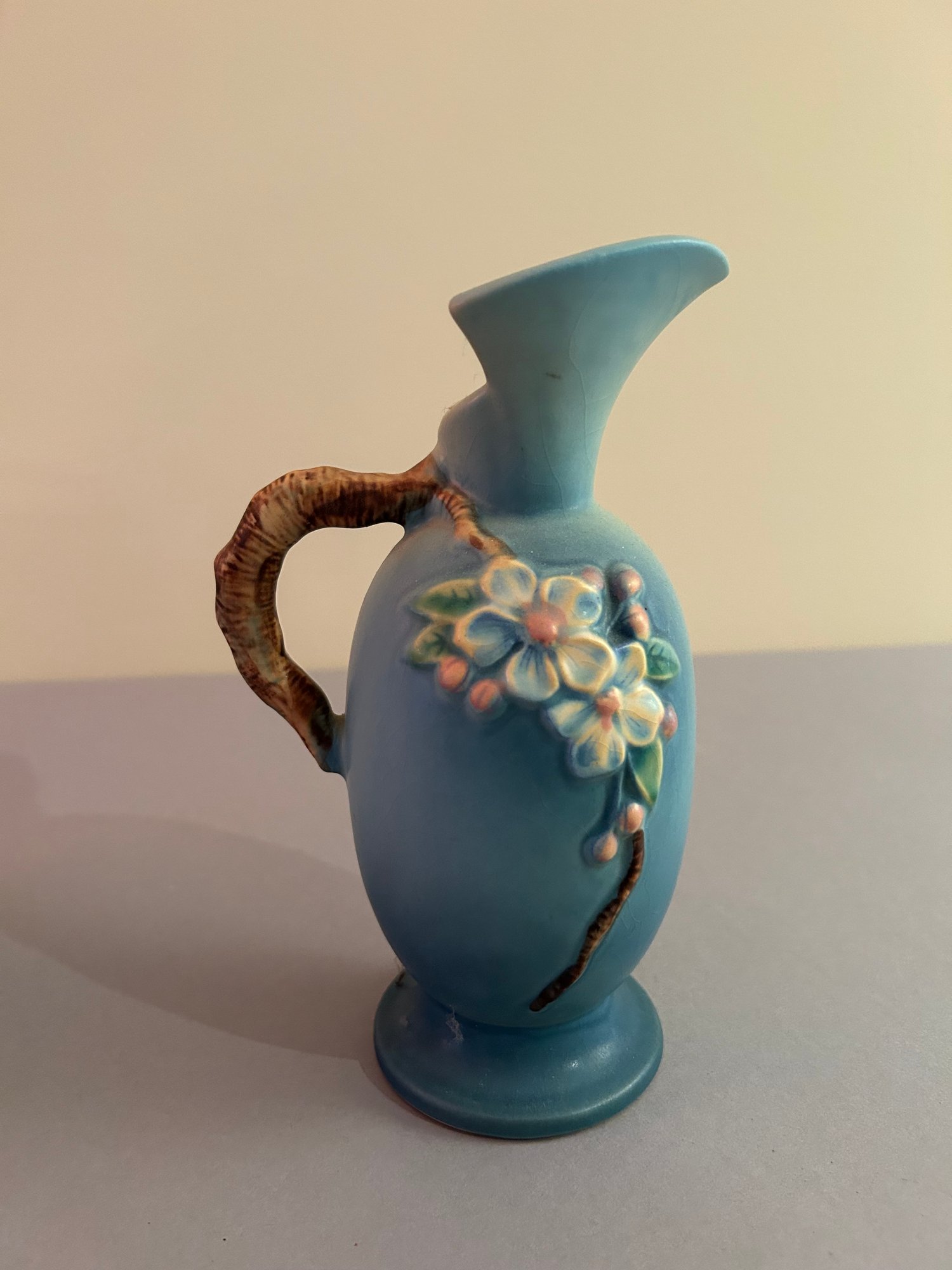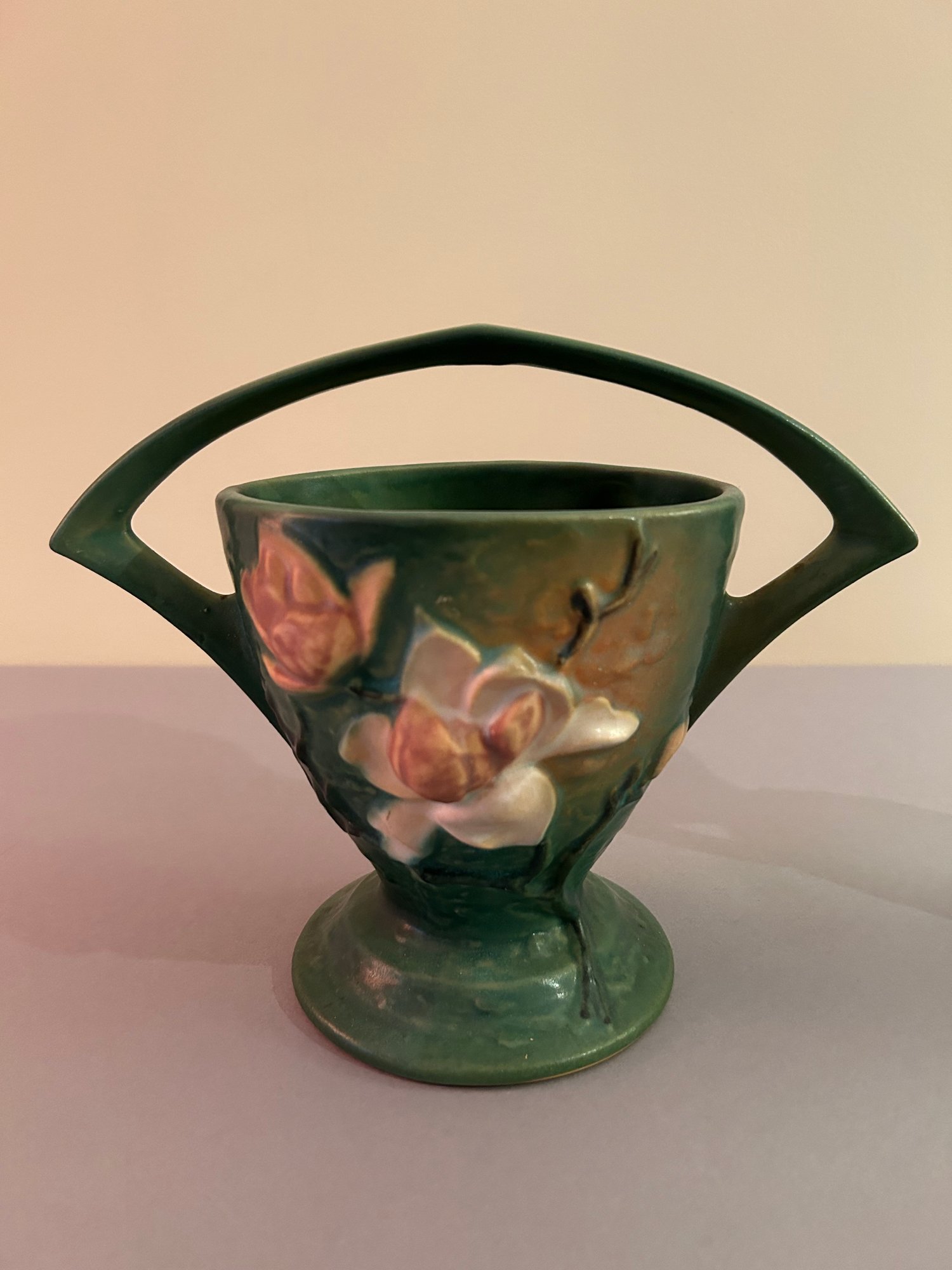2 pieces Roseville including basket with handle and ewer with handle. Both with floral decoration, both signed on the bottom Roseville tallest 8.5 inches