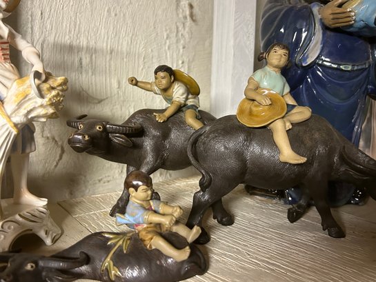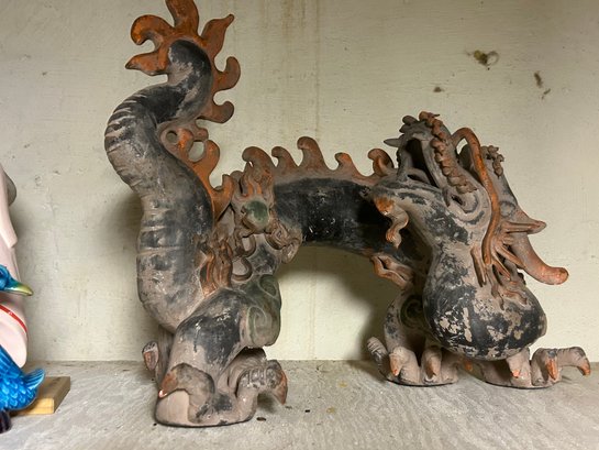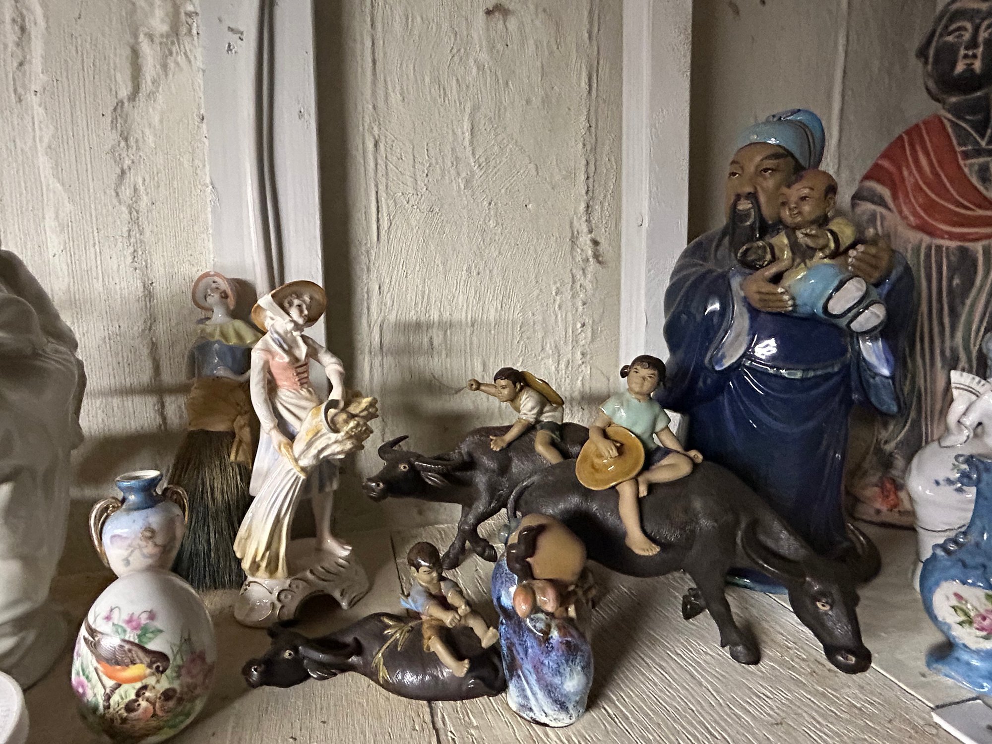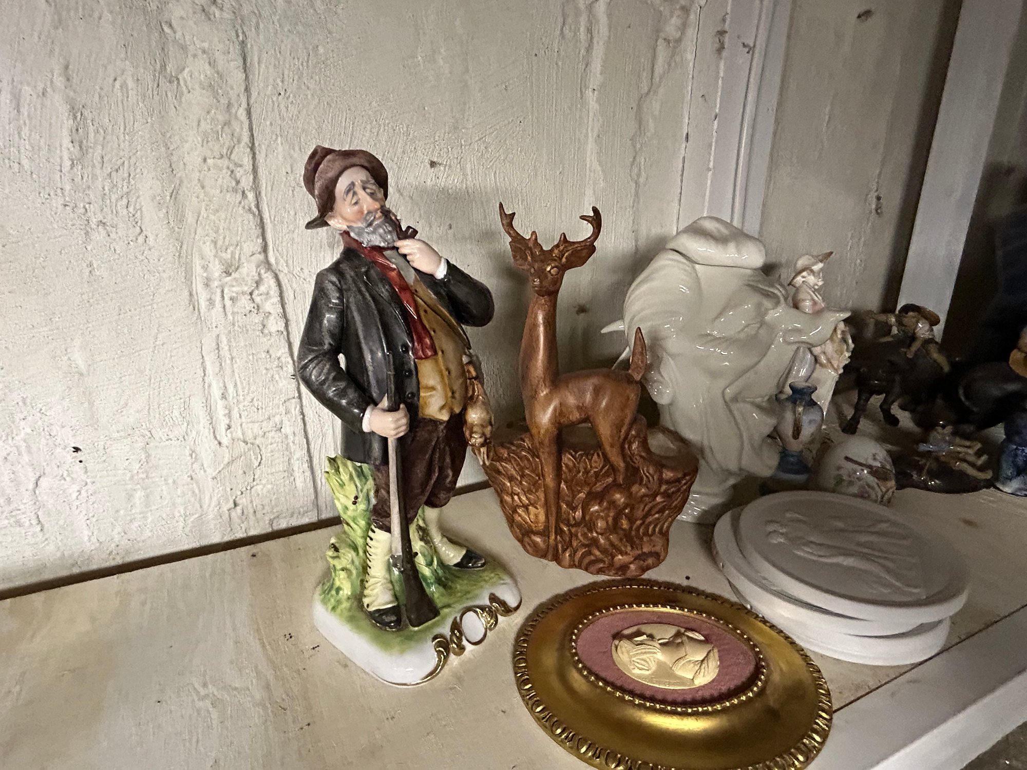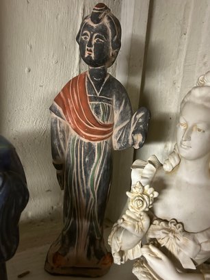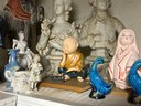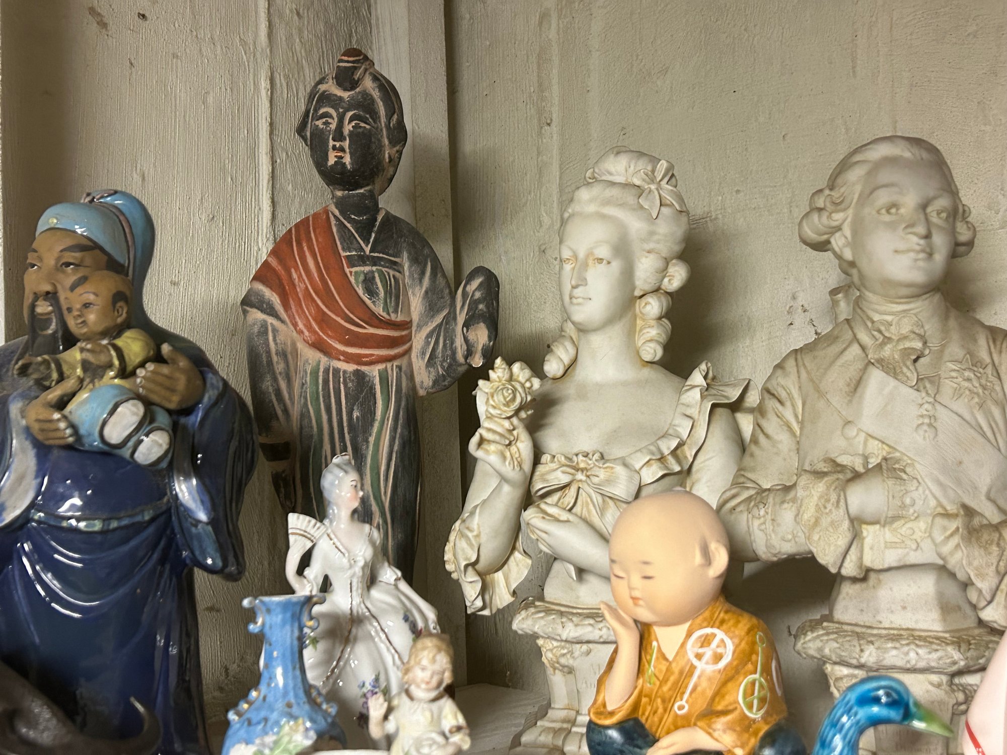 25 piece Shelf lot of figurines, statues, etc. including large pottery dragon, pair of Perrion figures, Marie-Antoinette, Asian figures, Ronald Reagan pitcher. Largest piece of 17 1/2 inches tall.