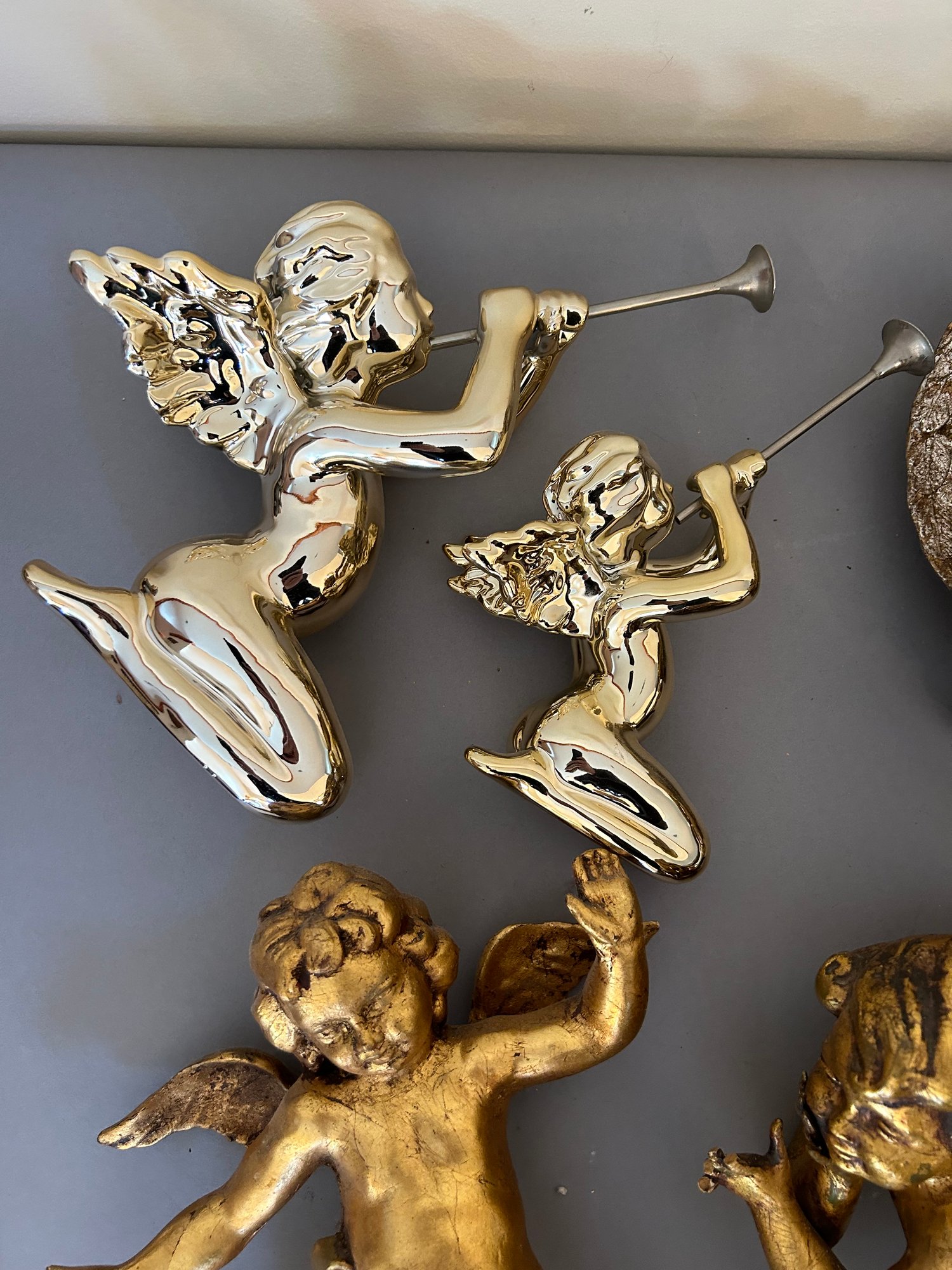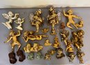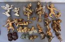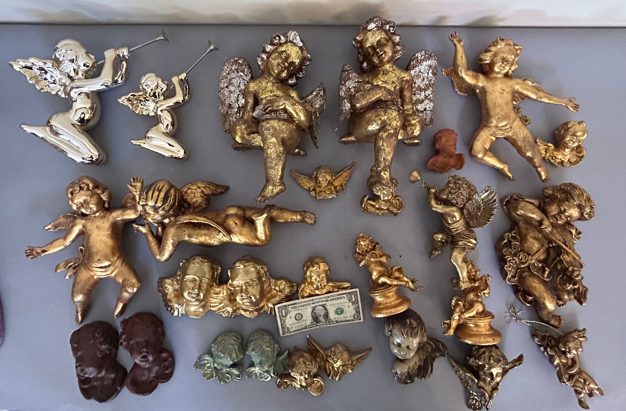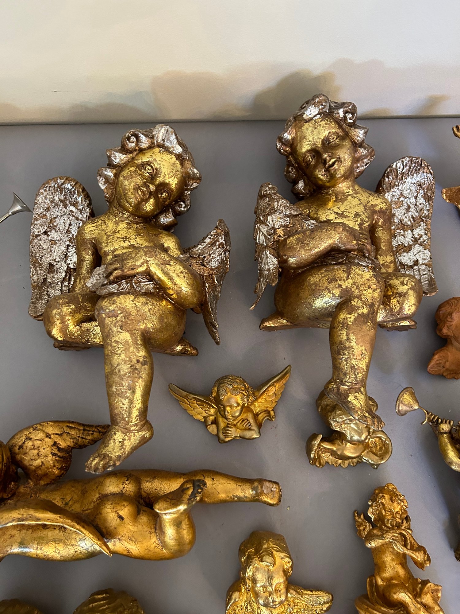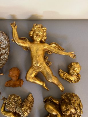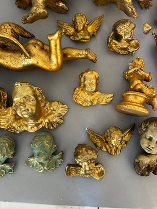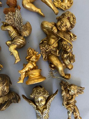 26 cherubs, mostly composition. Two in top left of photo metal. All painted gold. Tallest one 12 inches.