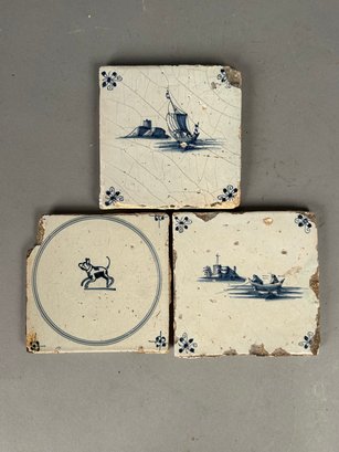 Three antique dealt tiles. 2 nautical, 1 w dog.