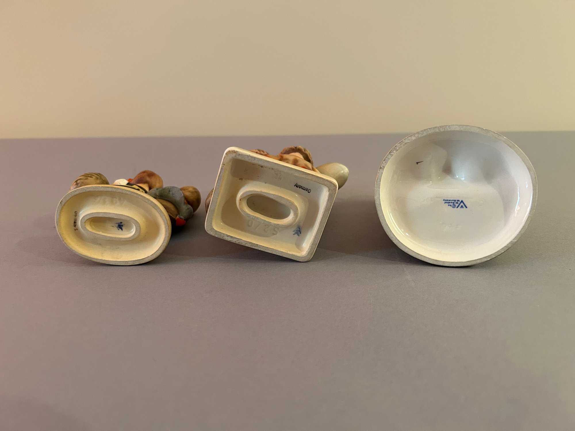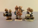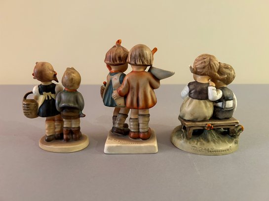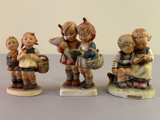 3 Hummel figurines including a boy and girl, one with black board, and two with baskets, tallest 5 inches