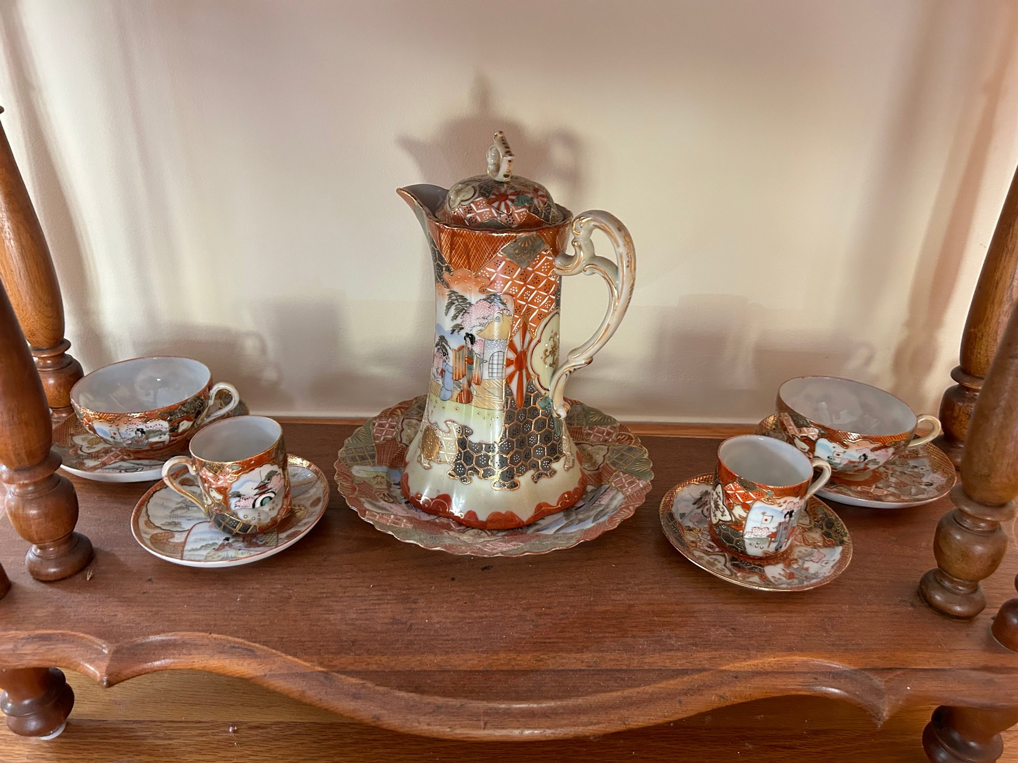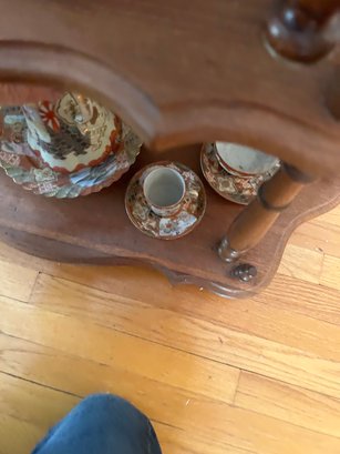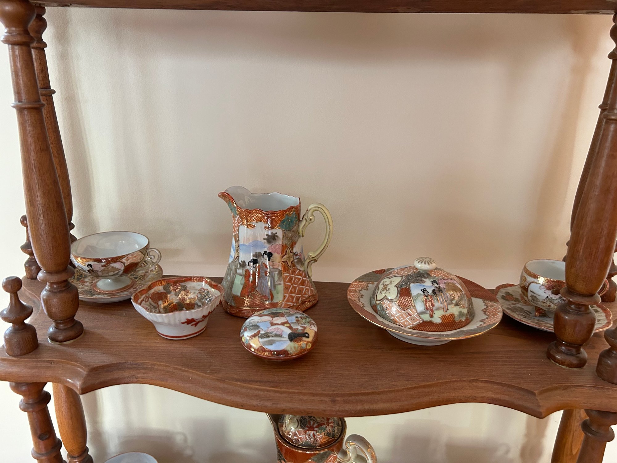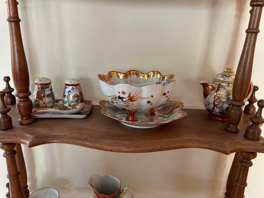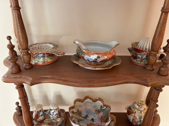 35 pieces of Satsuma including serving pieces and cups and saucers. Shelf not included