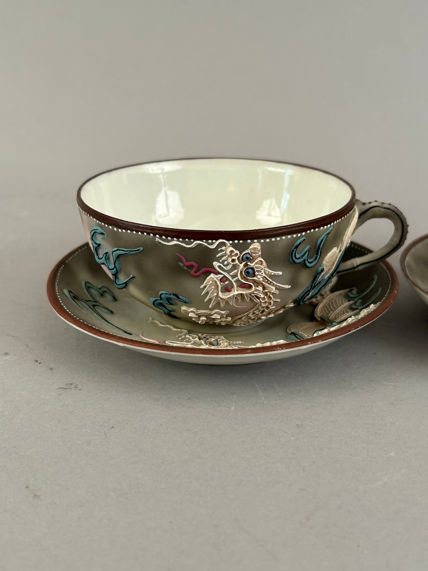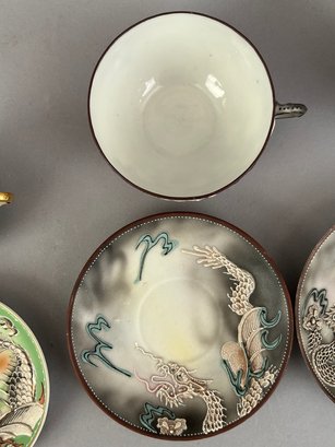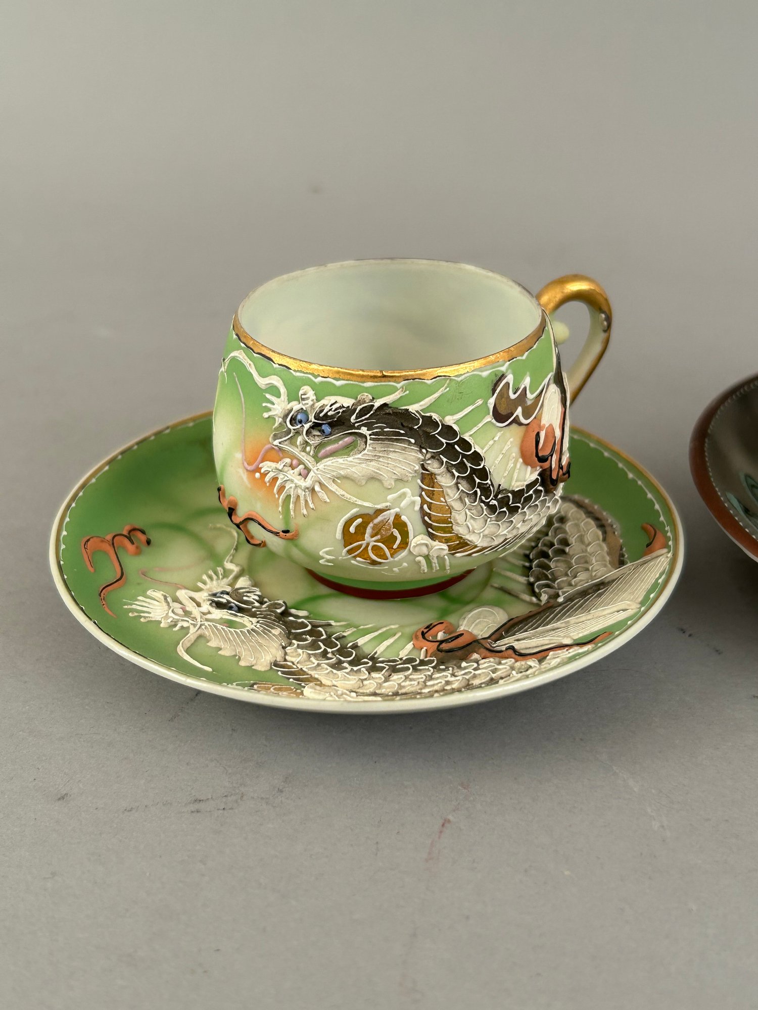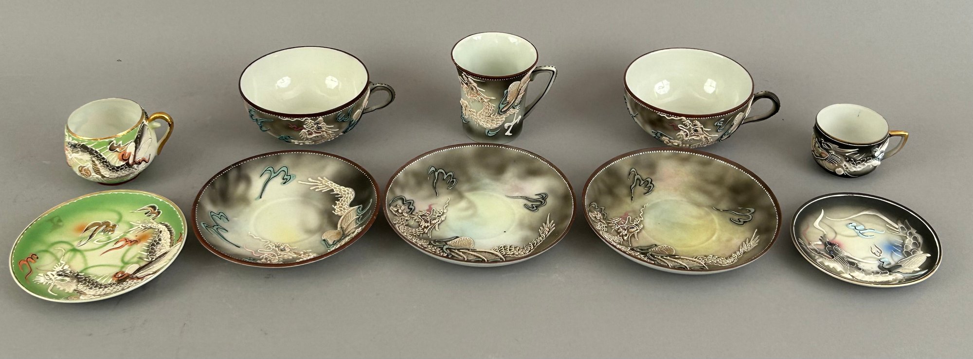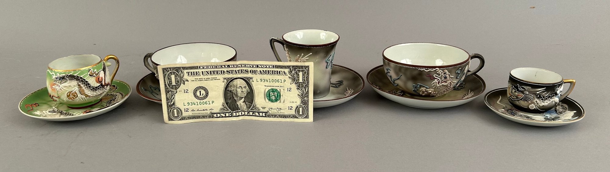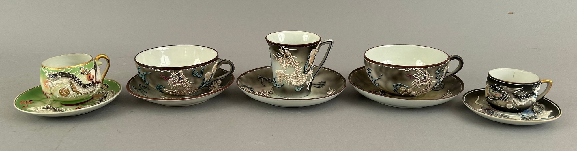 5 Moriage dragonware cups and saucers of varying shapes and sizes. Some marked Handpainted Nippon, one marked Victoria.