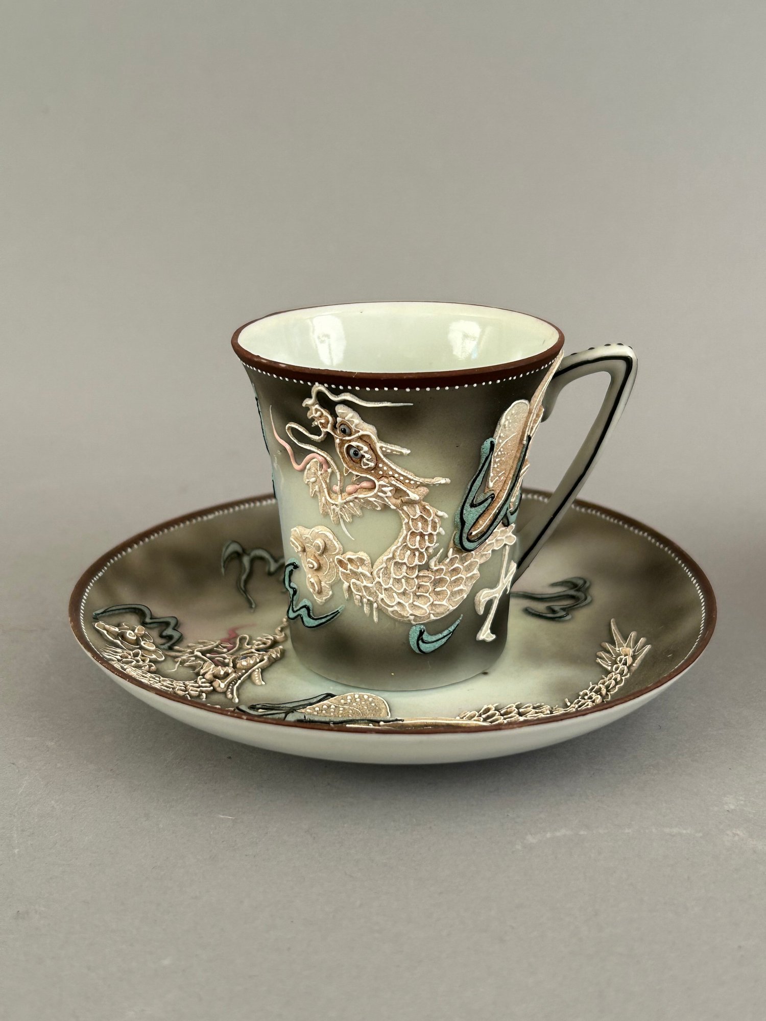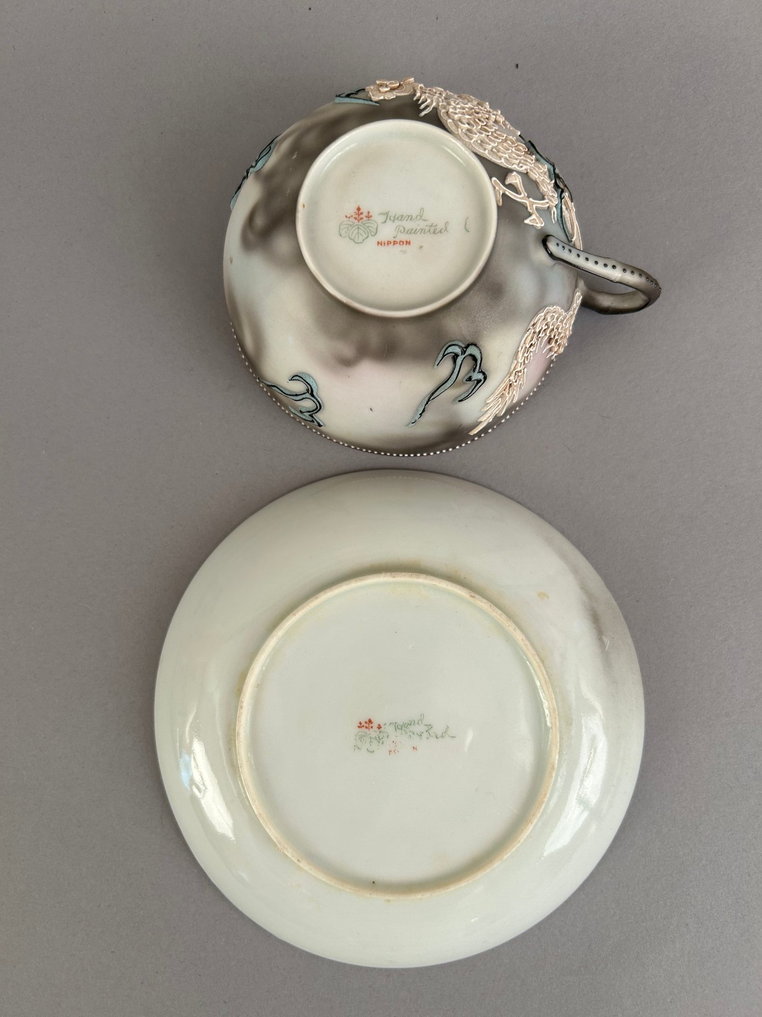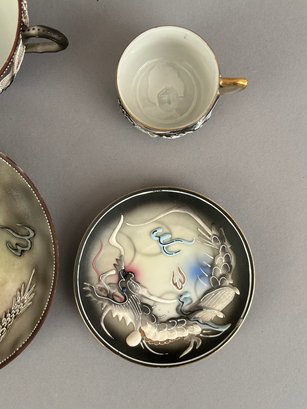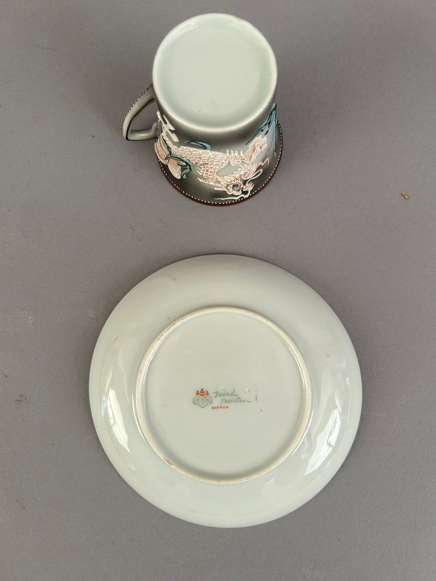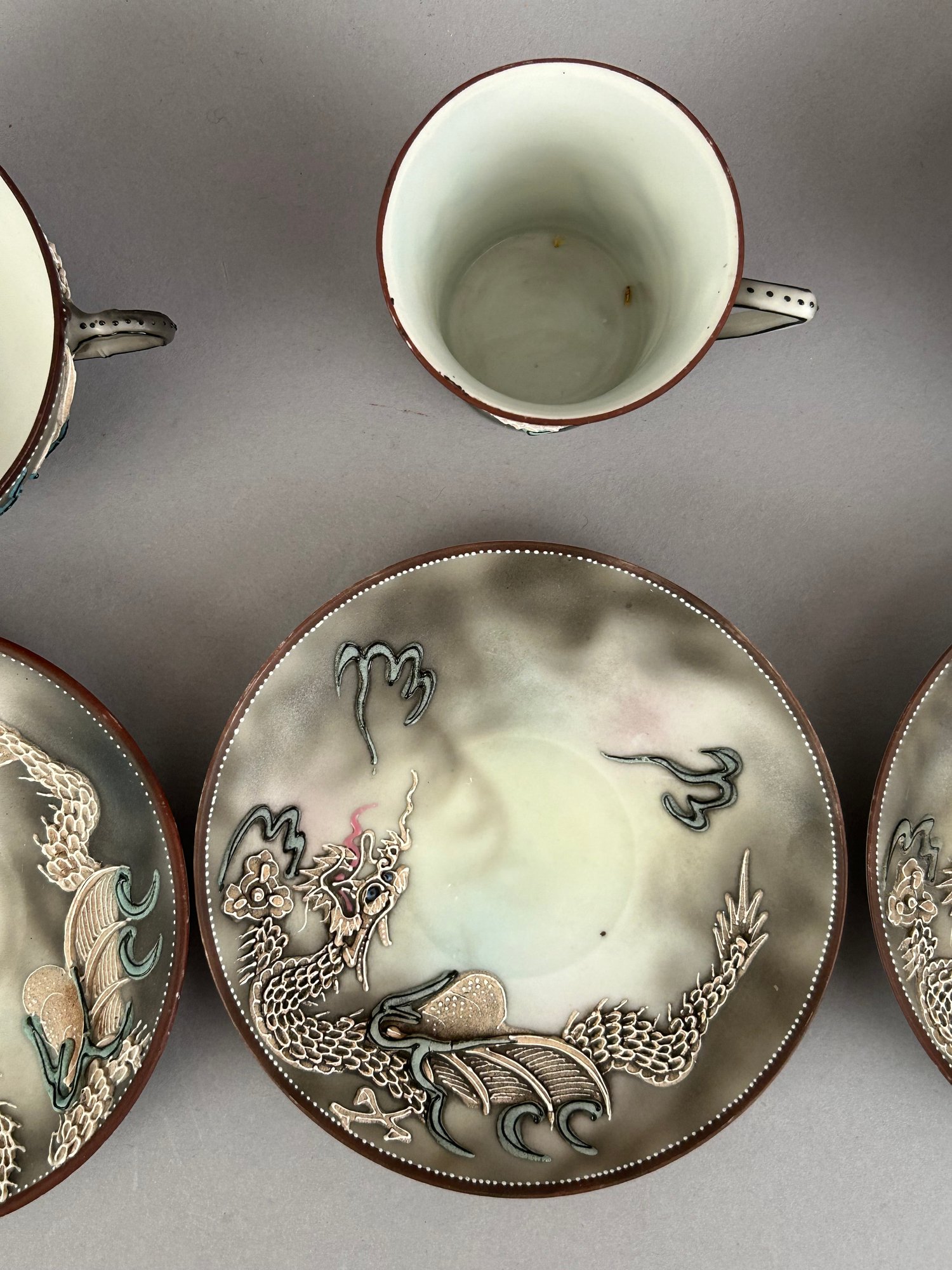 5 Moriage dragonware cups and saucers of varying shapes and sizes. Some marked Handpainted Nippon, one marked Victoria.