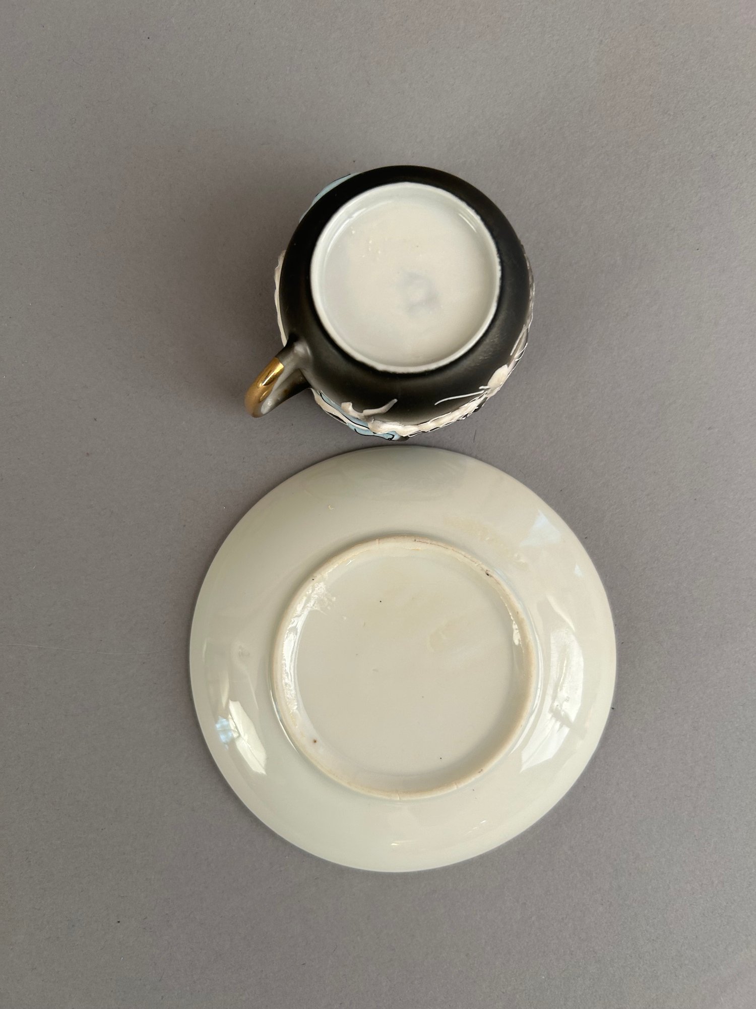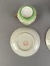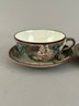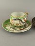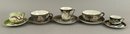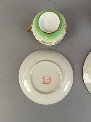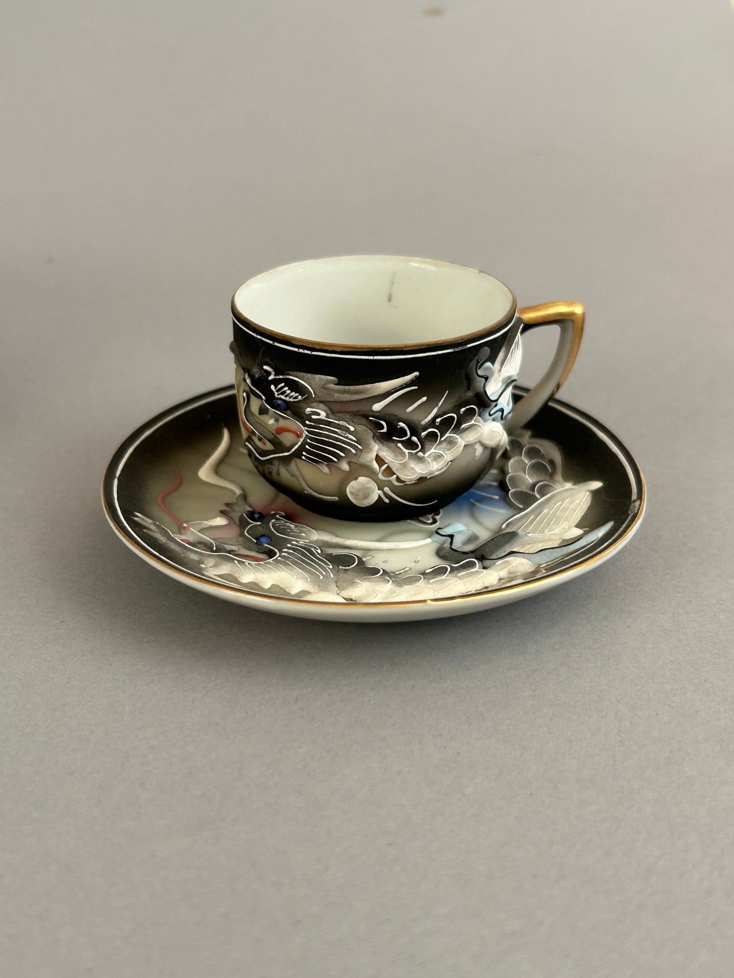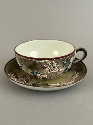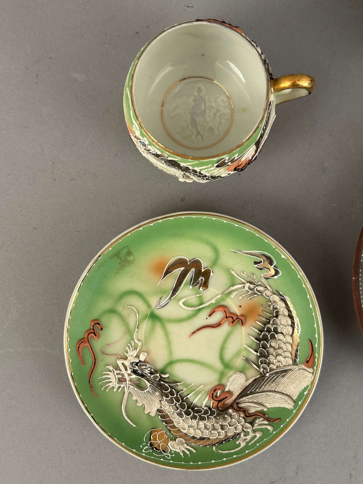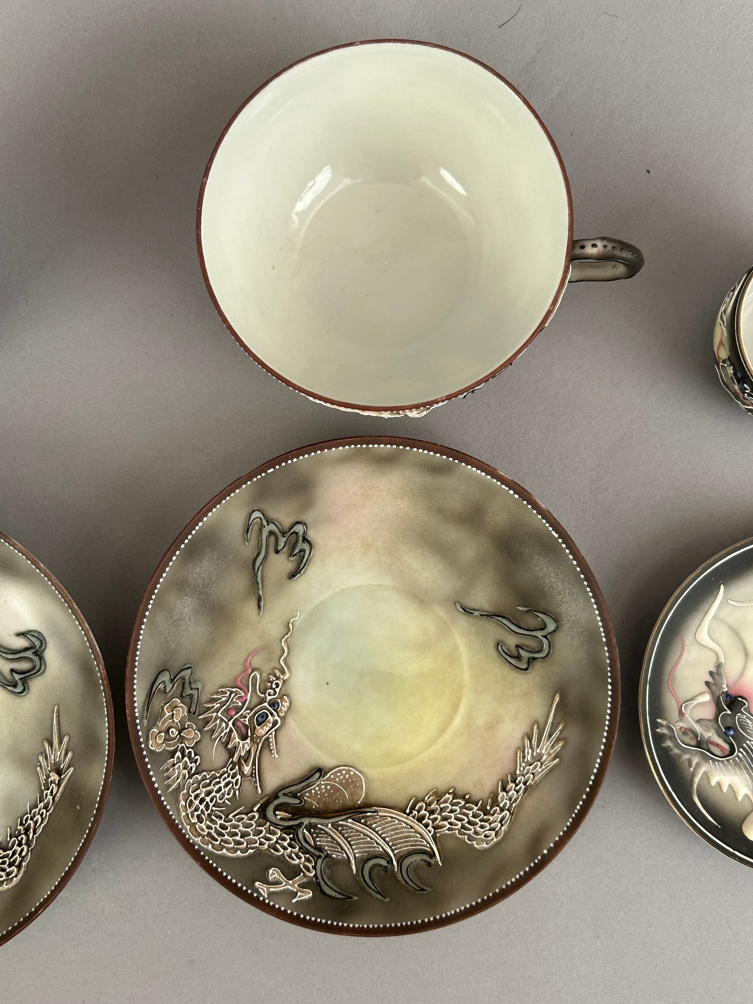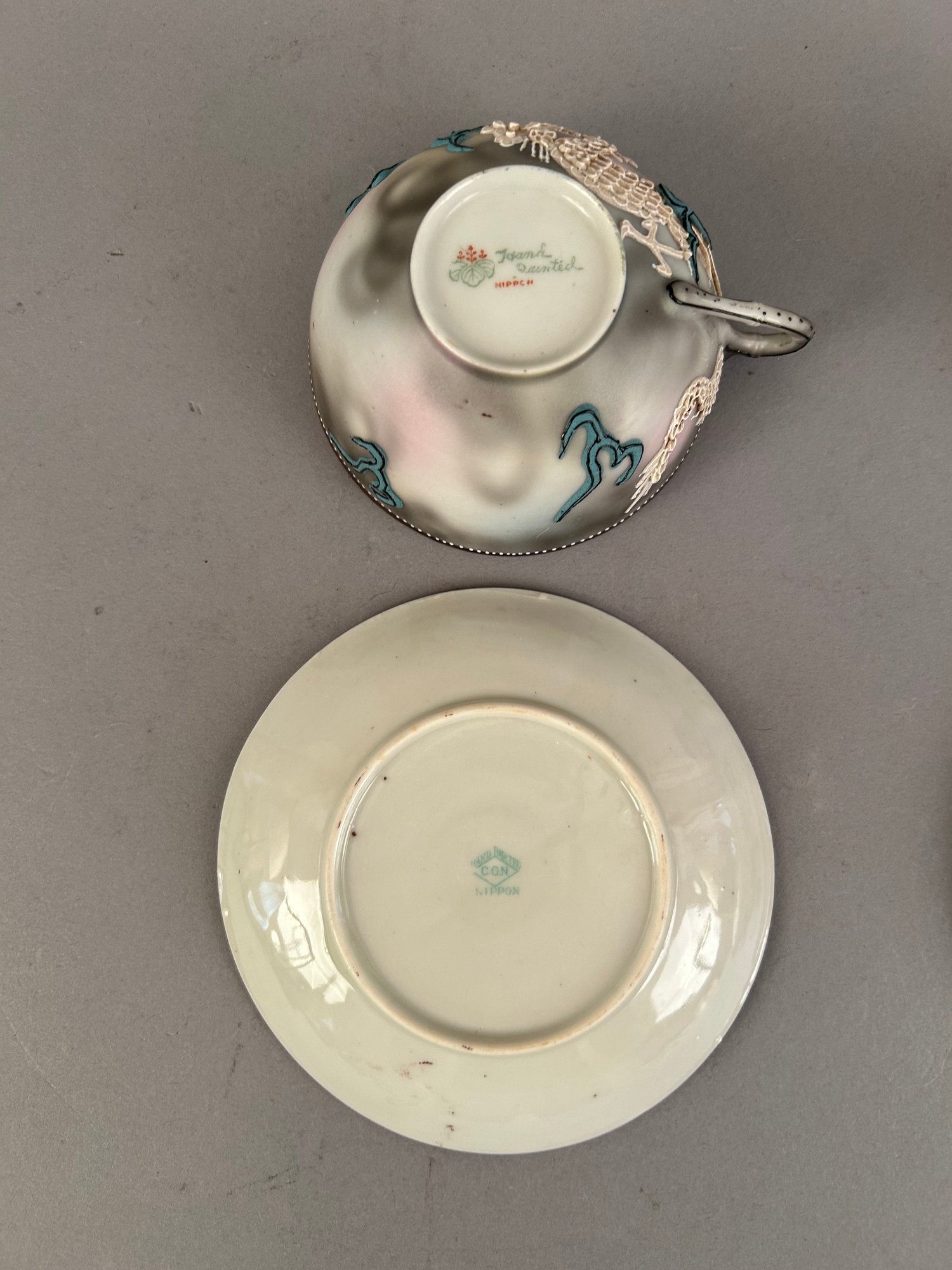 5 Moriage dragonware cups and saucers of varying shapes and sizes. Some marked Handpainted Nippon, one marked Victoria.