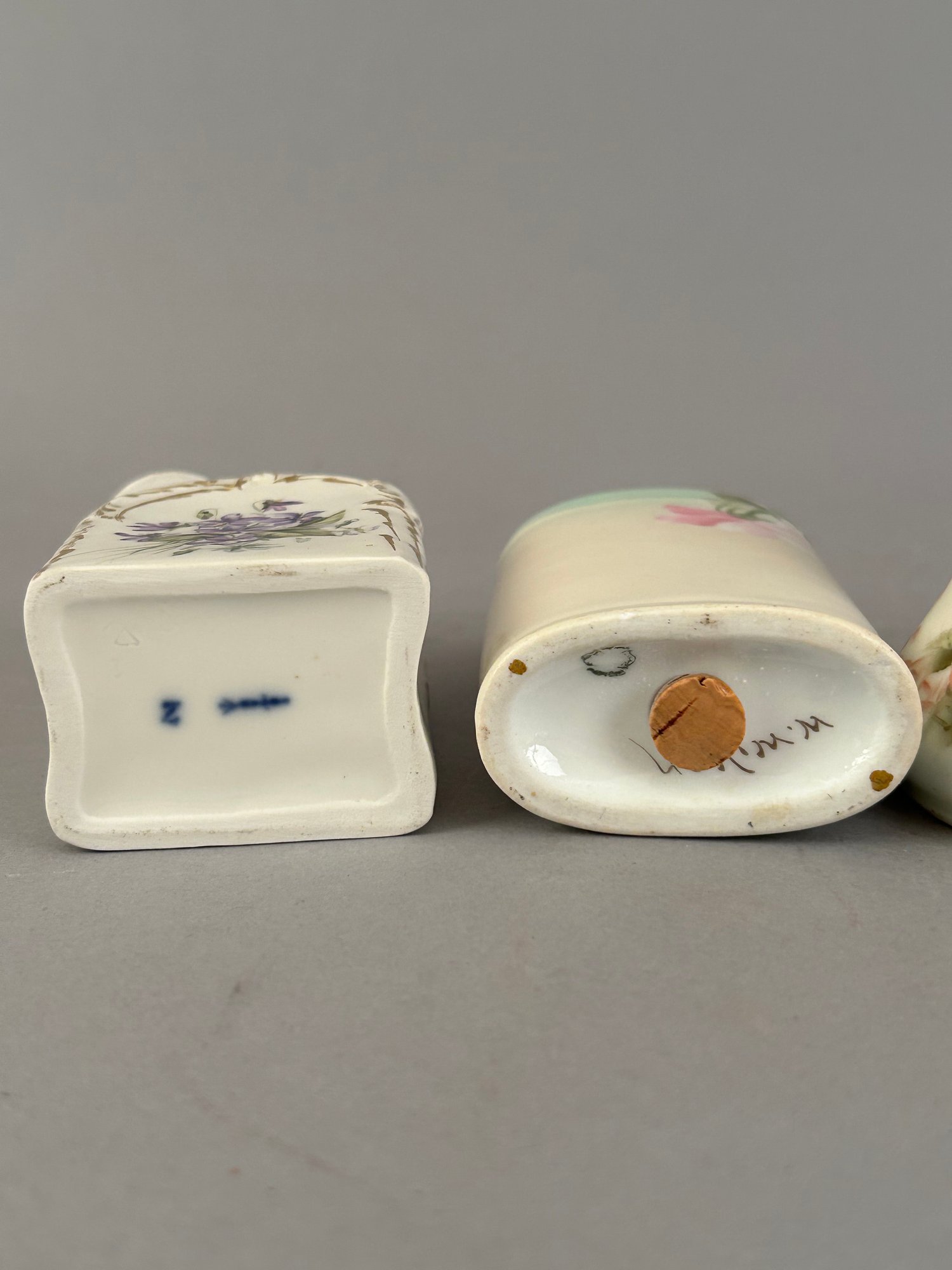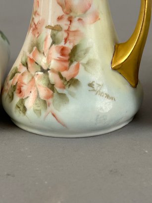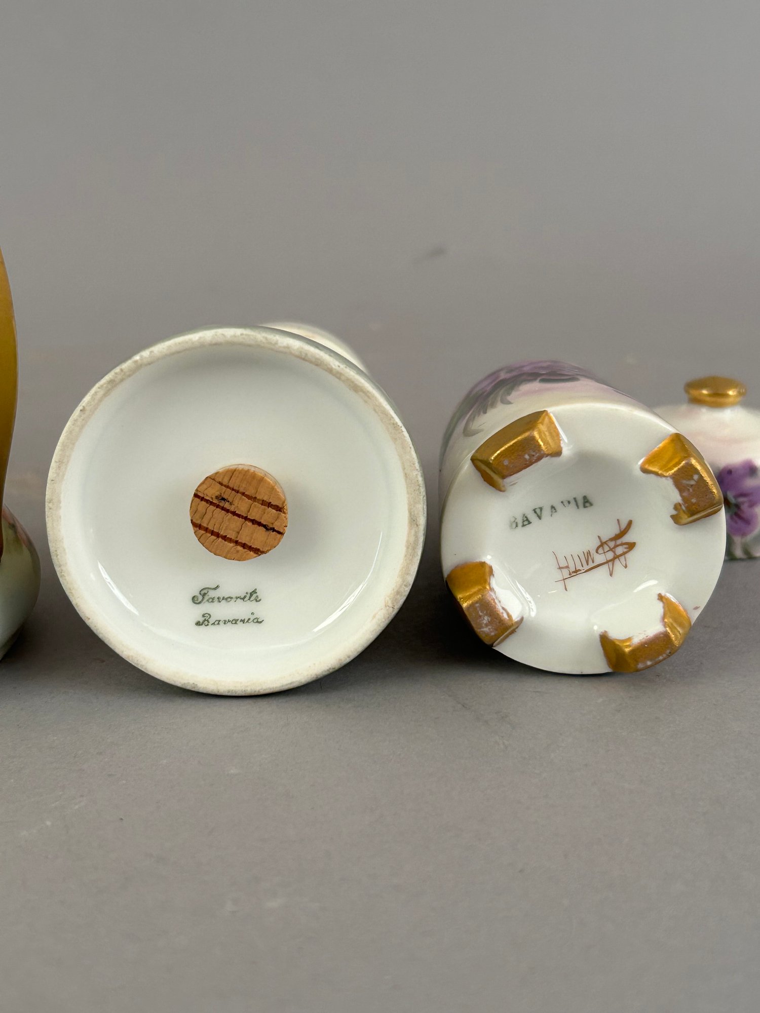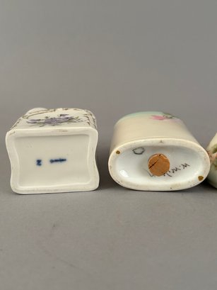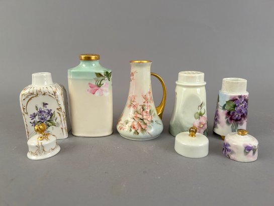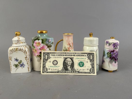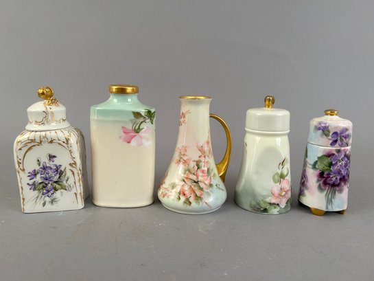 5 pieces hand painted porcelain including covered containers and shakers. Most marked on the bottom.
