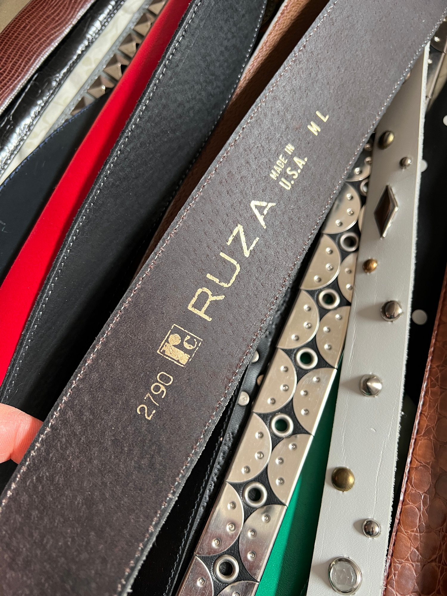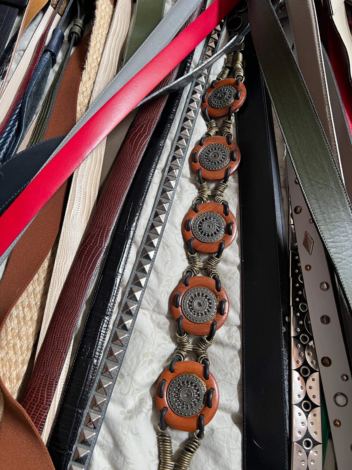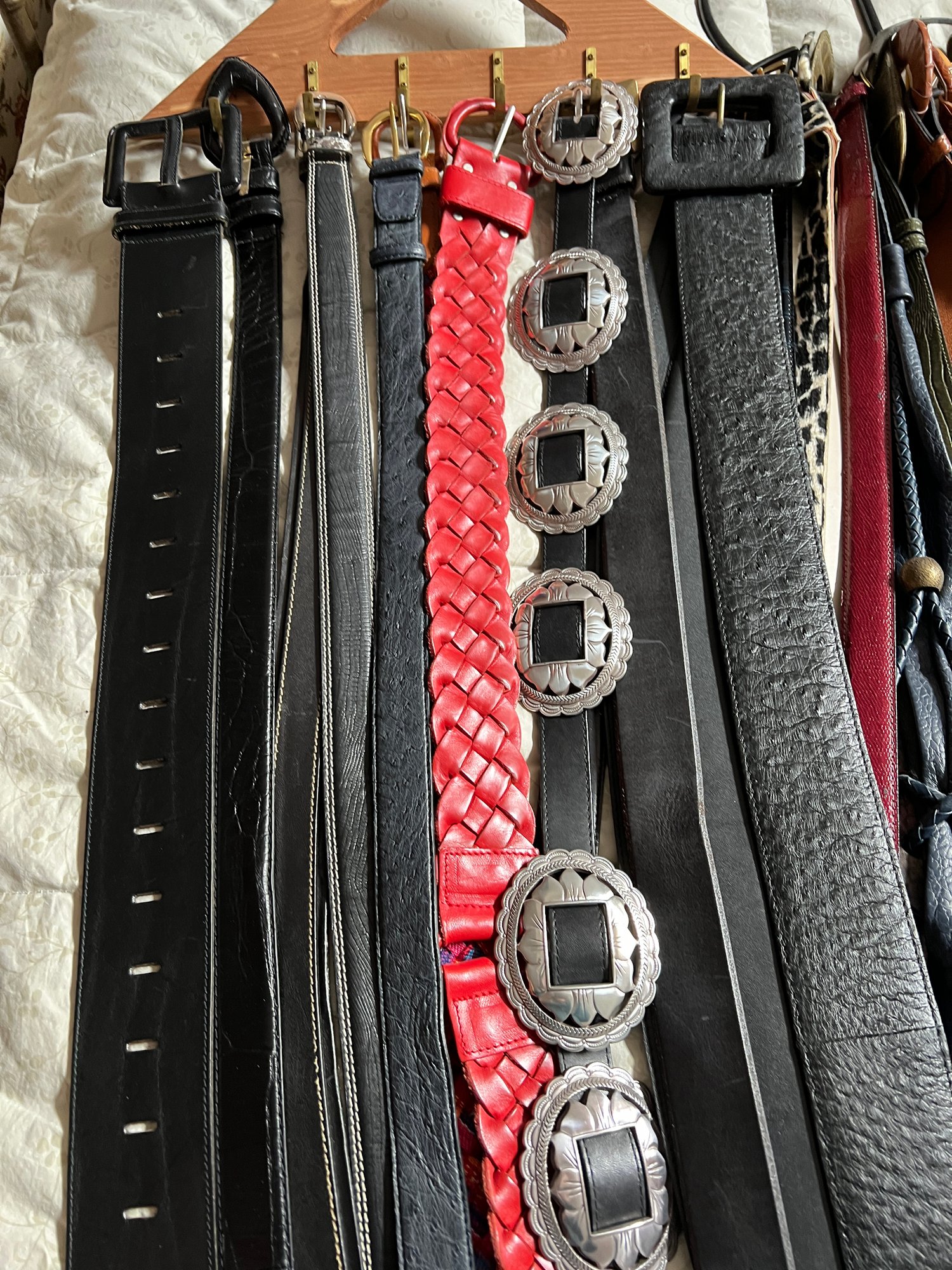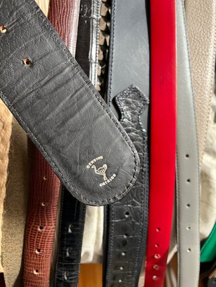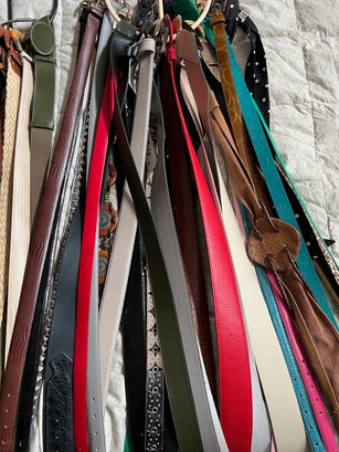 50+ belts, many leather, assorted shapes, widths and colors.